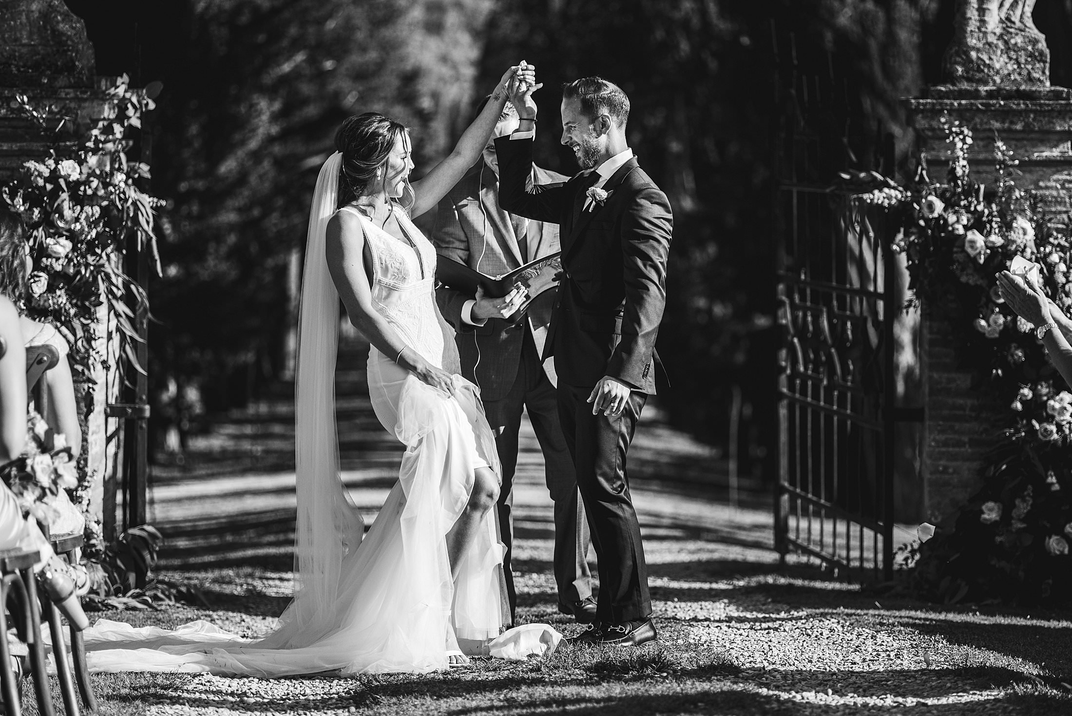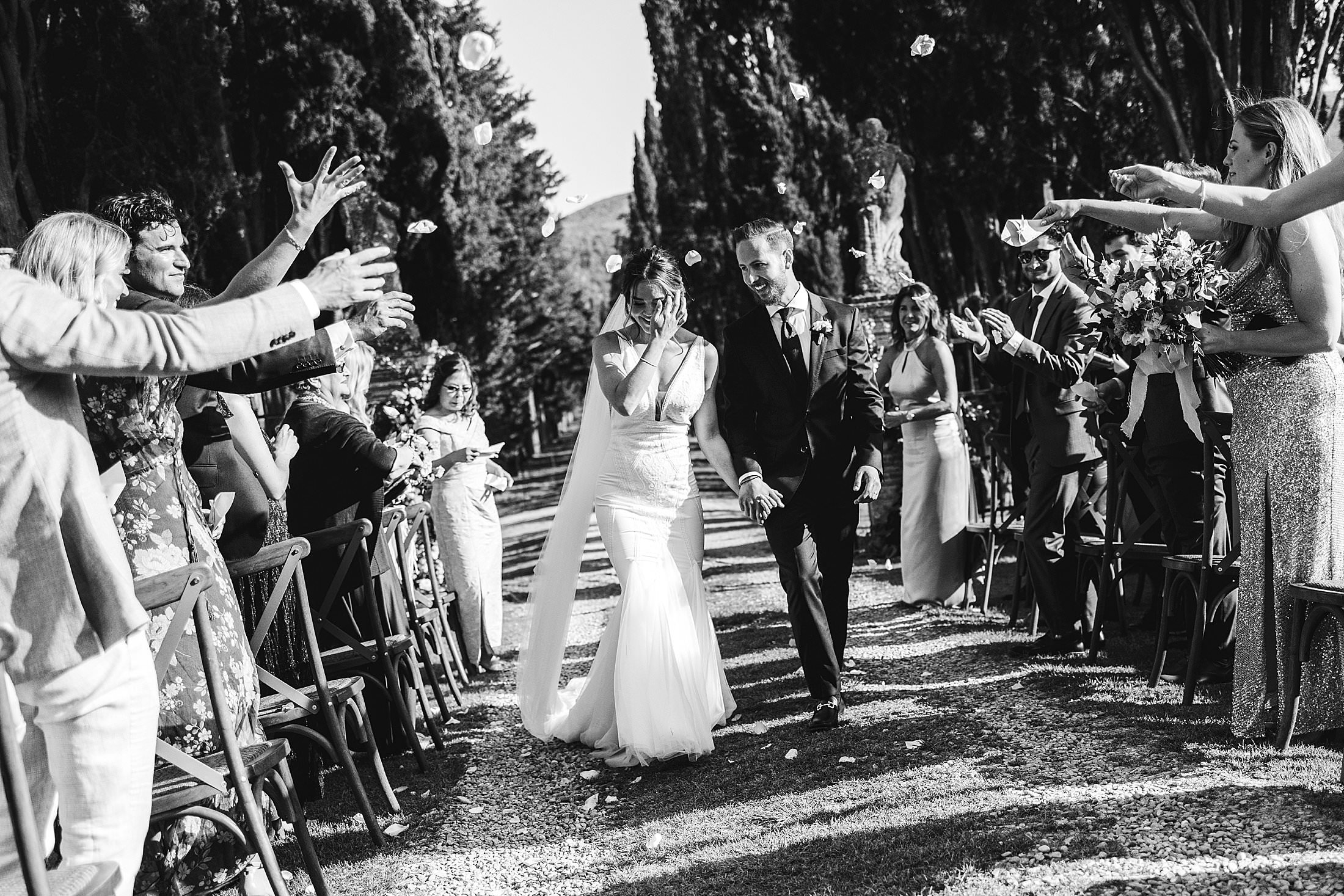 Step into a world of love and tradition as the bride and groom joyfully exit their Jewish wedding ceremony at the enchanting Stomennano venue. A moment filled with joy, symbolizing the start of their shared journey. Surrounded by the warmth of tradition and the love of family, this is the beginning of a beautiful forever. Photo by the elegant wedding photographer in Tuscany based Florence Gabriele Fani.