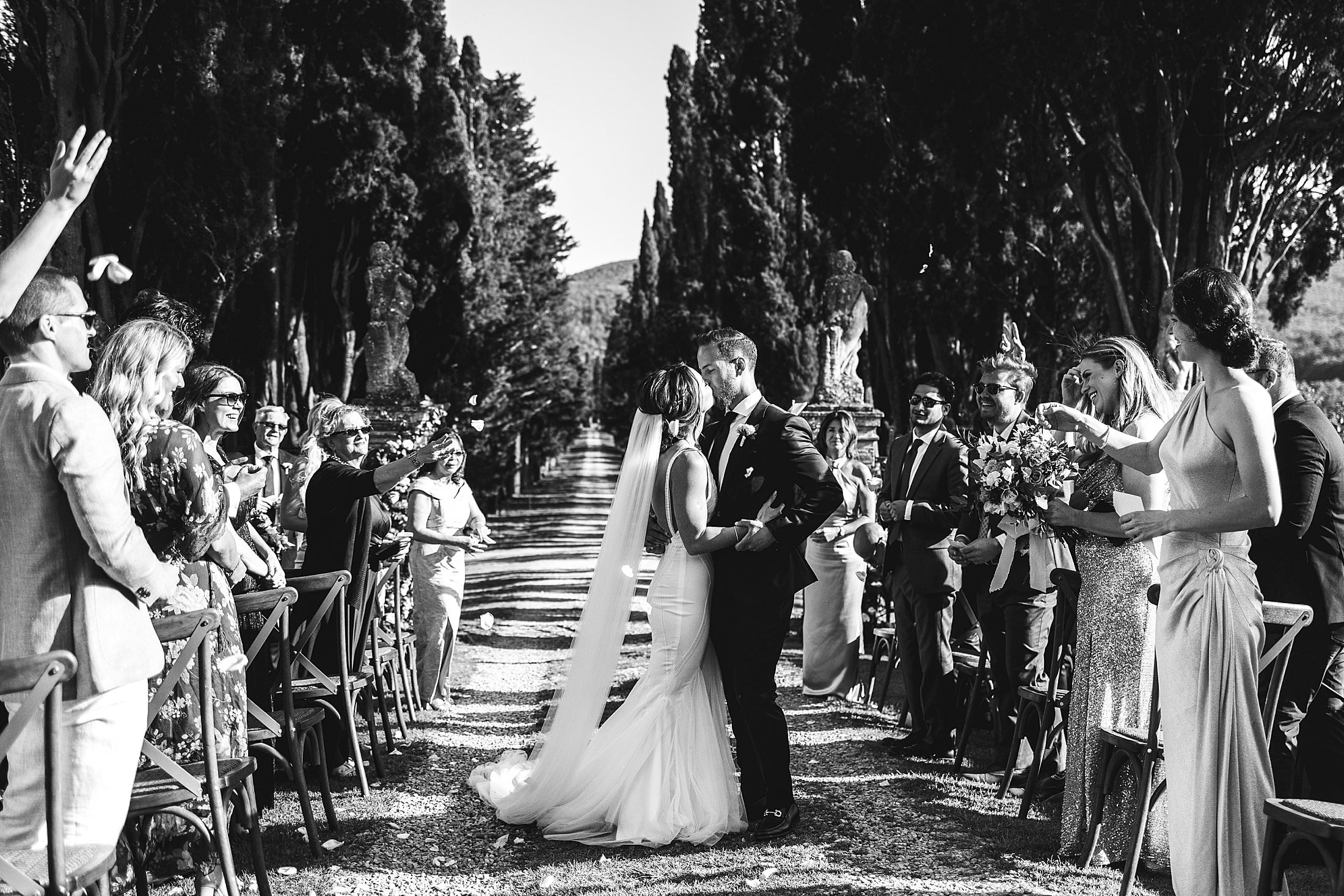 Unforgettable wedding ceremony in the picturesque view of cypress trees entrance avenue of Borgo Stomennano. Photo by the elegant wedding photographer in Tuscany based Florence Gabriele Fani.