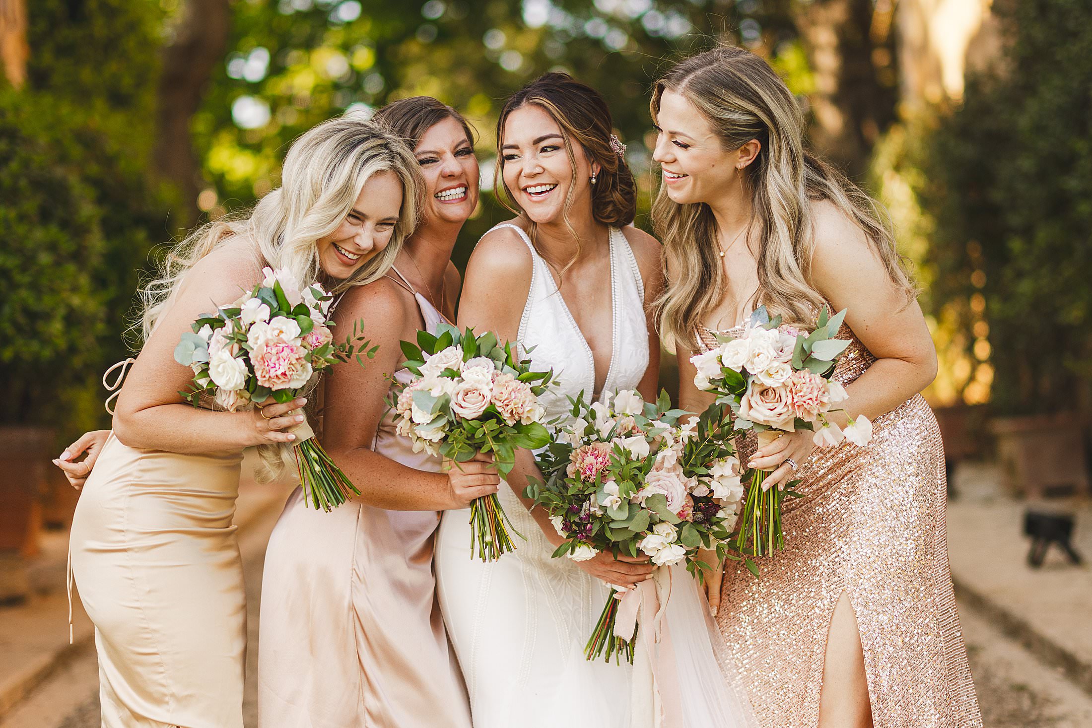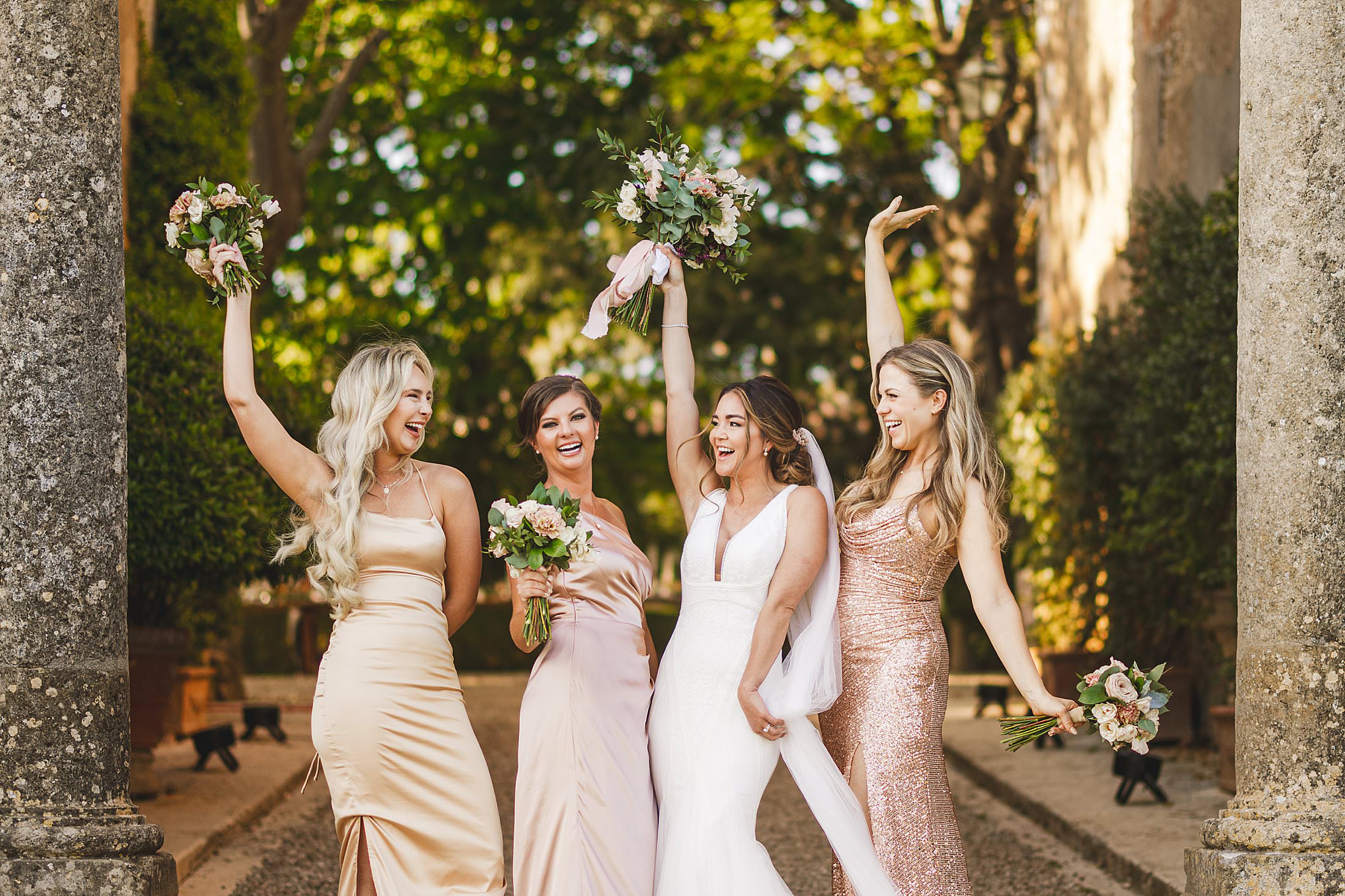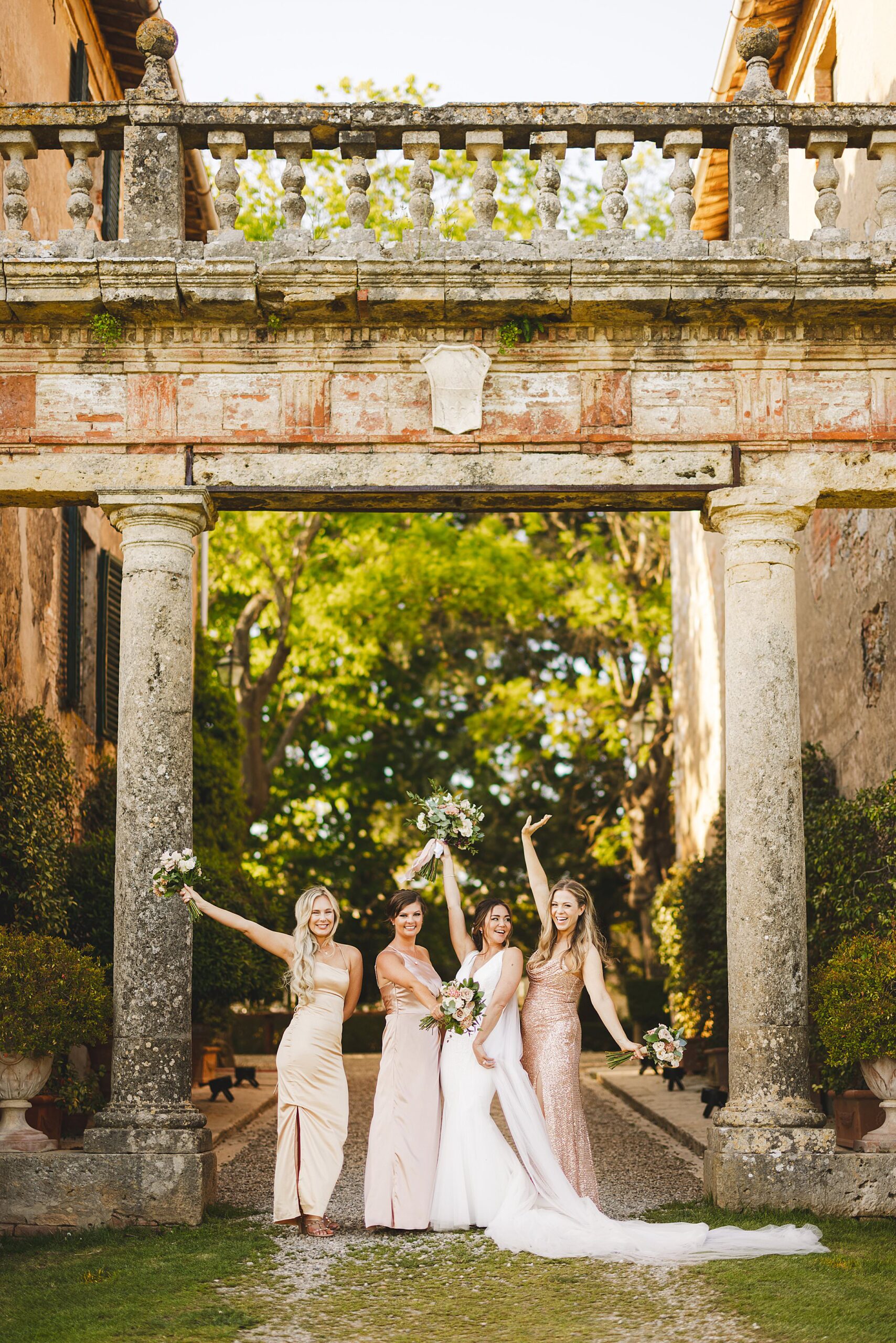 Exciting and joyful bride and bridesmaids candid photo at gorgeous Borgo Stomennano destination wedding. Photo by the elegant wedding photographer in Tuscany based Florence Gabriele Fani.
