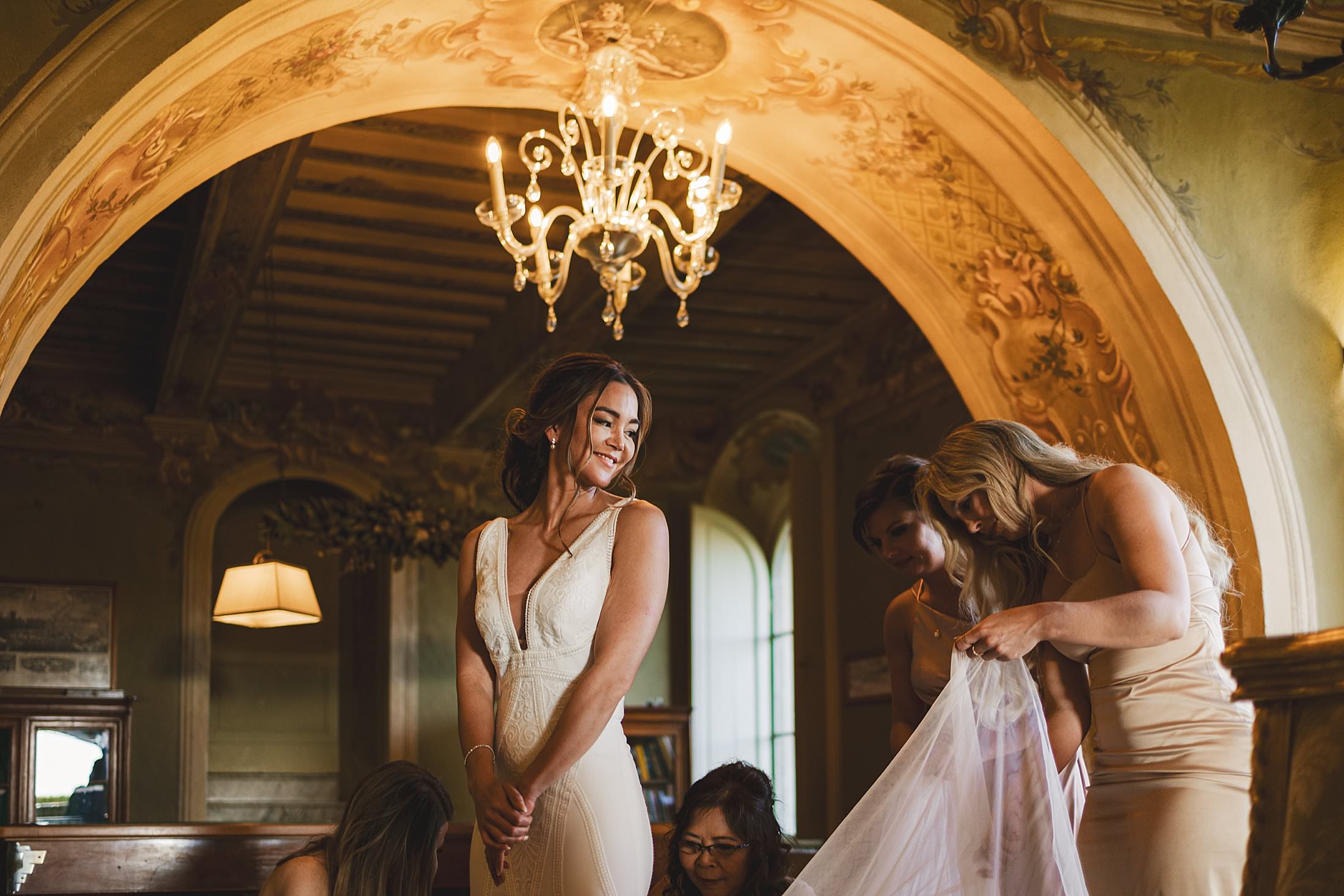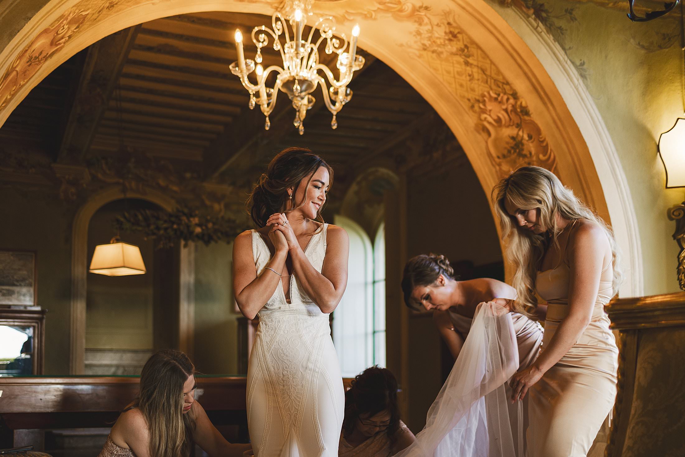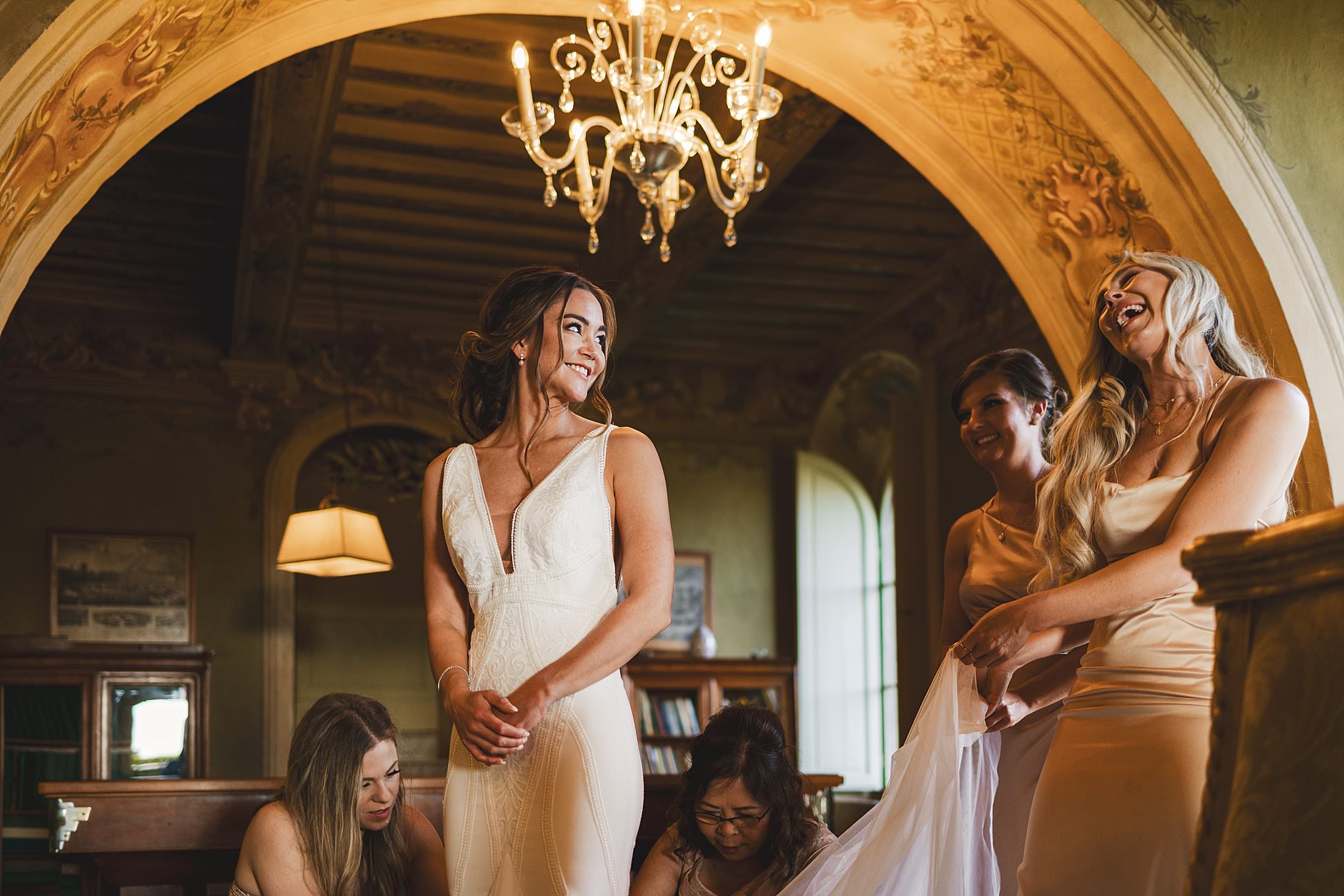 Elegant bride wedding photo with bridesmaids while adjusting gown in one of the most beautiful historical room of Borgo Stomennano. Photo by the elegant wedding photographer in Tuscany based Florence Gabriele Fani.