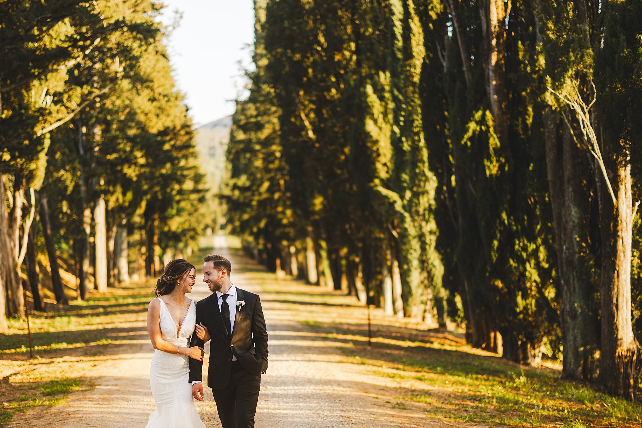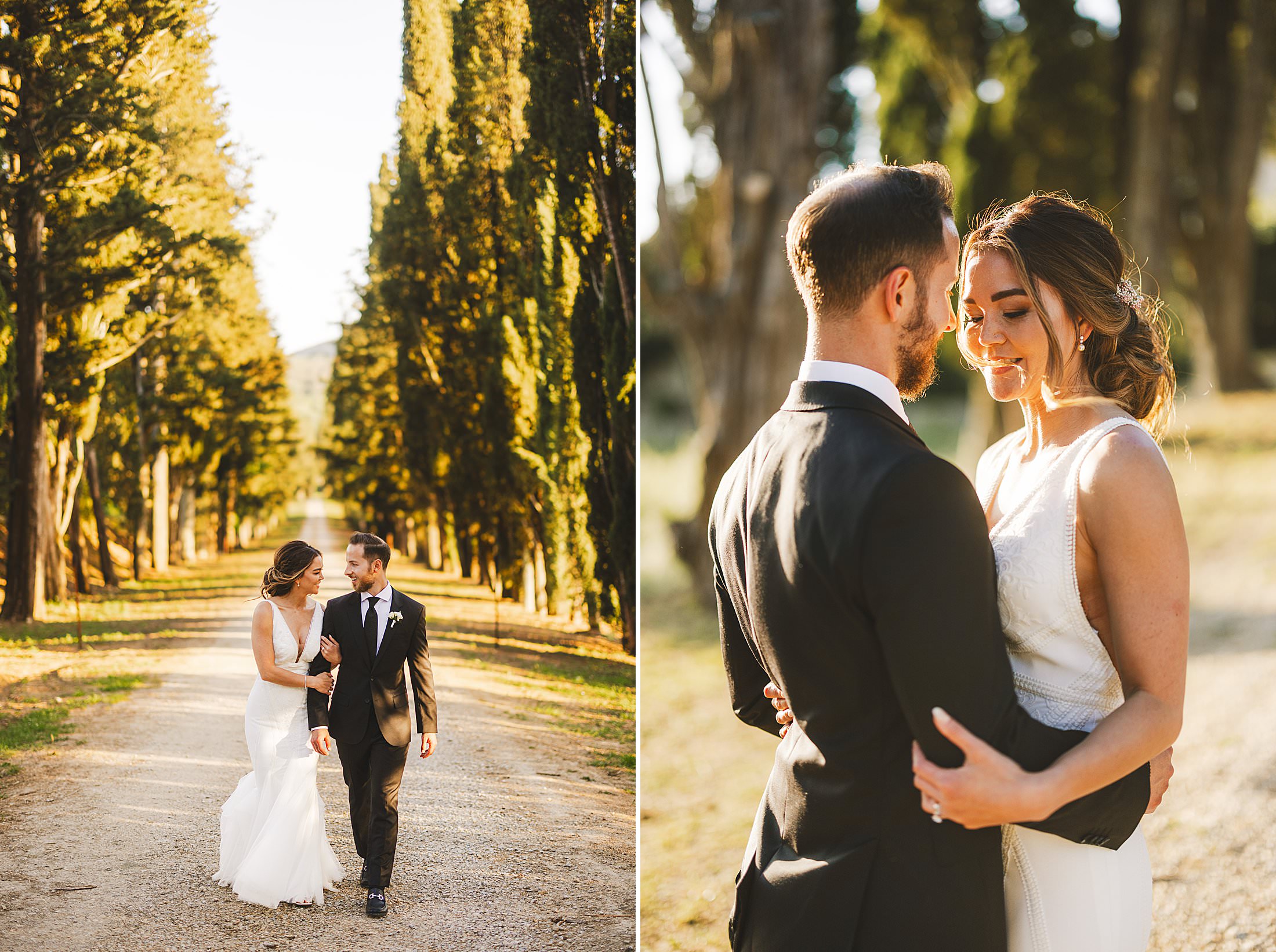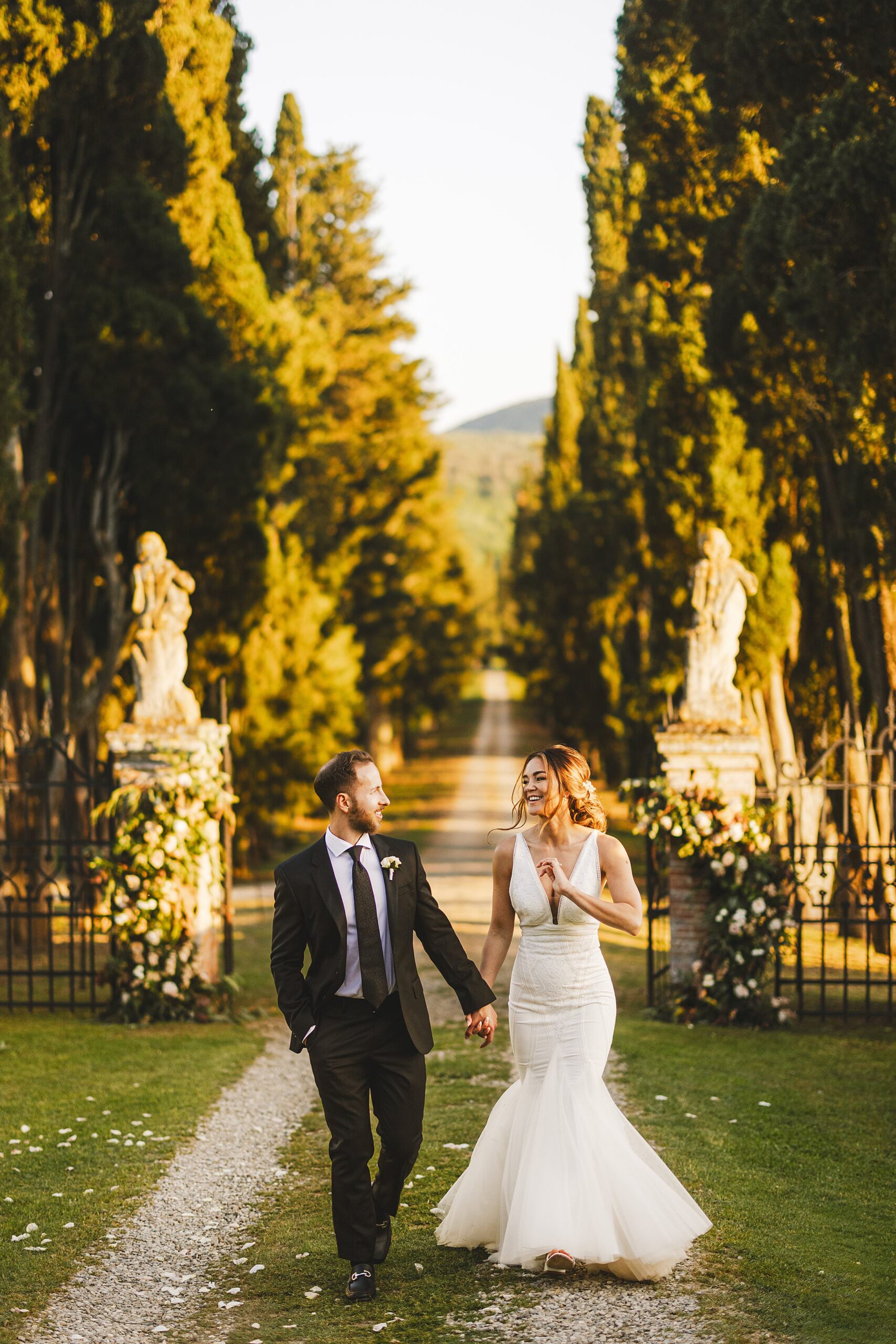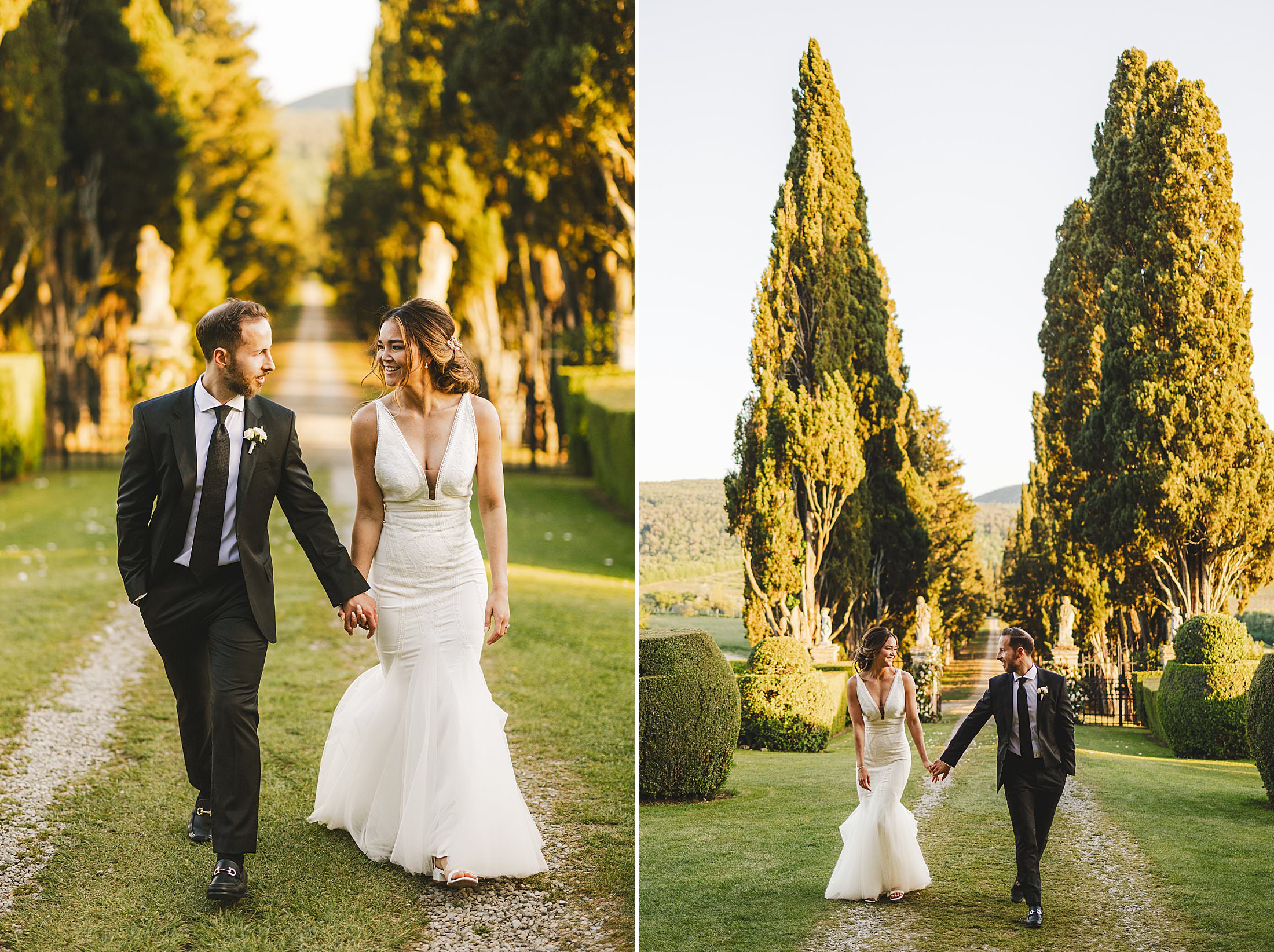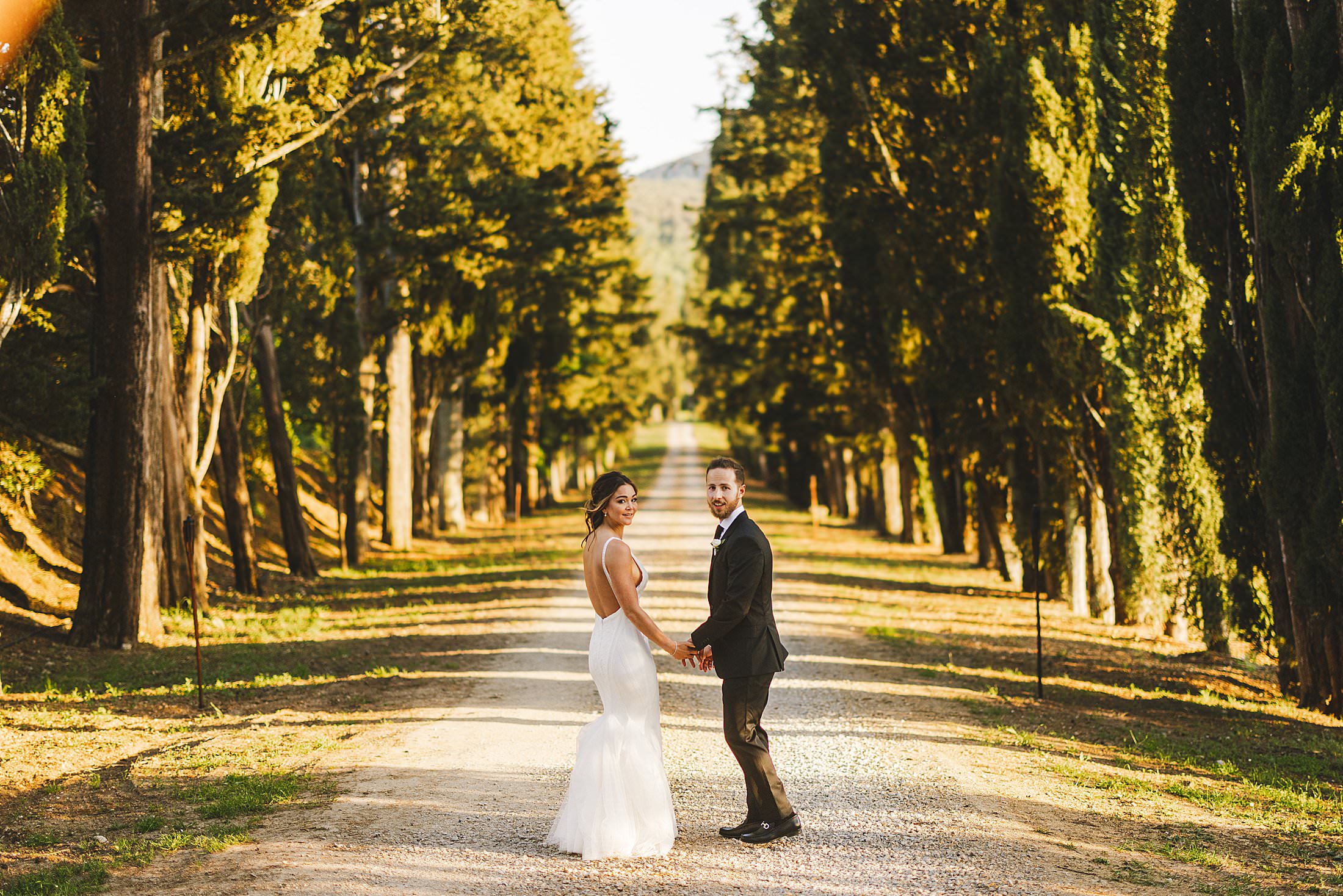 Karla and Andrew’s special wedding day in the breathtaking Borgo Stomennano cypresses entrance avenue. Photo by the elegant wedding photographer in Tuscany based Florence Gabriele Fani.