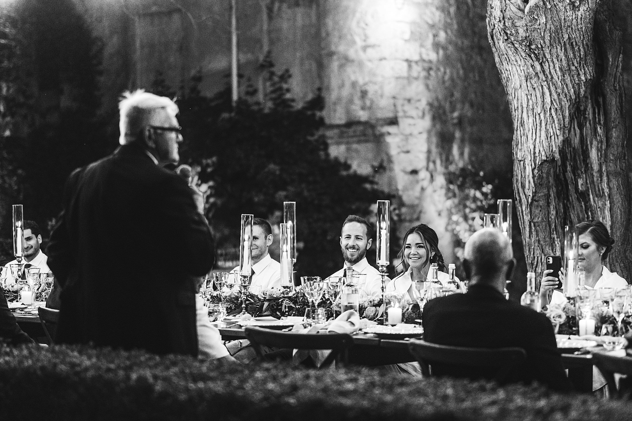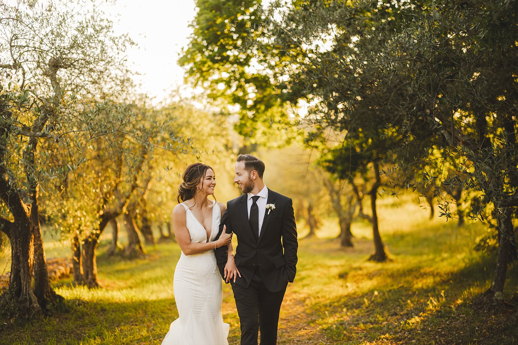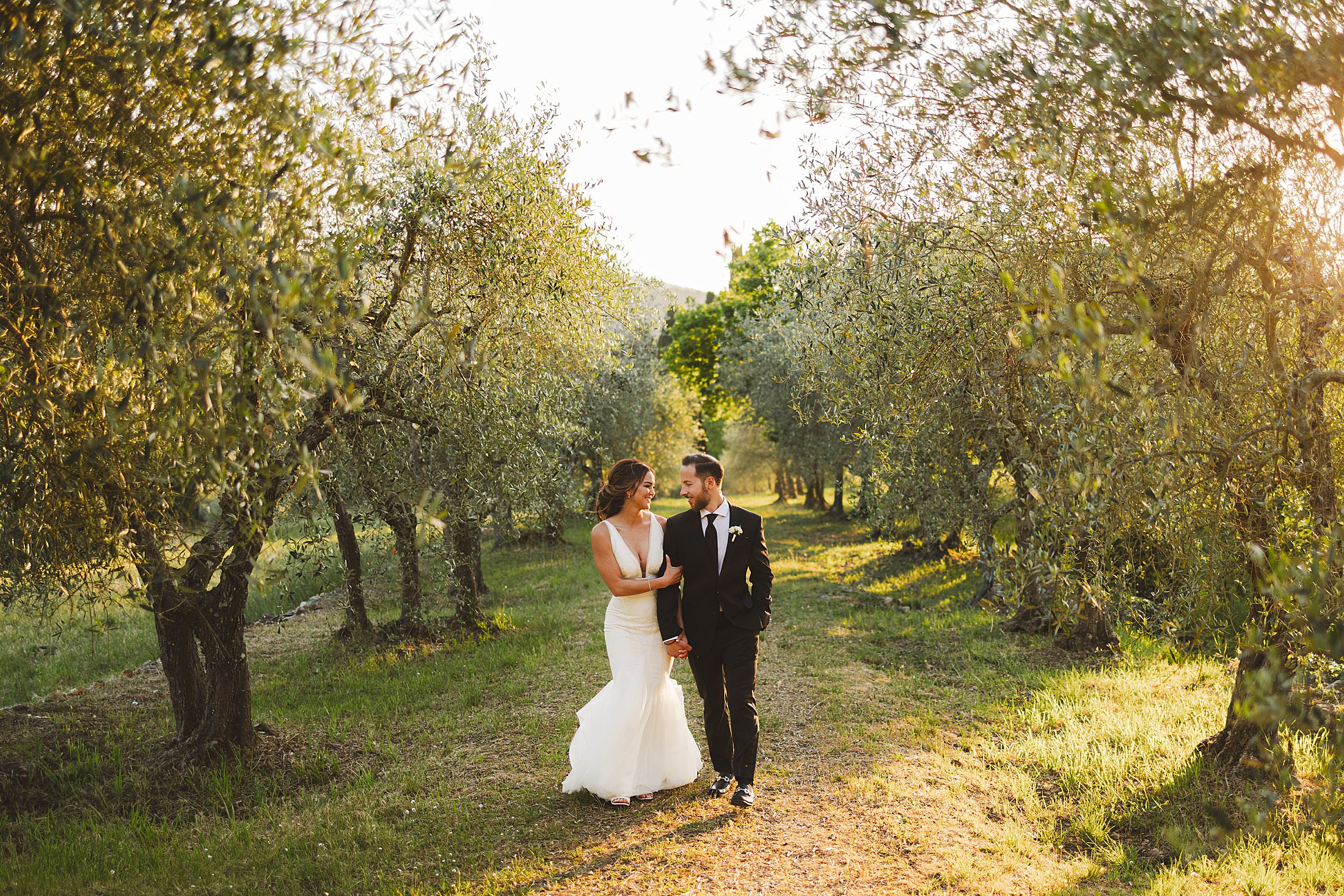 As the celebrations continued, the venue itself became a canvas for capturing the couple’s love story. In the rustic-chic beauty of this Borgo Stomennano wedding, the romantic photoshoot unfolded. Strolling hand in hand, they shared unforgettable instants with their family and friends and explored the enchanting olive groves before indulging in the elegant dinner reception.