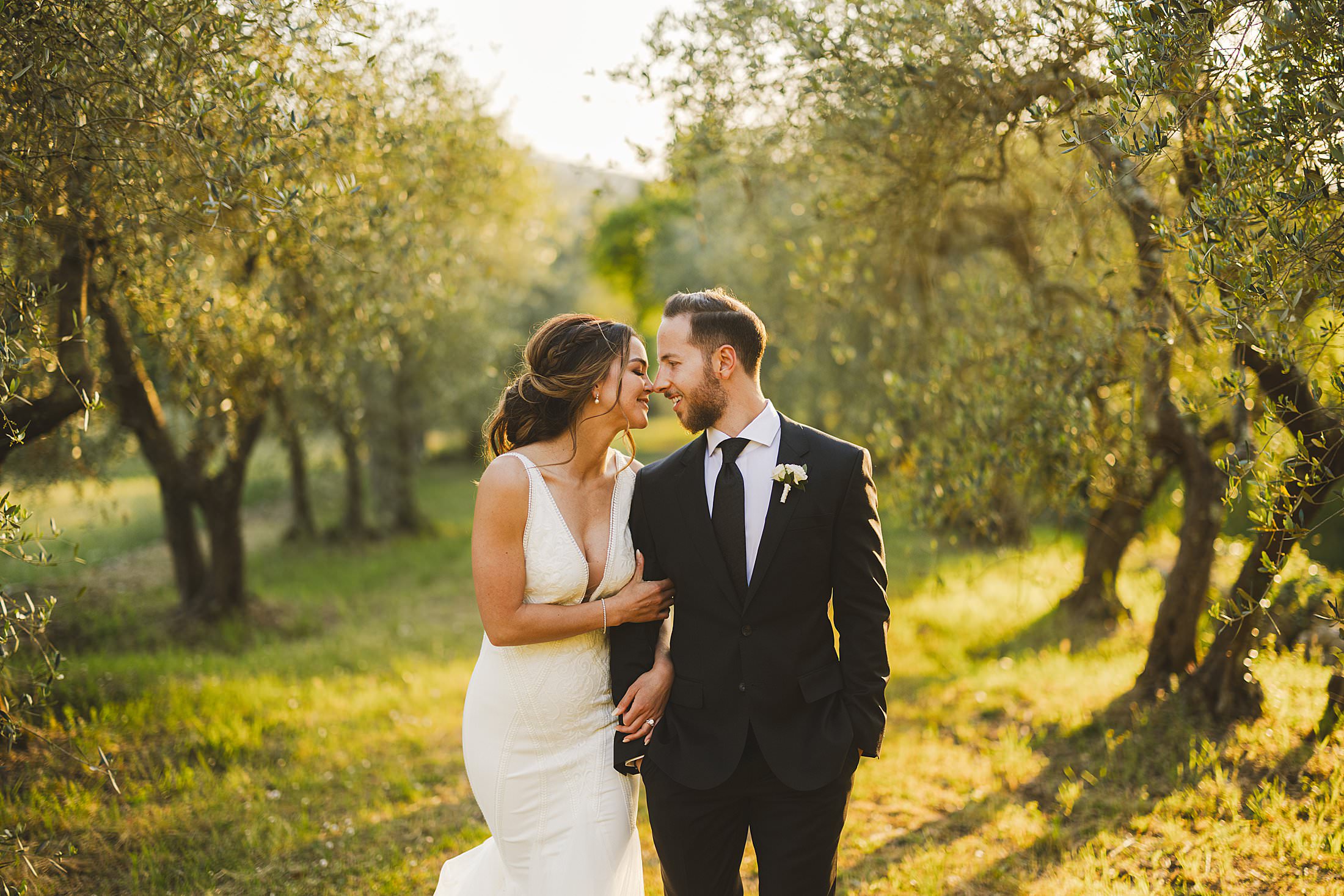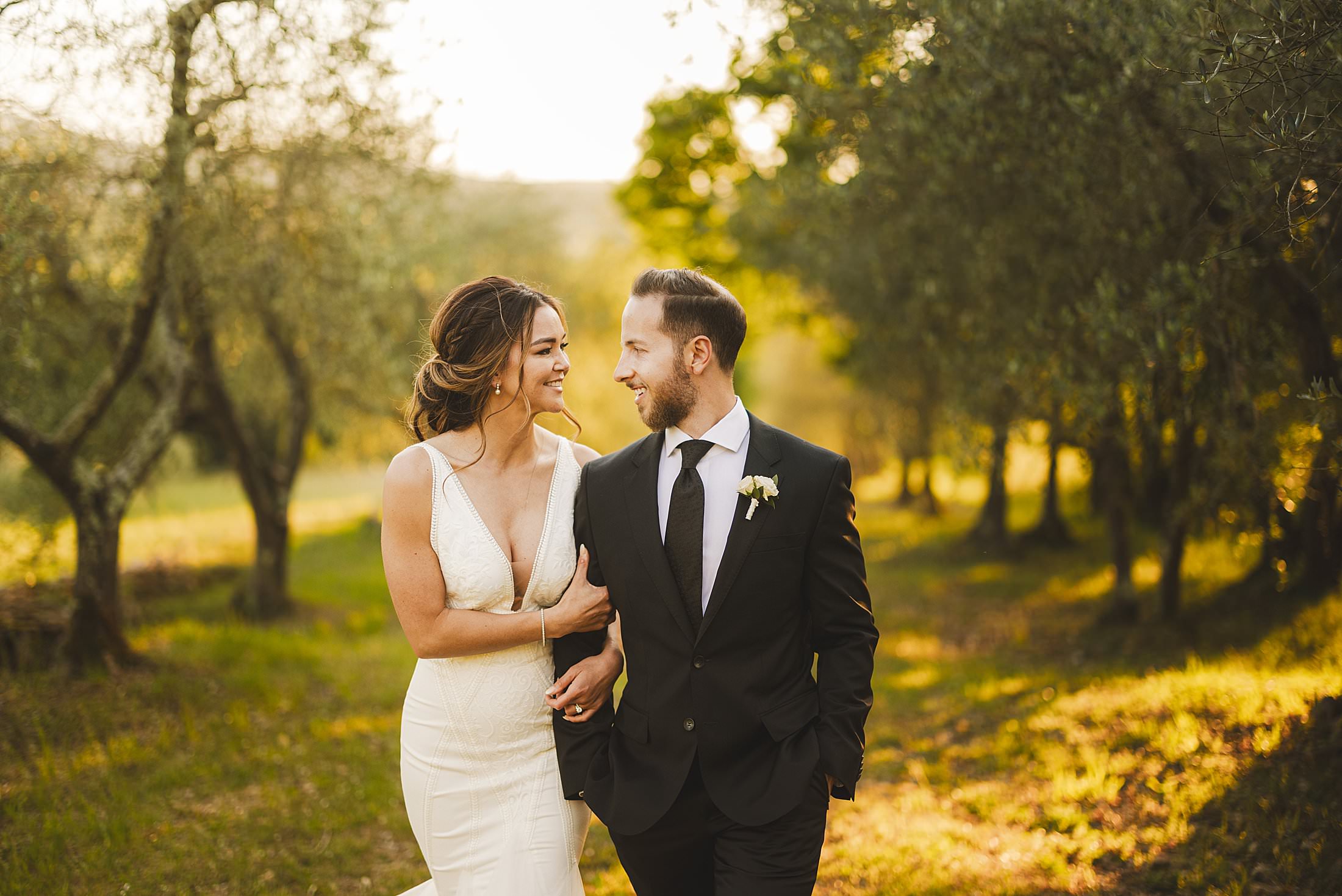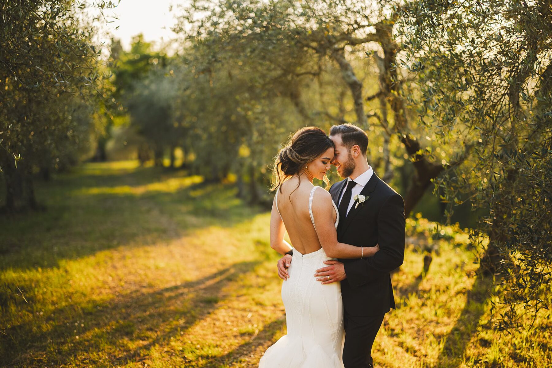 Capturing timeless romance in the golden hour, this classic portrait features the bride and groom amid the enchanting olive groves of Borgo Stomennano venue. A dreamy moment in a setting of unparalleled beauty, this photo encapsulates the essence of love and sophistication. Photo by the elegant wedding photographer in Tuscany based Florence Gabriele Fani.