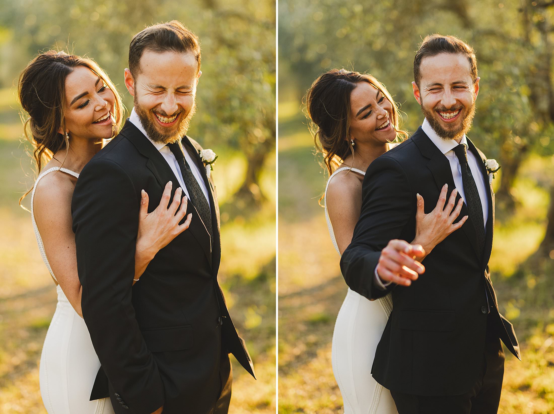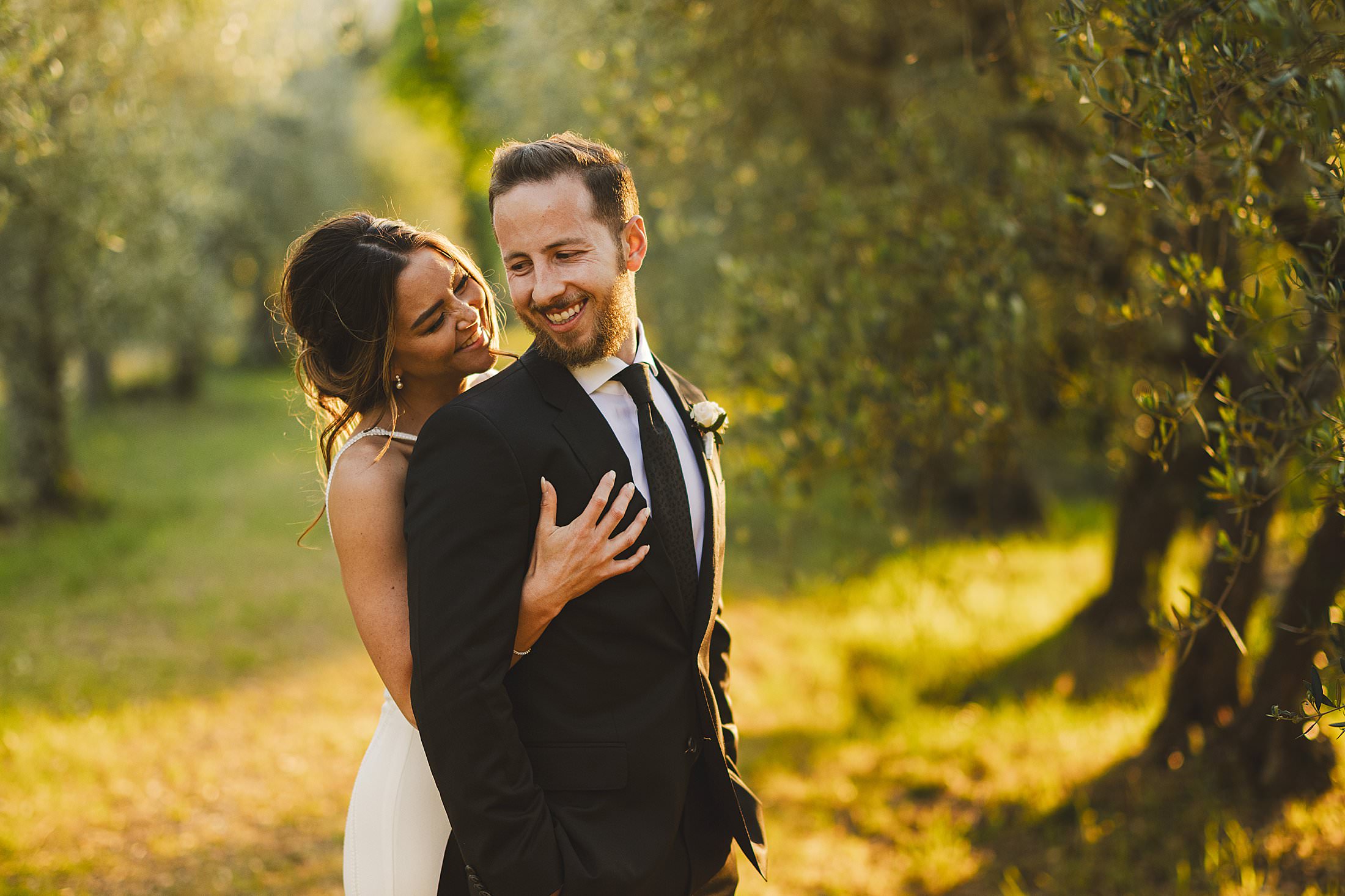 Spontaneous bride and groom wedding photo at Borgo Stomennano during golden hour. Photo by the elegant wedding photographer in Tuscany based Florence Gabriele Fani.