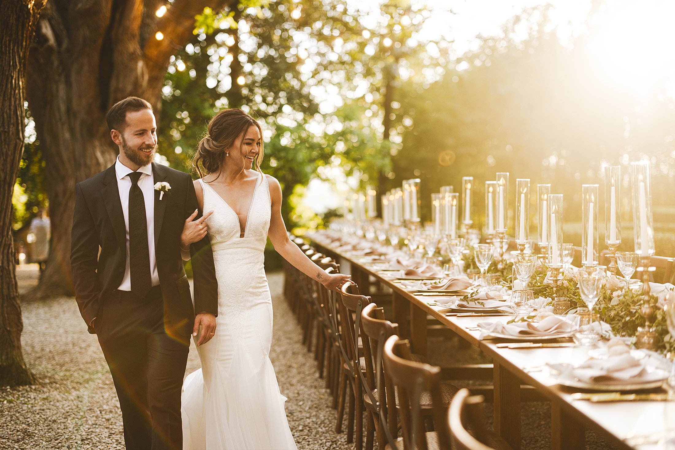 Explore the elegance of the bride and groom as they gracefully walk alongside their beautifully adorned imperial dinner table during the golden hour. A romantic photoshoot that encapsulates the enchanting ambiance and sophisticated charm of this unforgettable moment. Photo by the elegant wedding photographer in Tuscany based Florence Gabriele Fani.