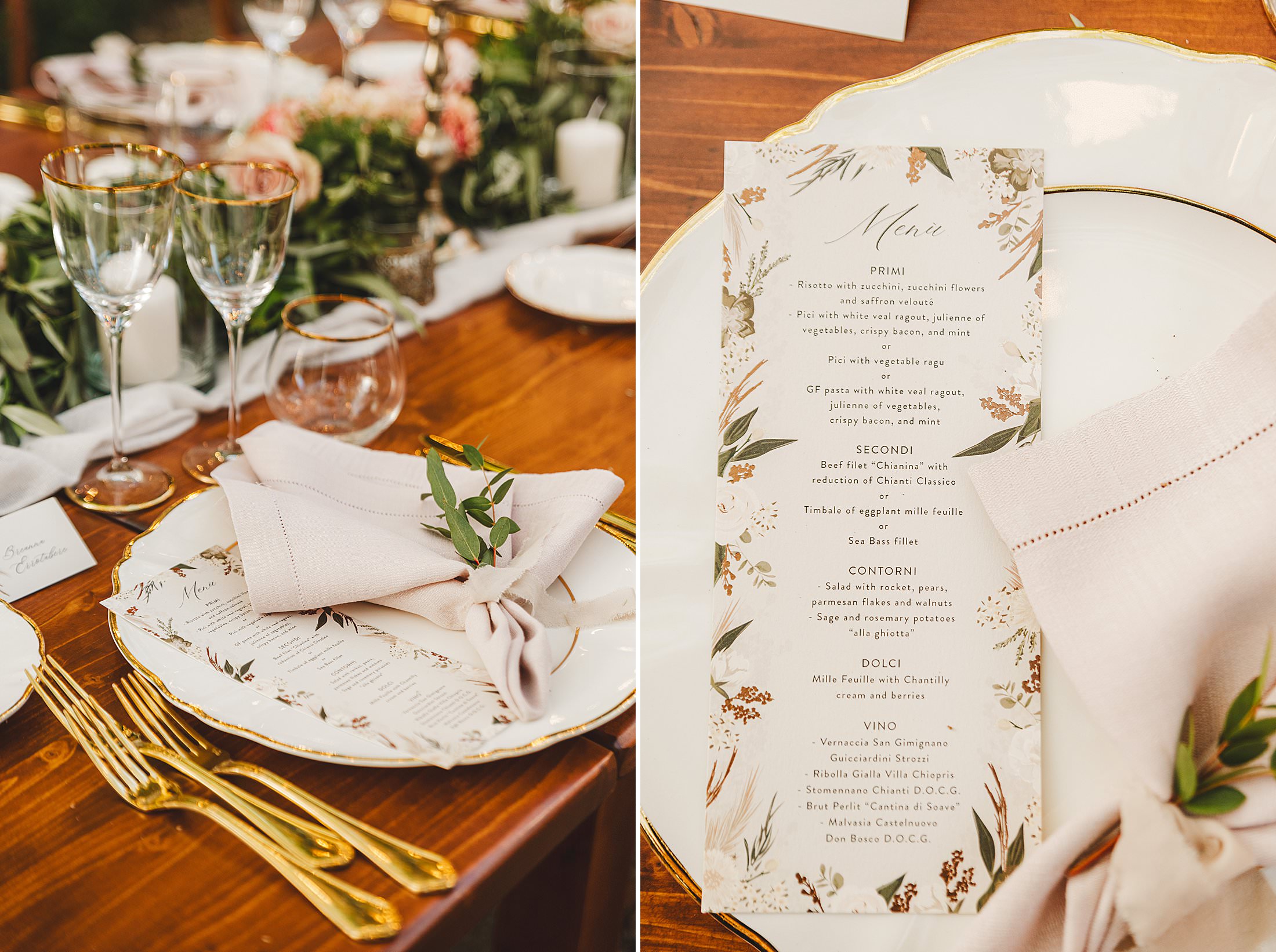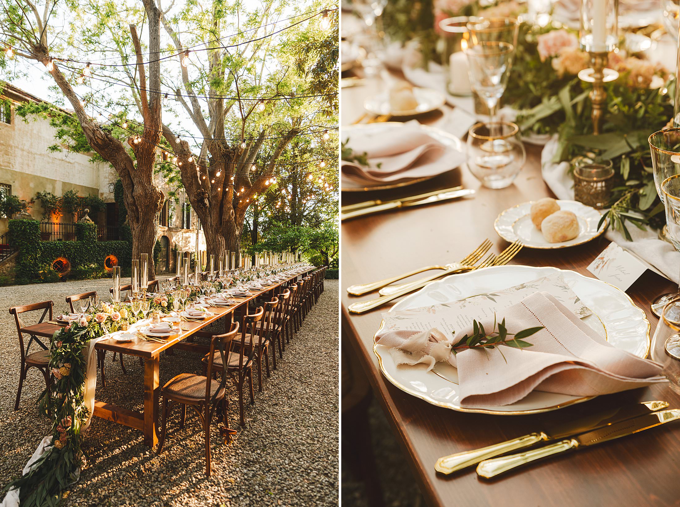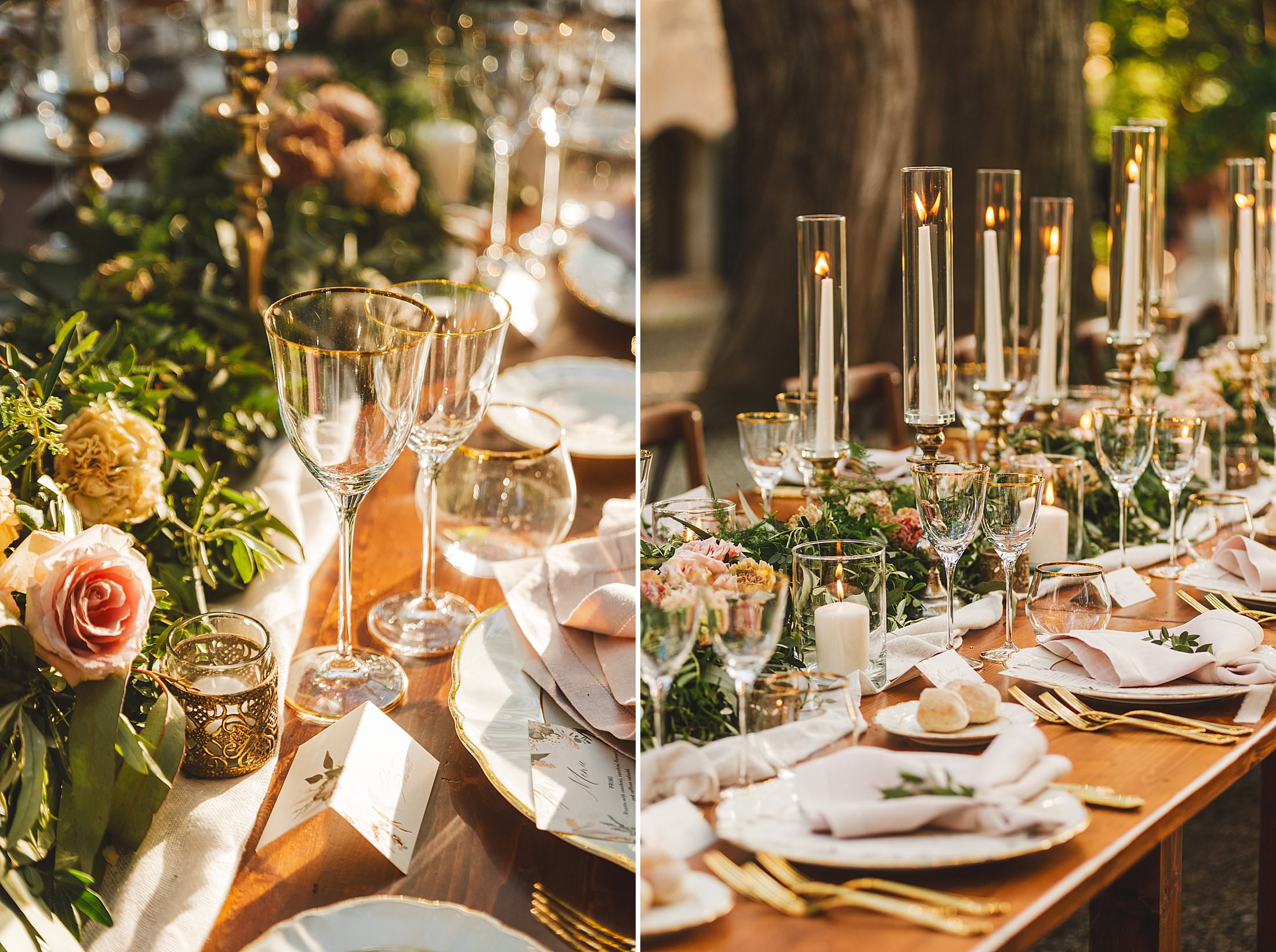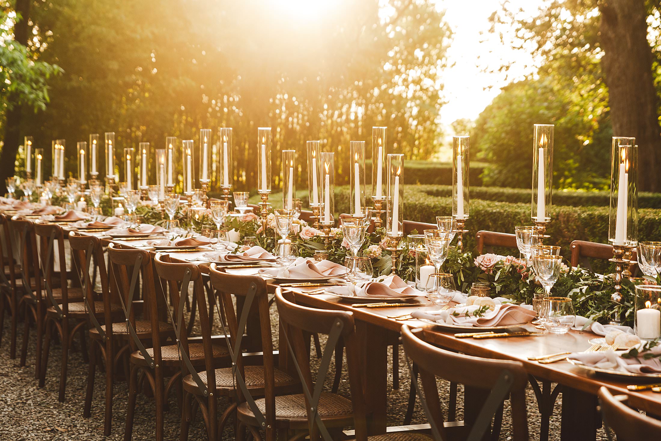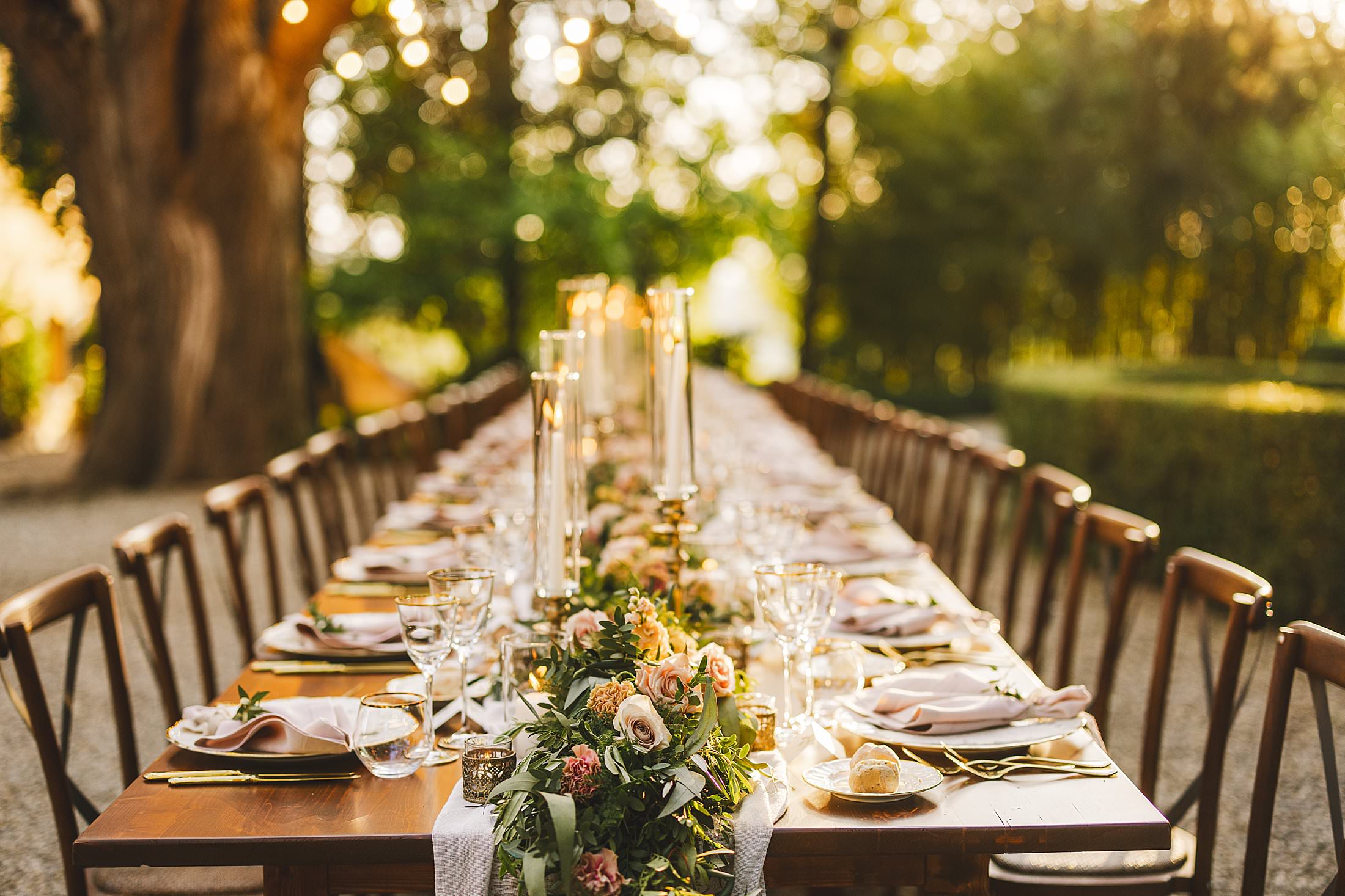 Elegant imperial table dinner reception flower decor at Borgo Stomennano during golden hour. Photo by the elegant wedding photographer in Tuscany based Florence Gabriele Fani.