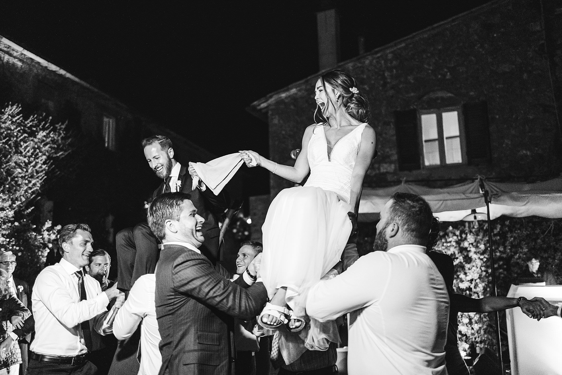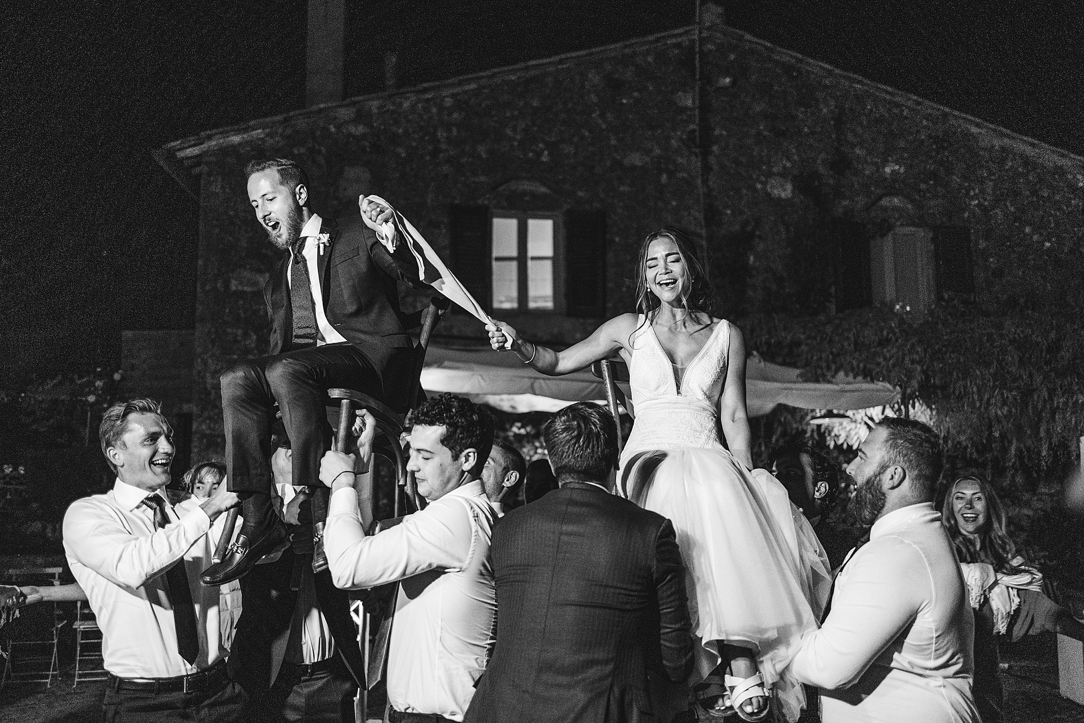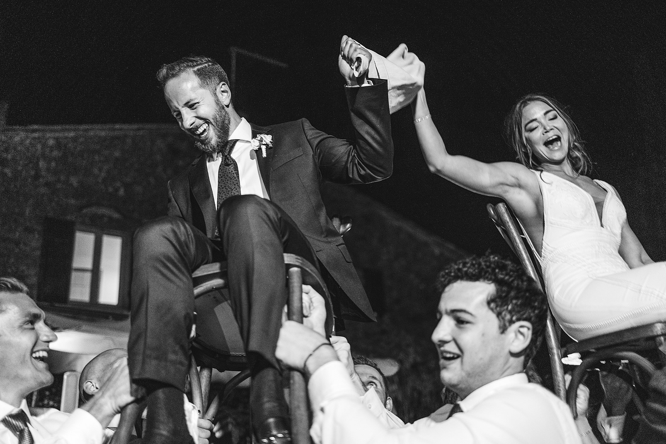 Dancing into forever, surrounded by love and laughter. The bride and groom share a joyous moment in the traditional Hora dance, supported by their friends. A celebration of love, unity, and cherished traditions. Mazel Tov! Photo by the elegant wedding photographer in Tuscany based Florence Gabriele Fani.