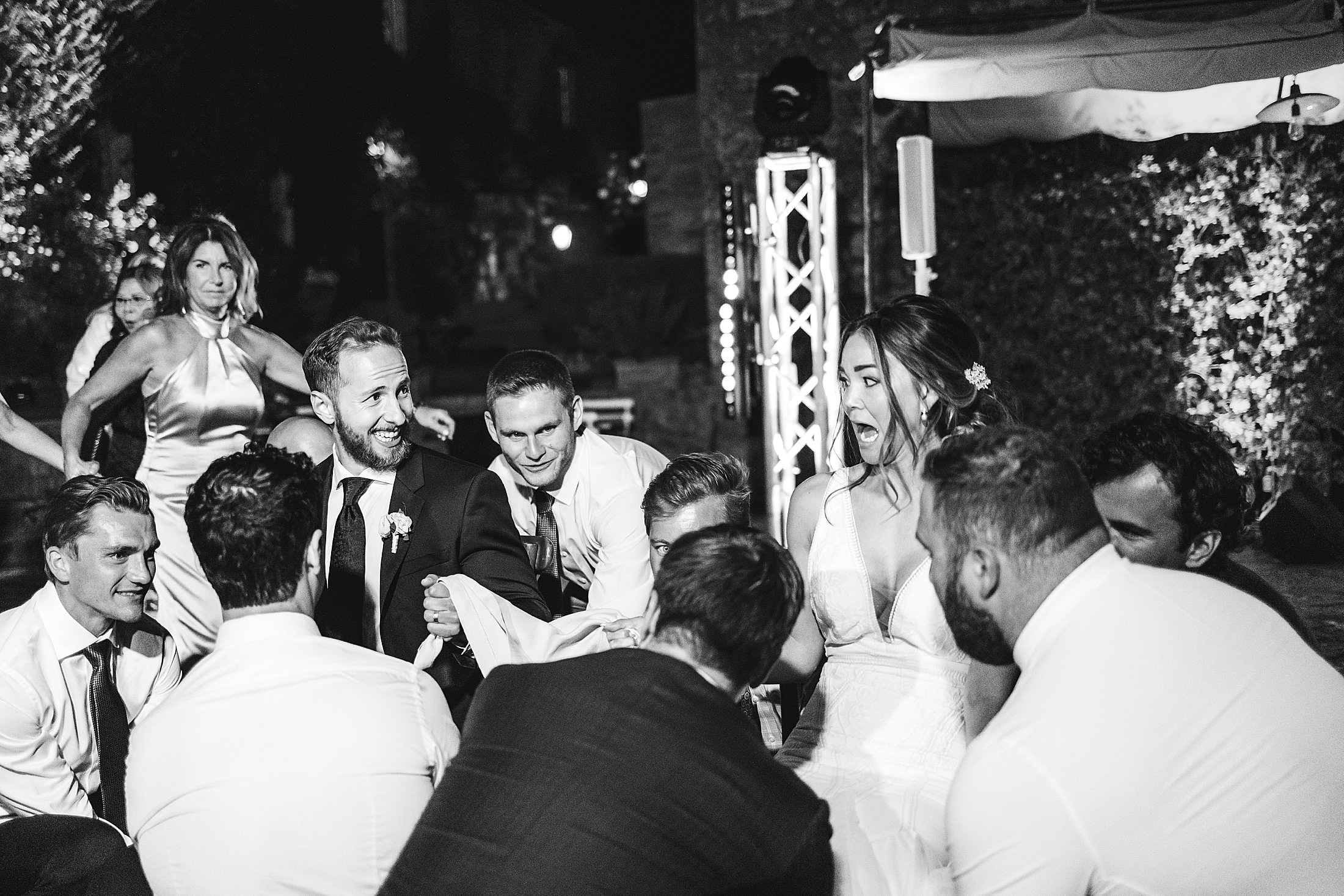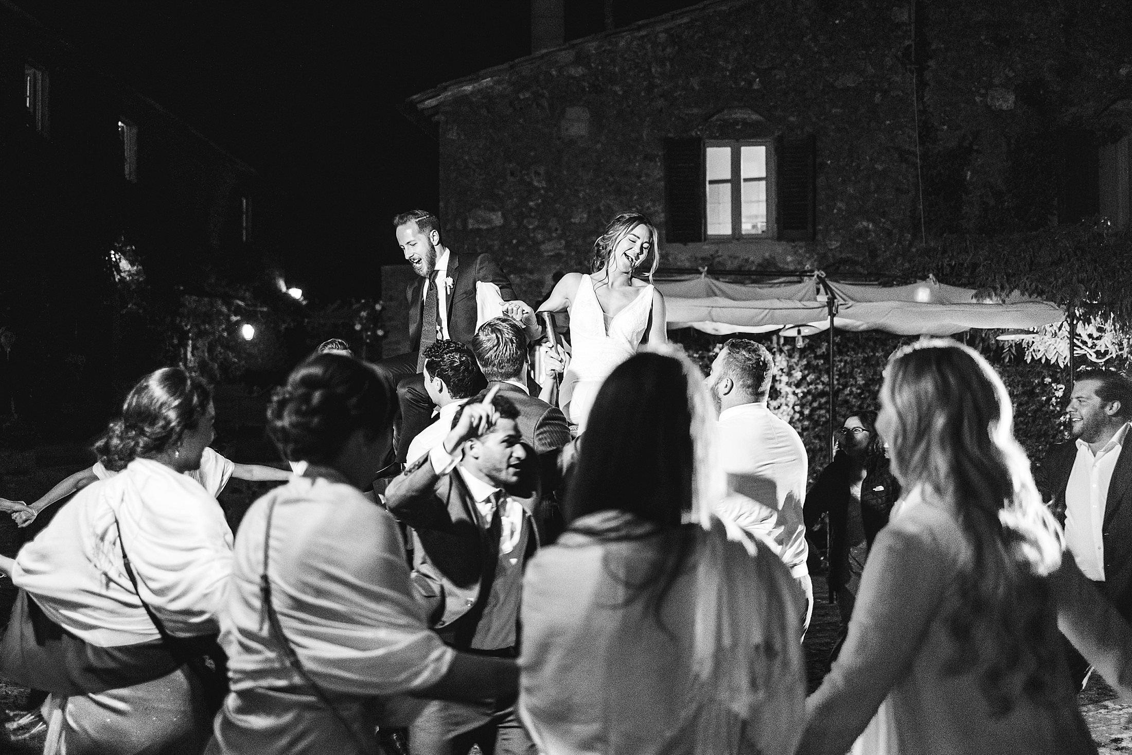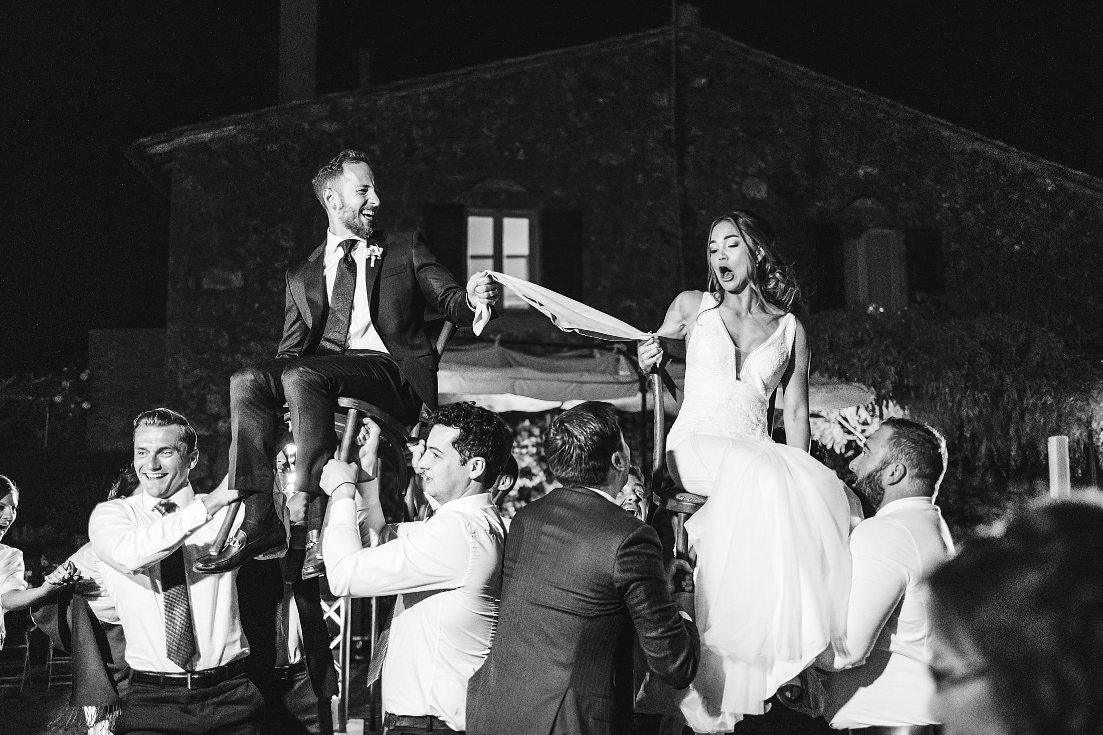 Dancing into forever, surrounded by love and laughter. The bride and groom share a joyous moment in the traditional Hora dance, supported by their friends. A celebration of love, unity, and cherished traditions. Mazel Tov! Photo by the elegant wedding photographer in Tuscany based Florence Gabriele Fani.