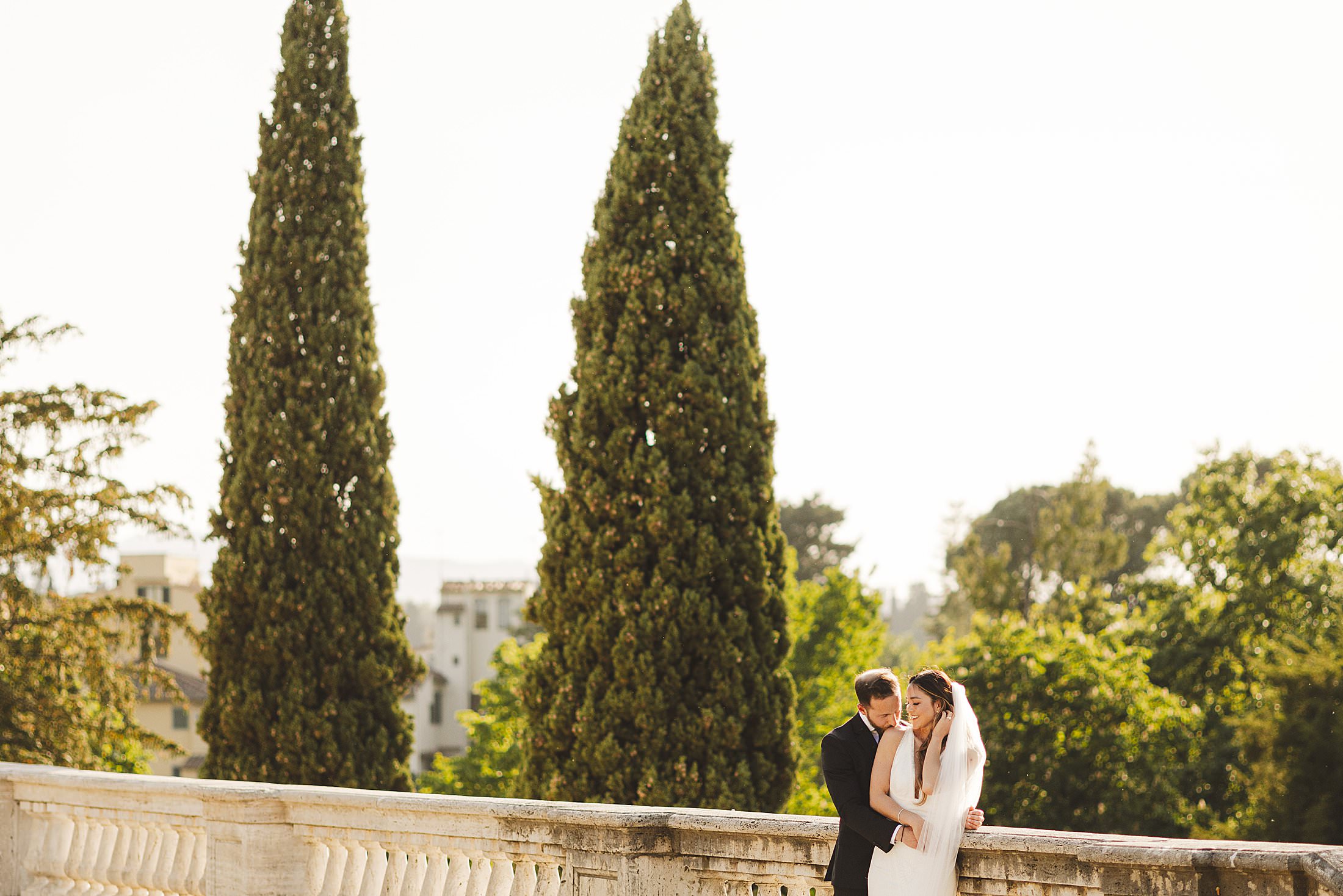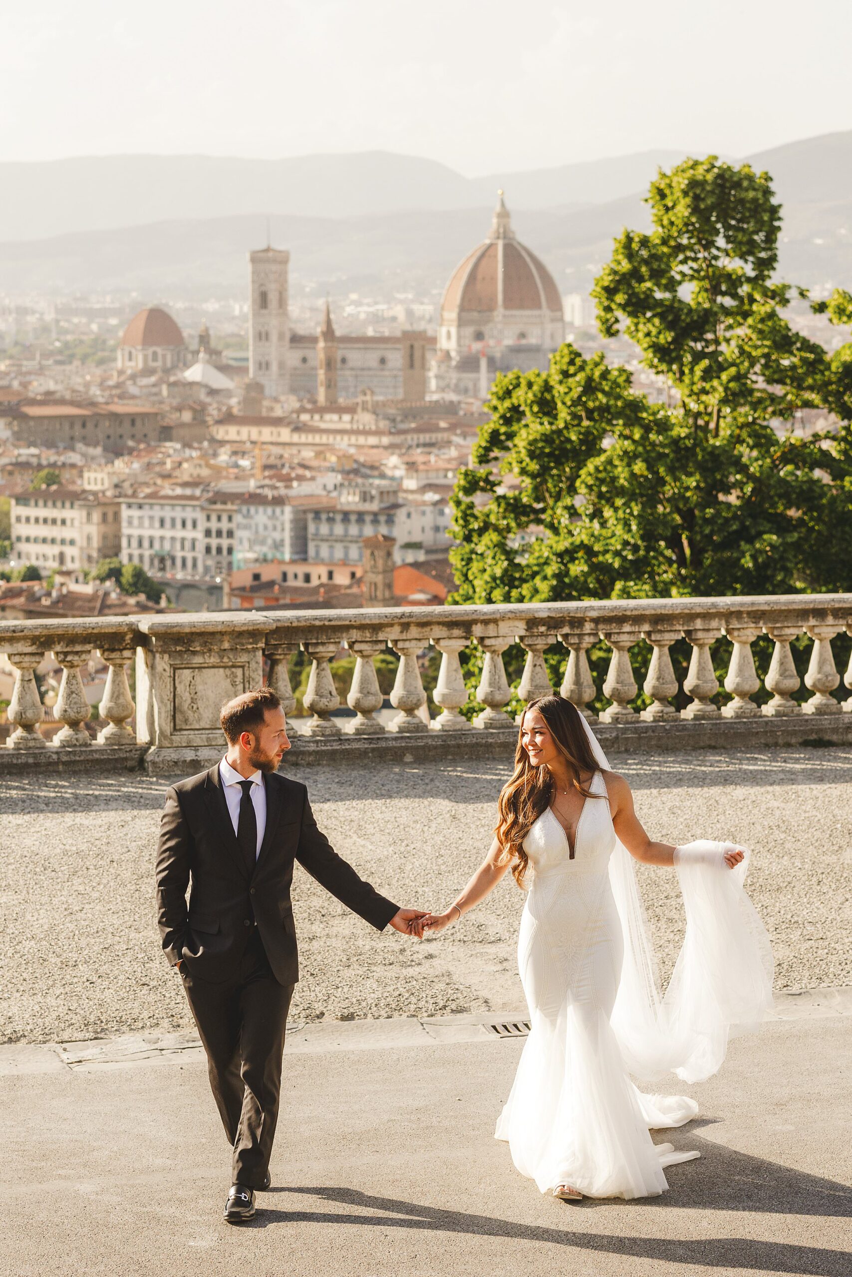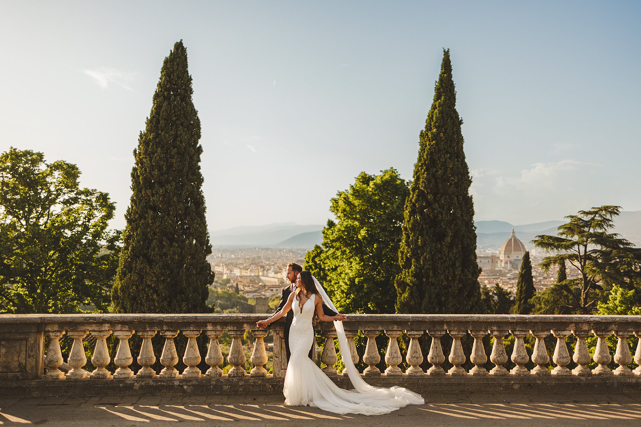 Elegant and lovely American couple post-wedding photoshoot in the most iconic panoramic location of the Renaissance city of Florence. Photo by the elegant wedding photographer in Tuscany based Florence Gabriele Fani.