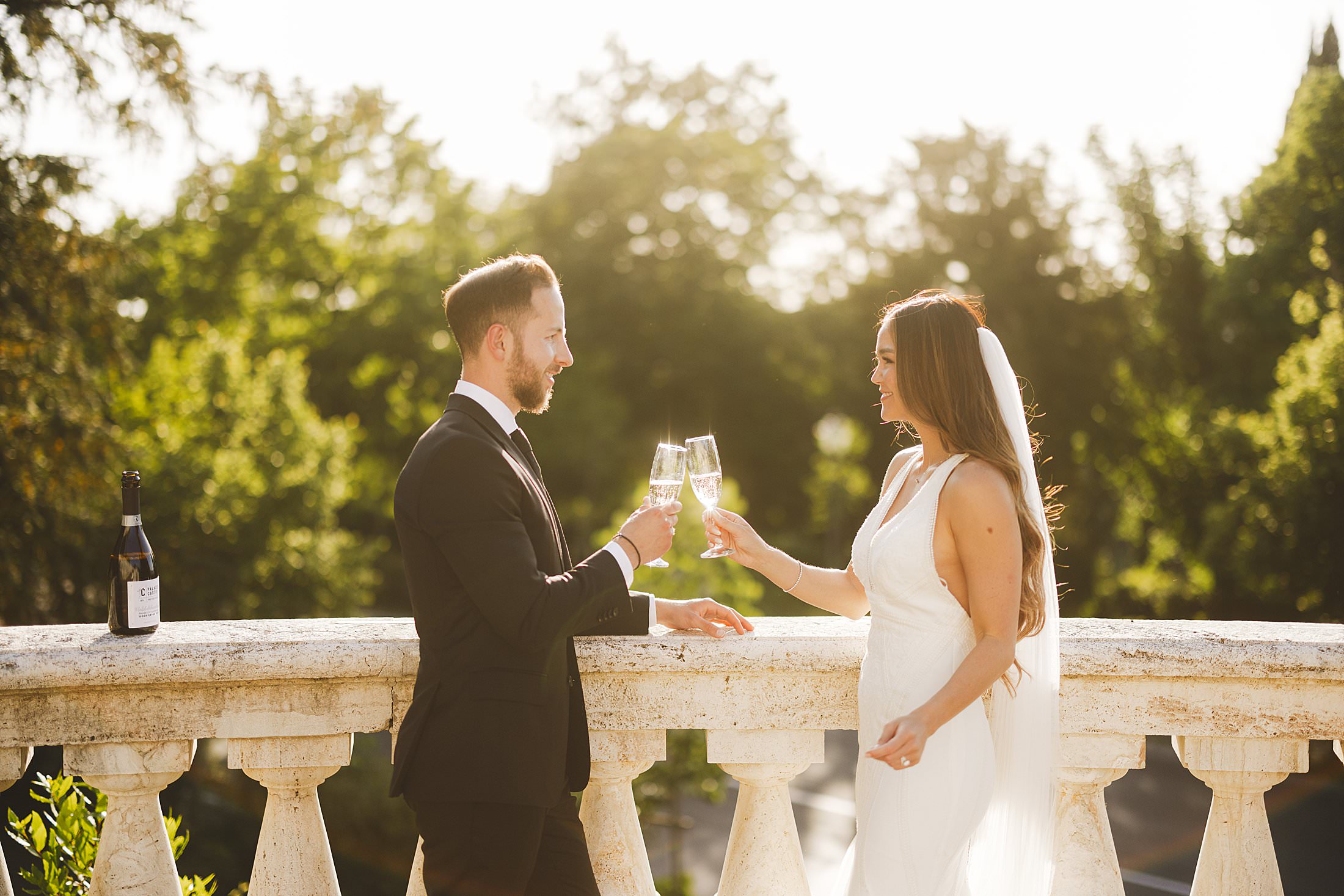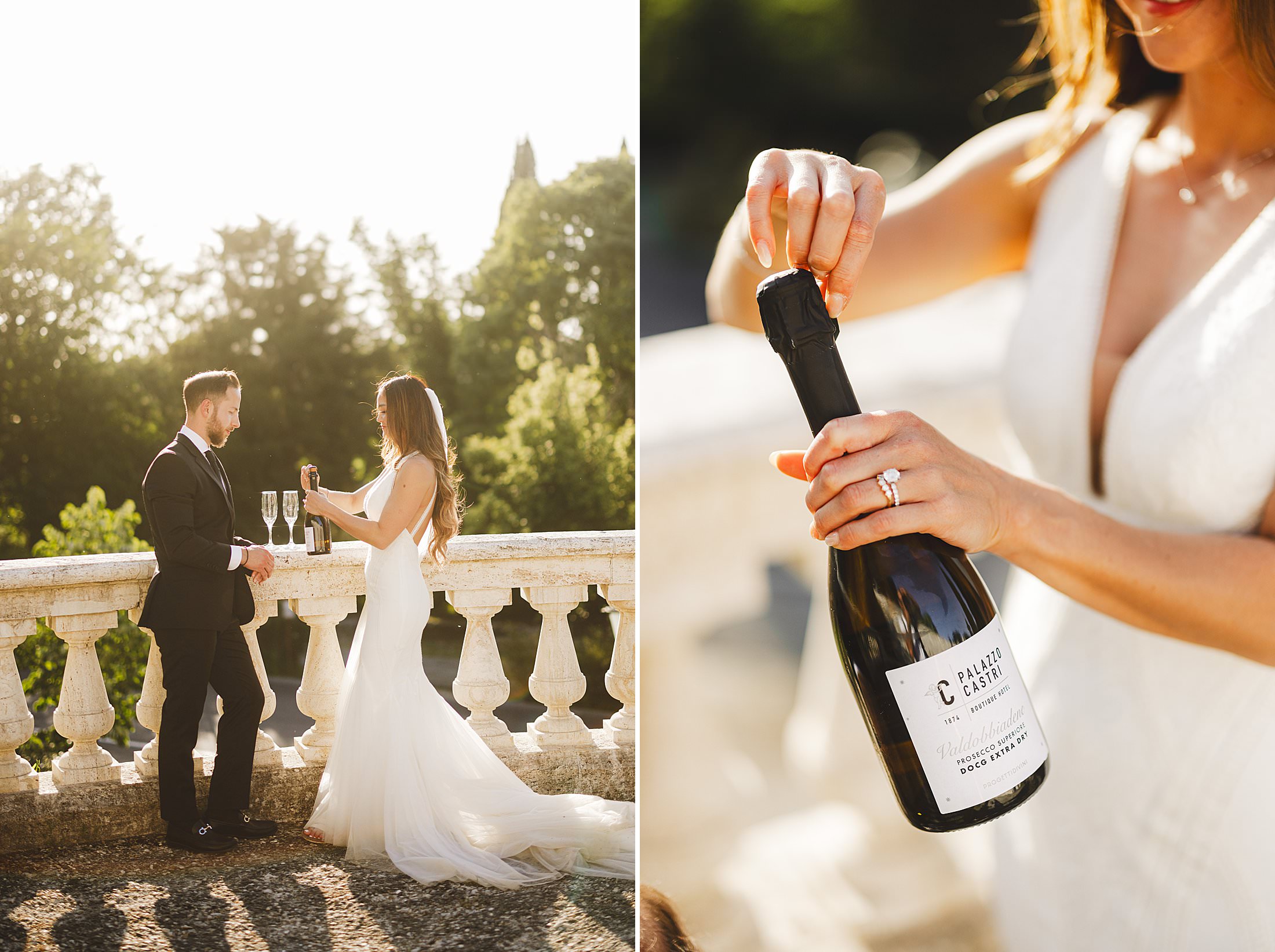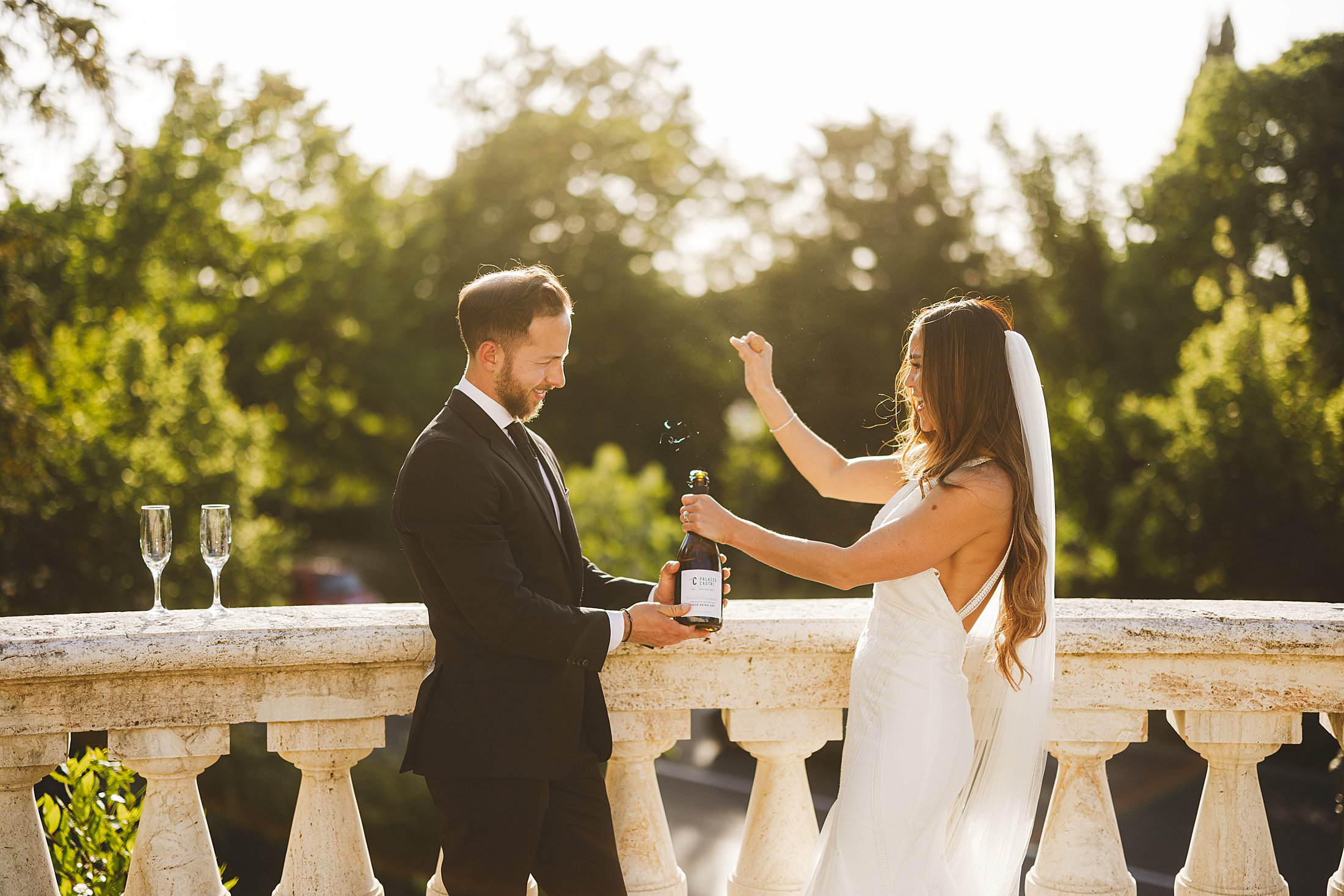 Exciting couple add a celebratory twist to their post-wedding couple photo session in Florence, toasting with a great bottle of wine. Sparkling love and joy captured in every frame. Photo by the elegant wedding photographer in Tuscany based Florence Gabriele Fani.