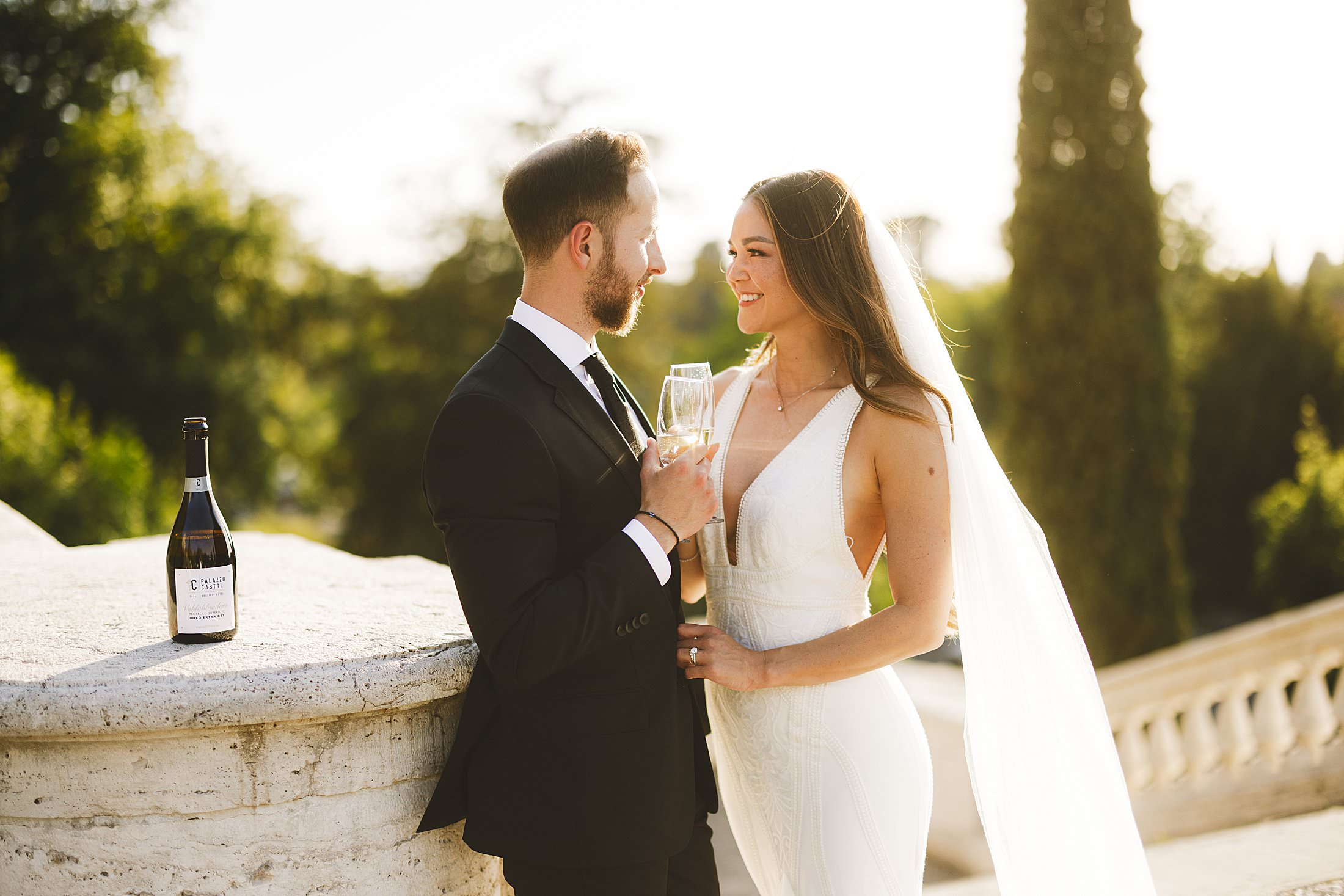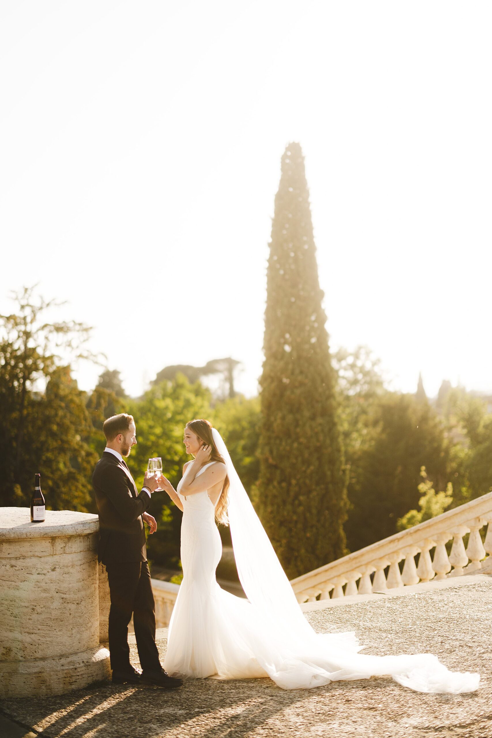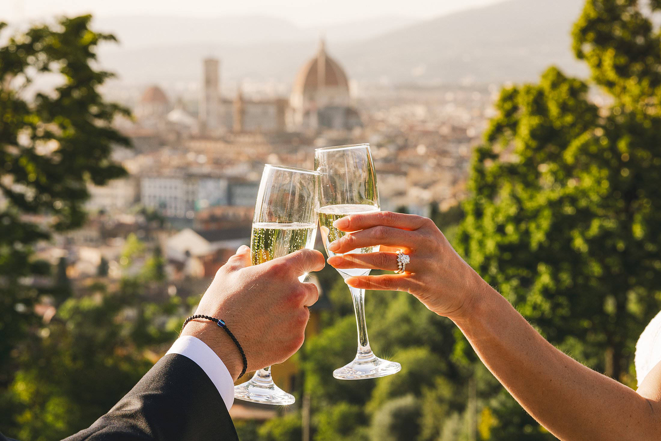 This American couple add a celebratory twist to their post-wedding couple photo session in Florence, toasting with a great bottle of champagne against the city’s iconic backdrop. Sparkling love and joy captured in every frame. Photo by the elegant wedding photographer in Tuscany based Florence Gabriele Fani.