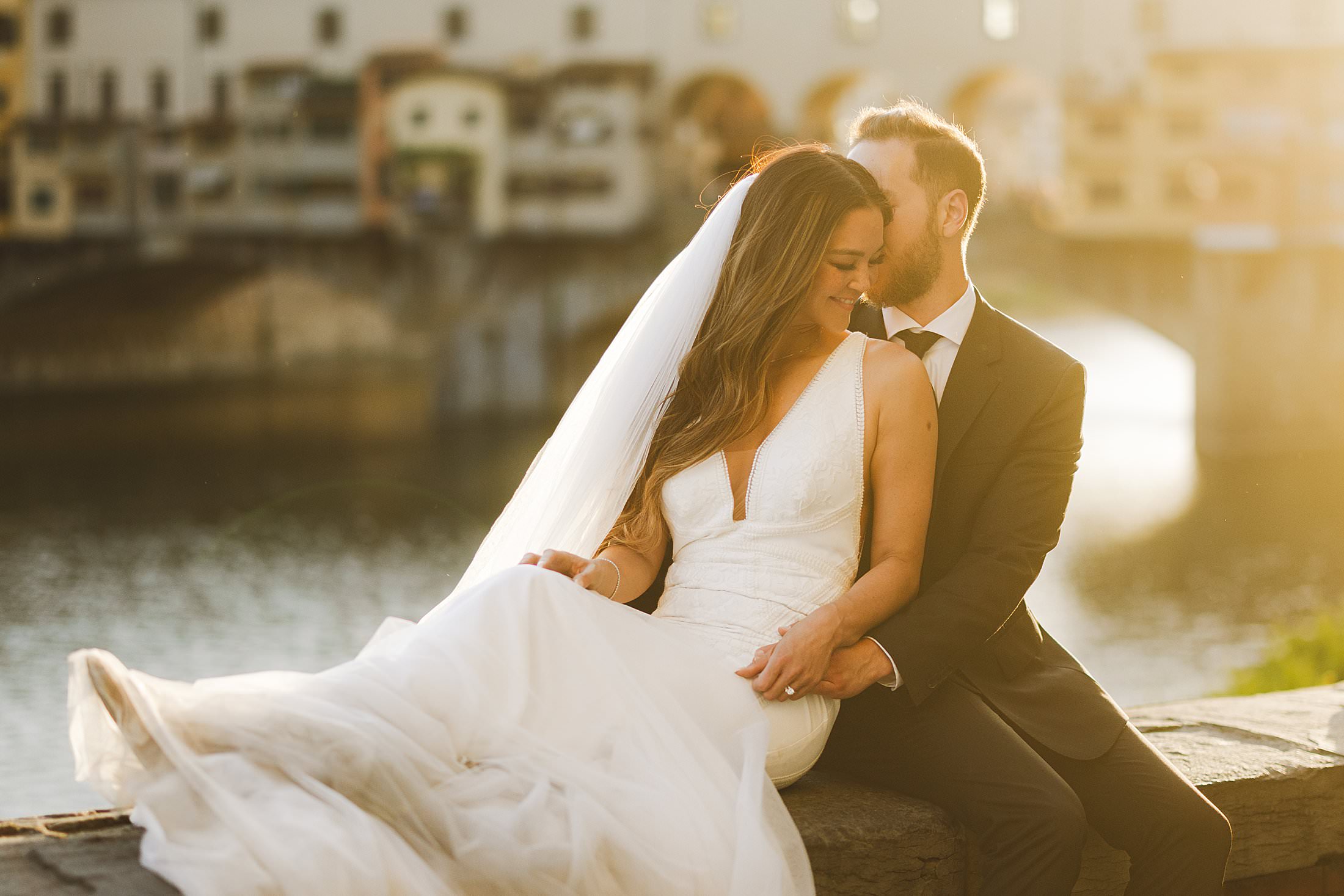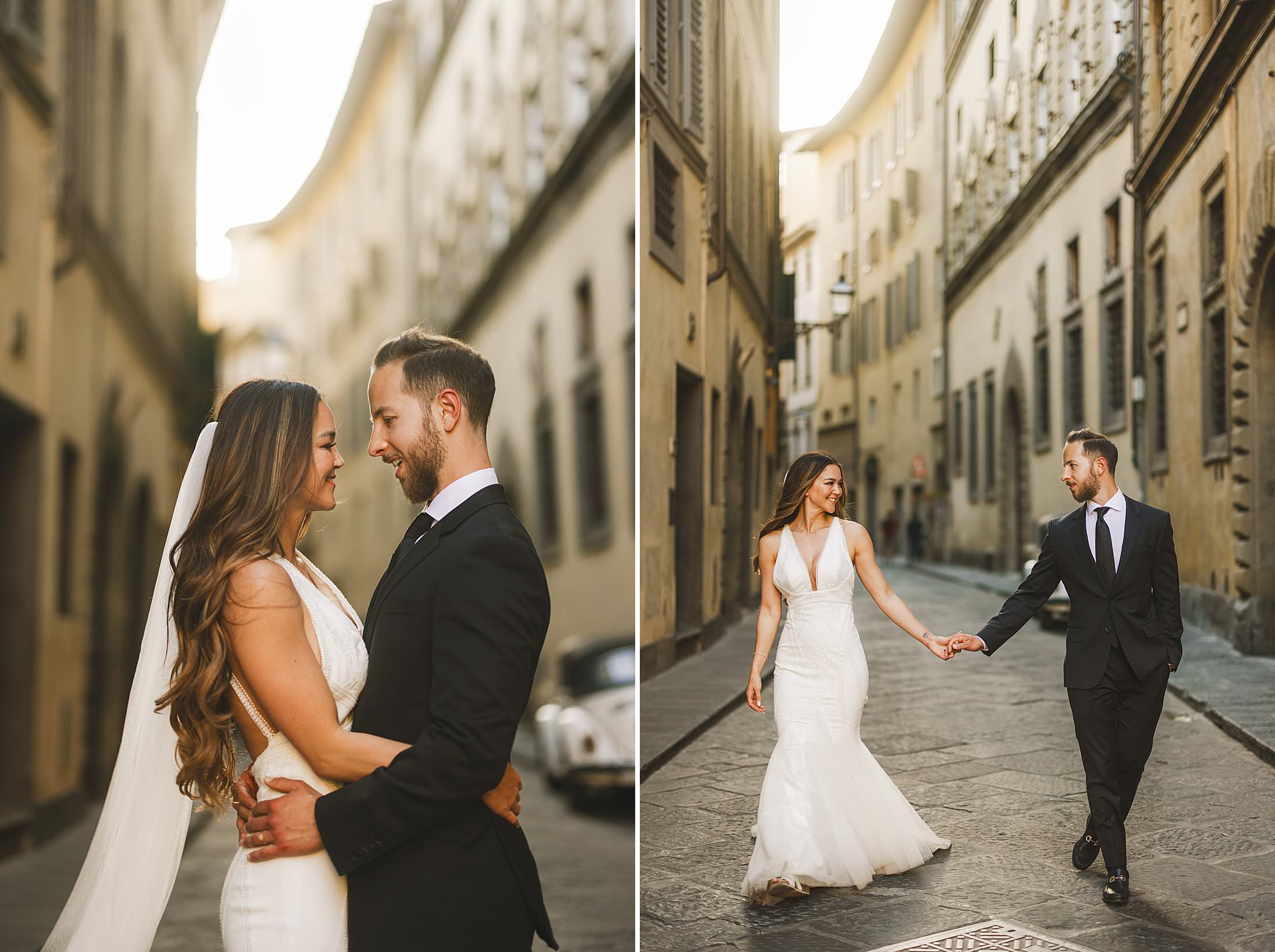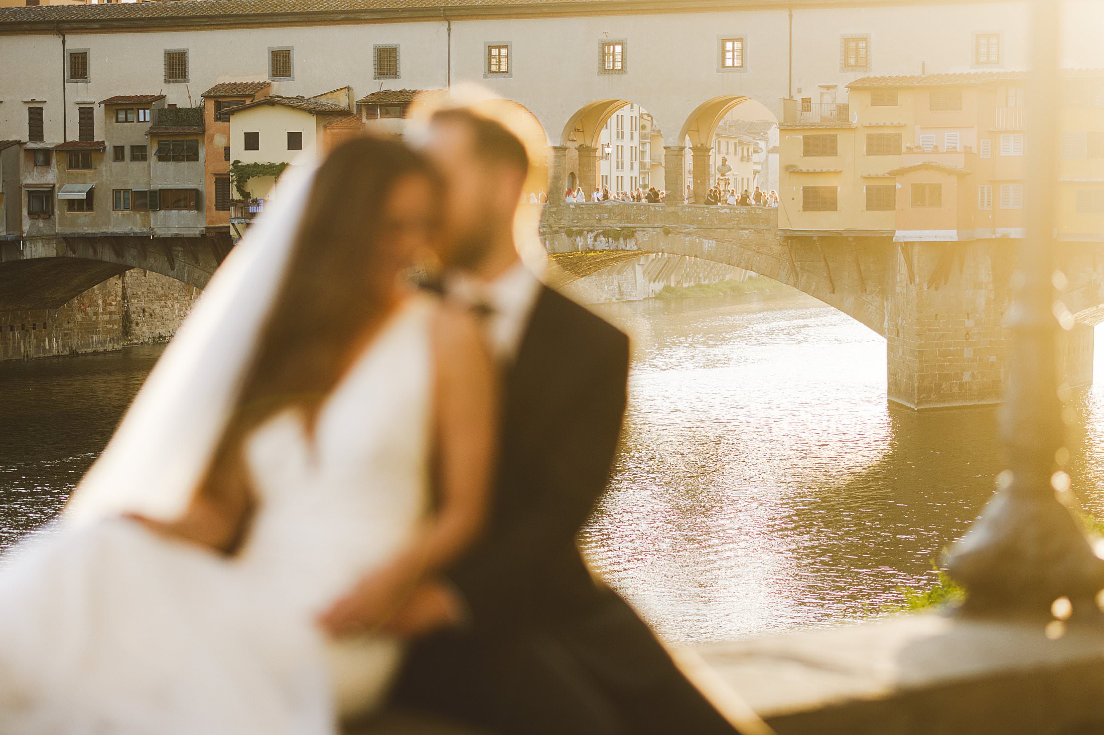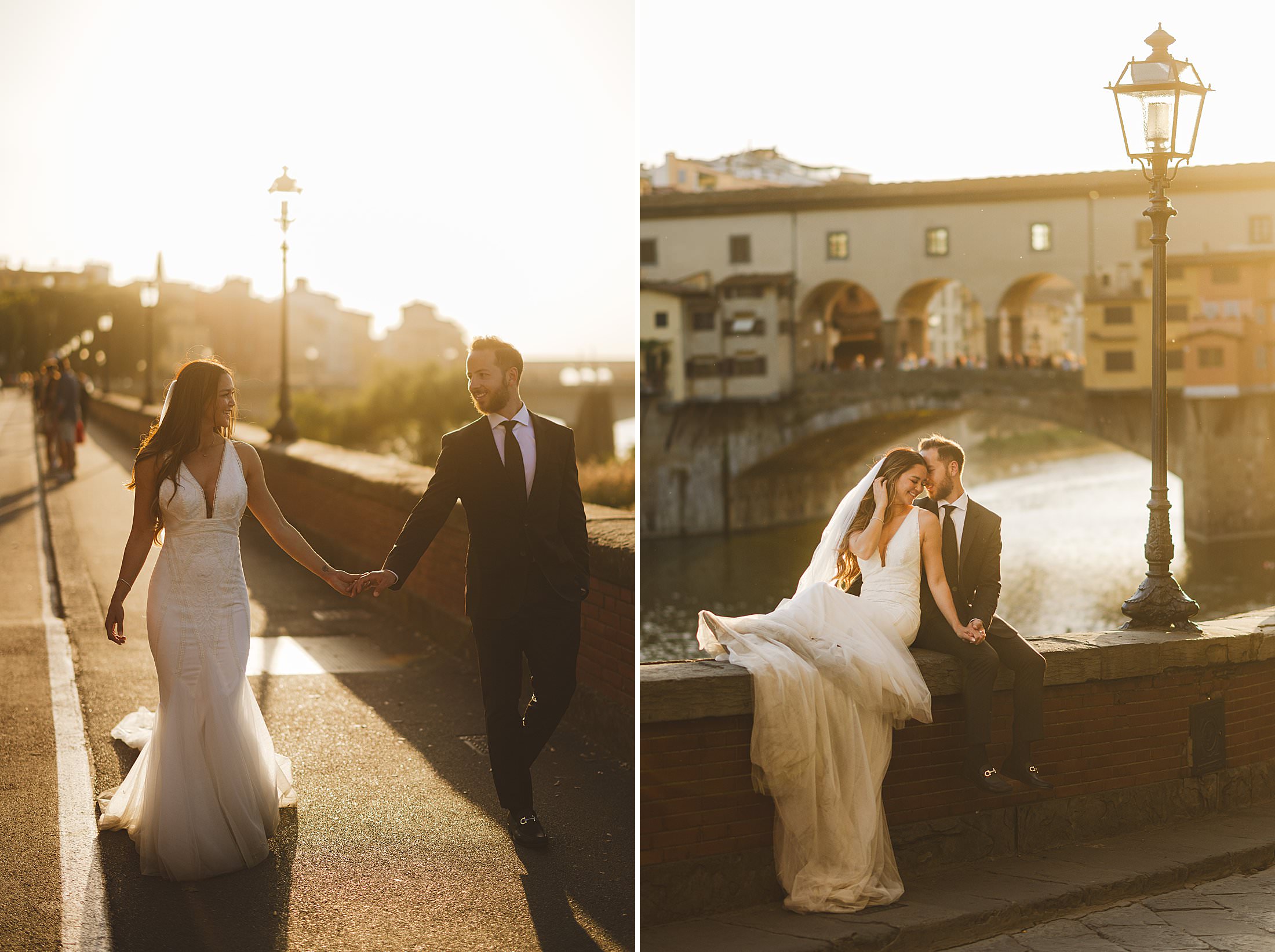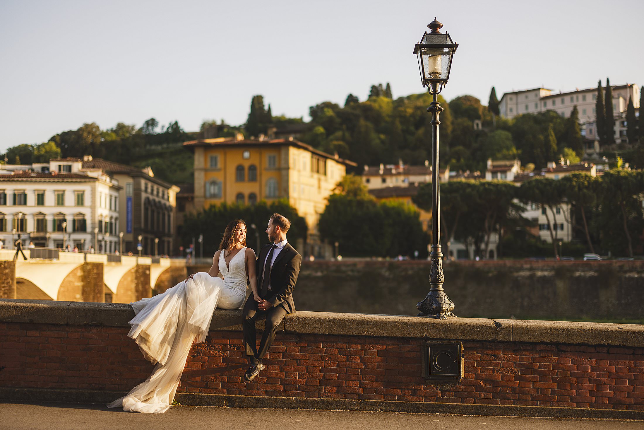 Embracing the essence of love during Florence’s golden hour, the newlyweds leisurely wander through its historic streets, hand in hand, crafting timeless memories against the captivating backdrop of Renaissance beauty near Ponte Vecchio. Photo by the elegant wedding photographer in Tuscany based Florence Gabriele Fani.