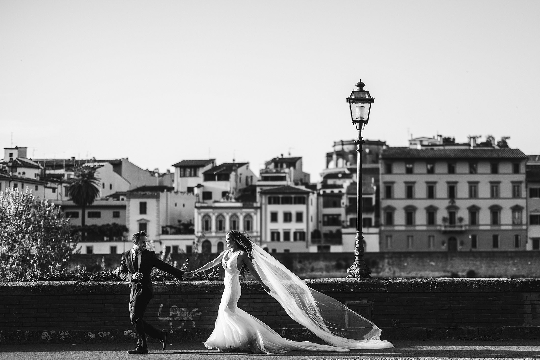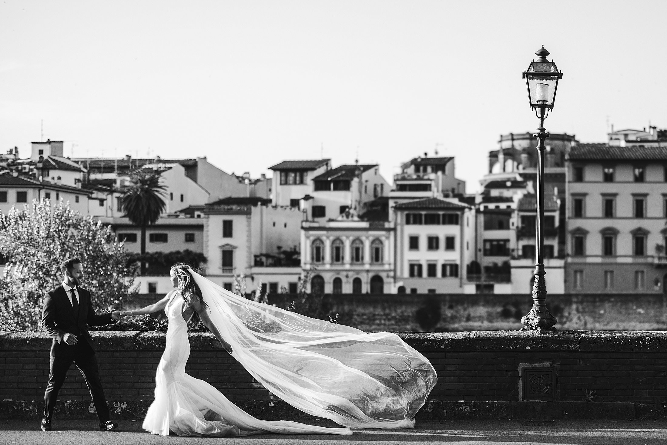 Immerse yourself in the timeless romance of Florence with this post-wedding photoshoot. The exciting stroll of this romantic American couple comes to life against the unforgettable backdrop of the Renaissance city of Florence, beautifully enhanced with a black and white edit. Each step tells a story of joy, love, and new beginnings, creating a stunning monochrome masterpiece. Photo by the elegant wedding photographer in Tuscany Gabriele Fani.