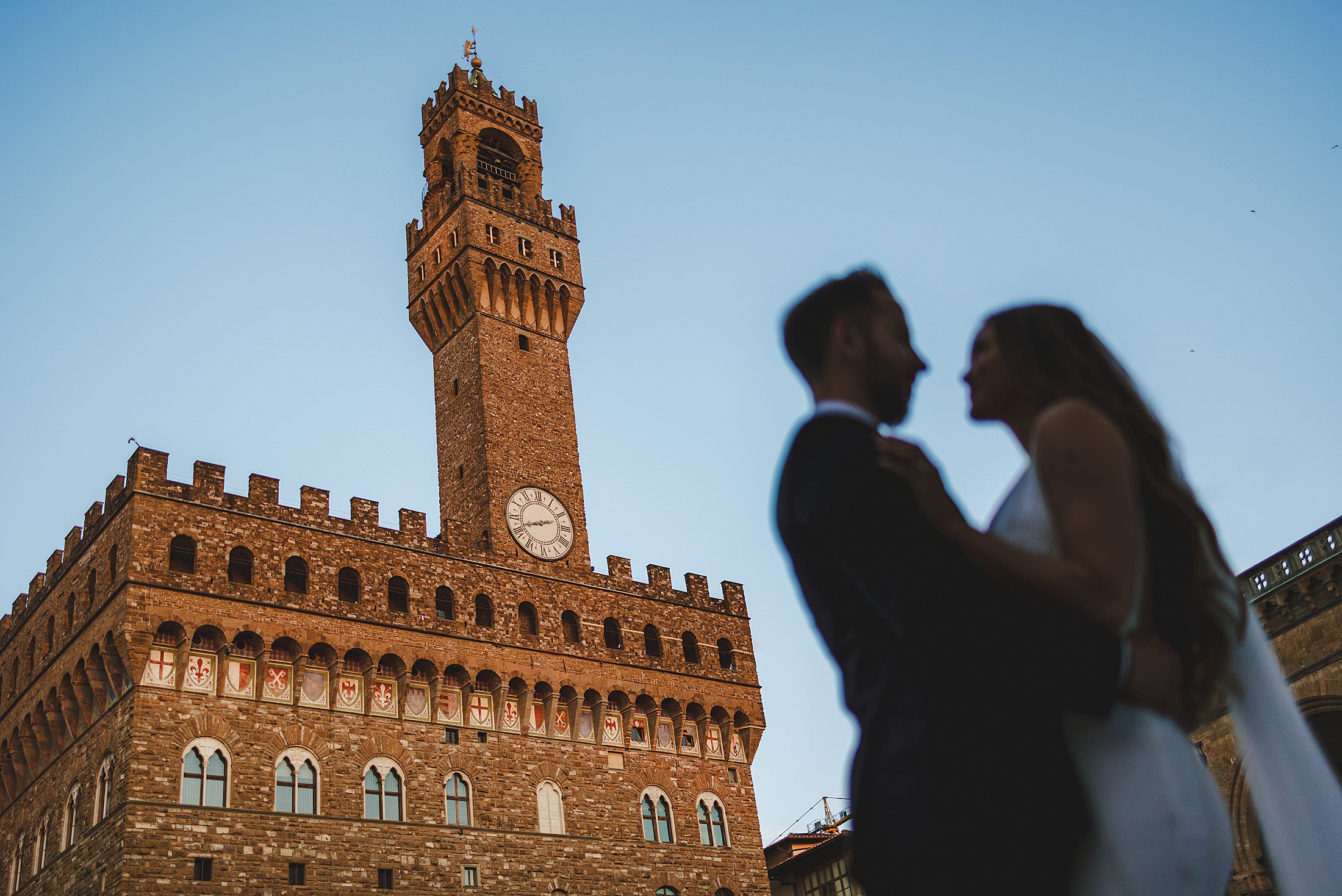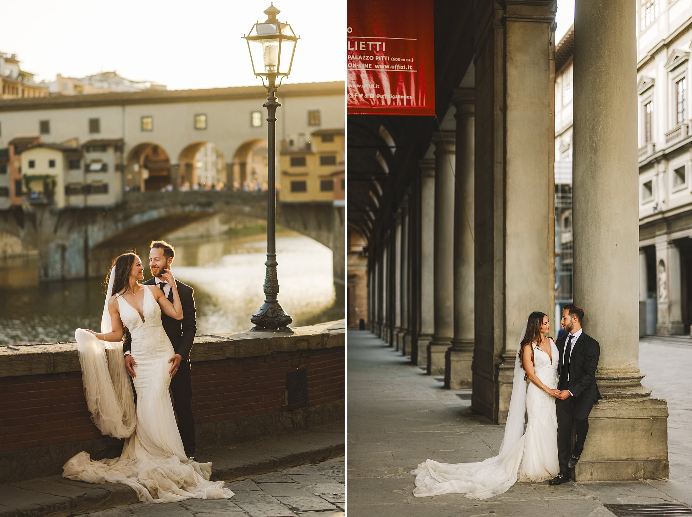 Elegant bride and groom post-wedding photo shoot in the heart of Florence near Uffizi and Ponte Vecchio. Photo by the elegant wedding photographer in Tuscany based Florence Gabriele Fani.