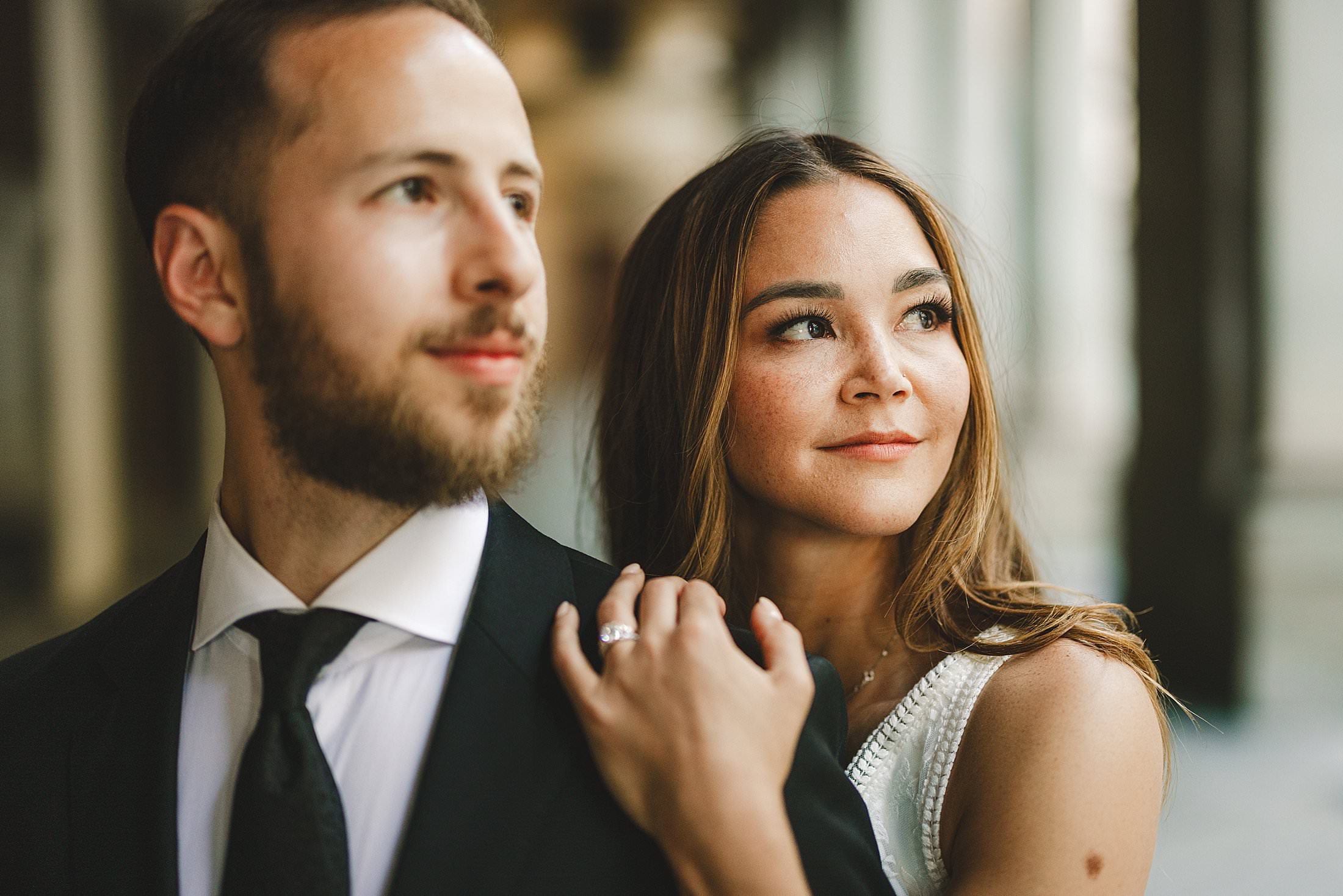 Wandering hand in hand beneath the archway of the Uffizi art gallery, near the iconic Piazza della Signoria and Palazzo Vecchio, the couple’s journey takes a captivating turn. As they gracefully pivot towards me and my camera, the essence of their connection intertwines with the rich history and cultural allure of Florence. Photo by the elegant wedding photographer in Tuscany based Florence Gabriele Fani.