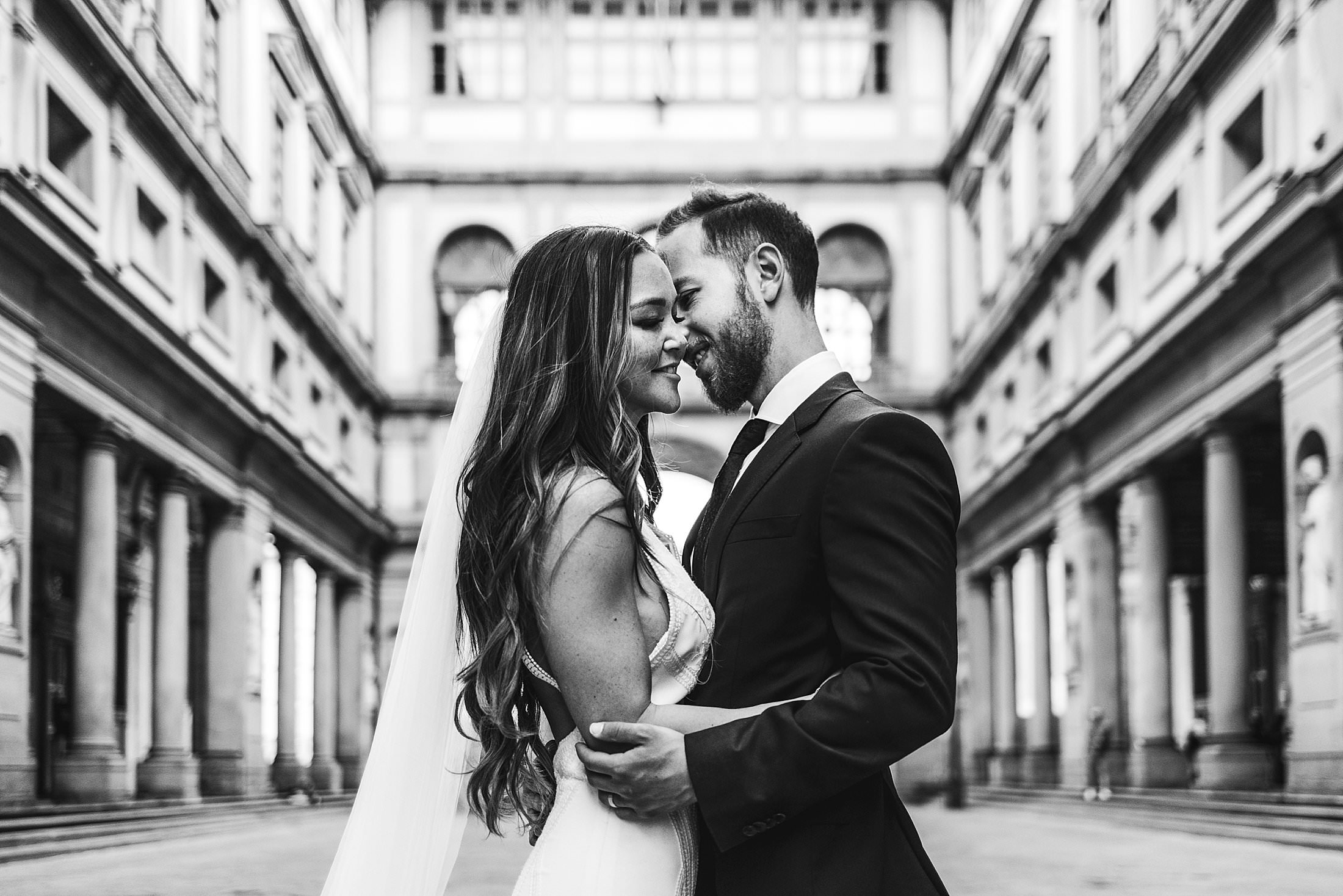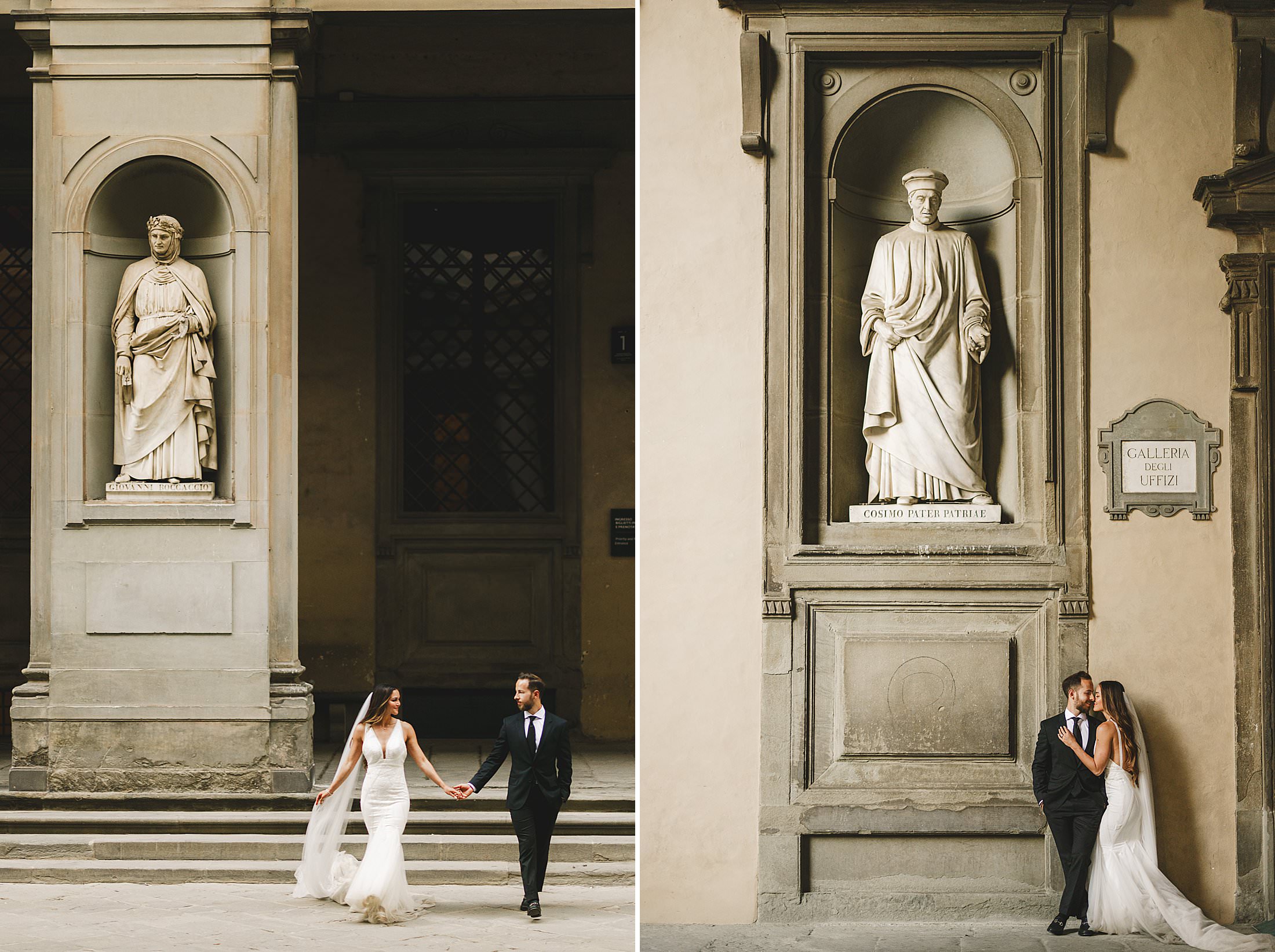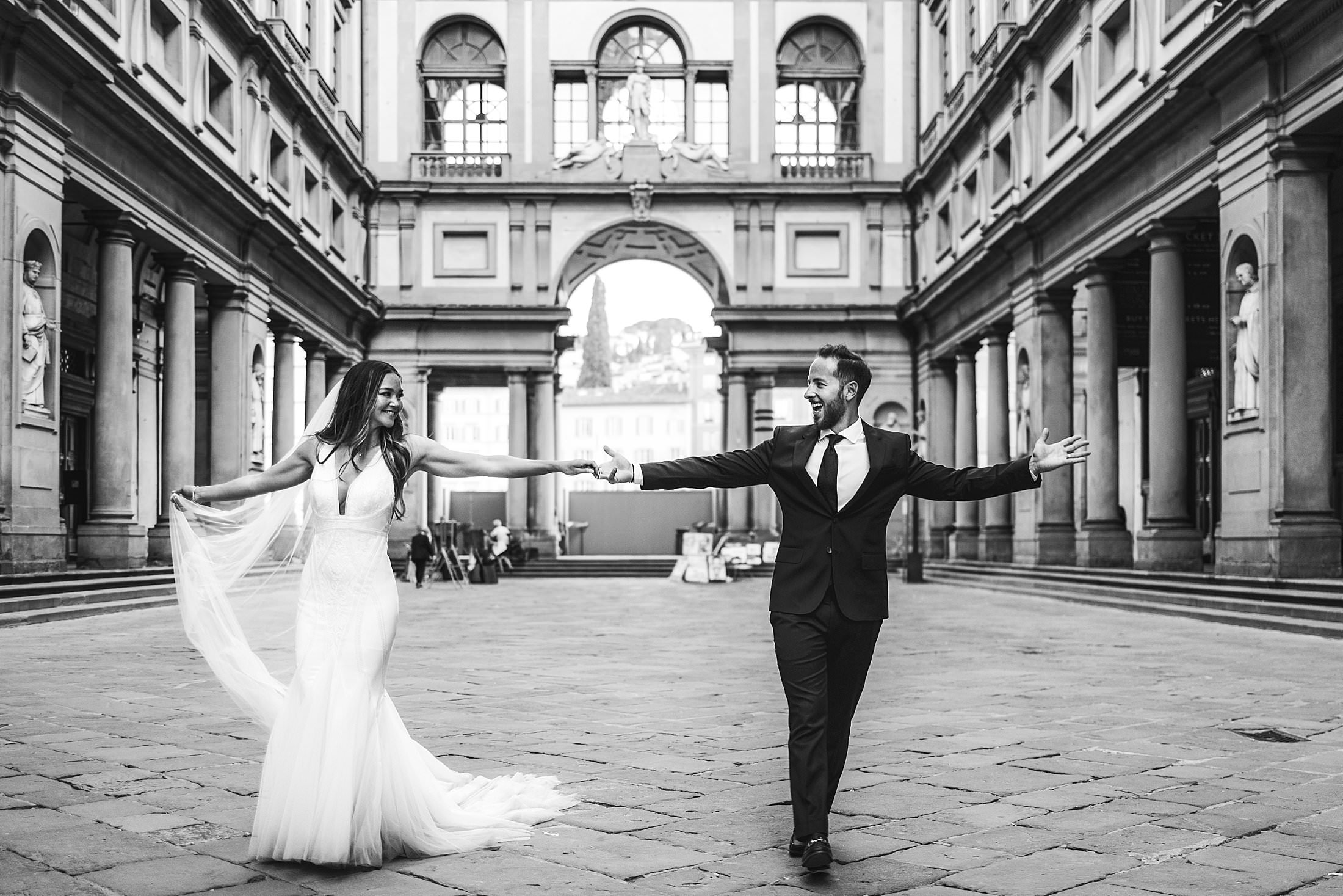 Exciting elegant and fun bride and groom post-wedding photoshoot in Florence historical center Uffizi. Photo by the elegant wedding photographer in Tuscany based Florence Gabriele Fani.
