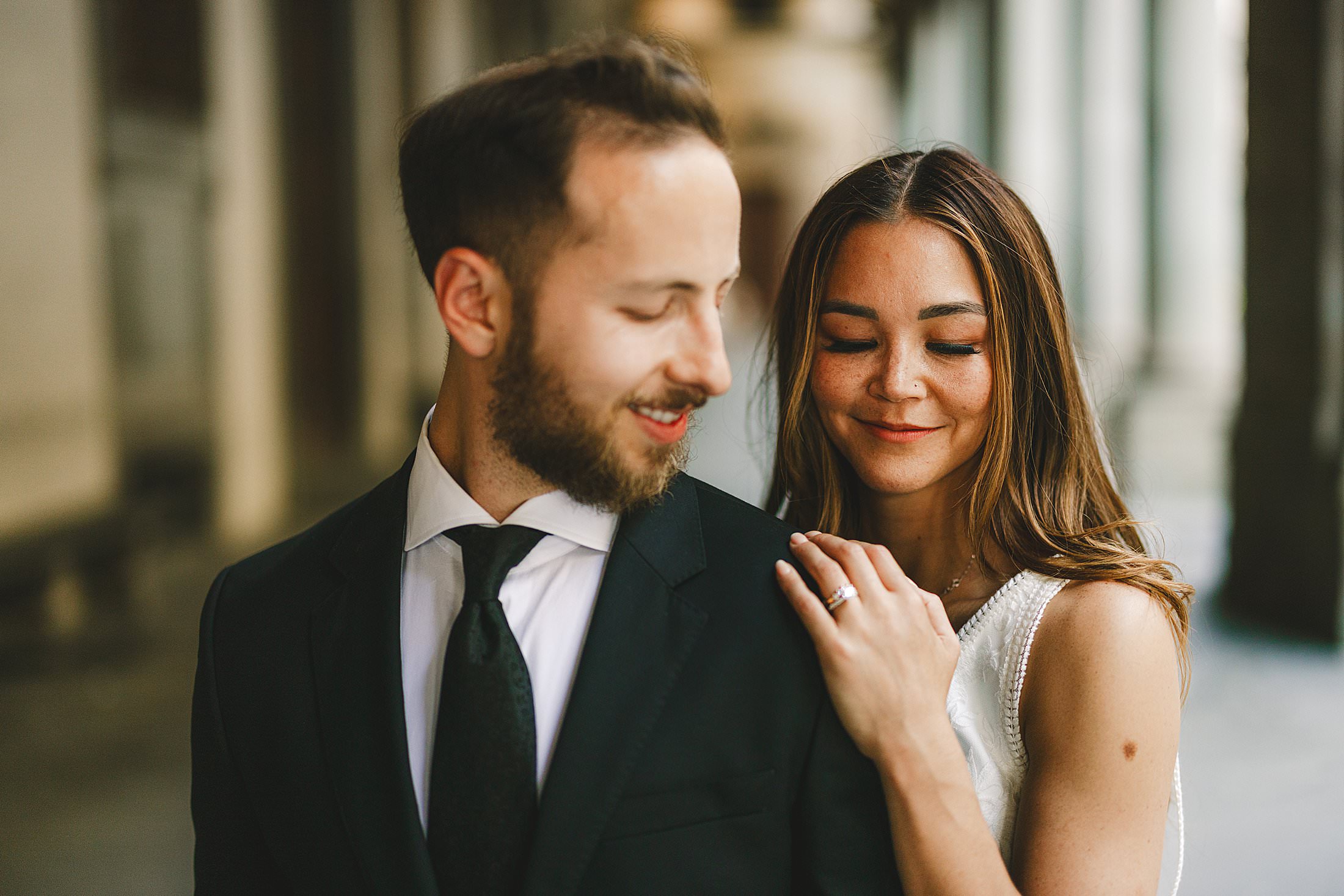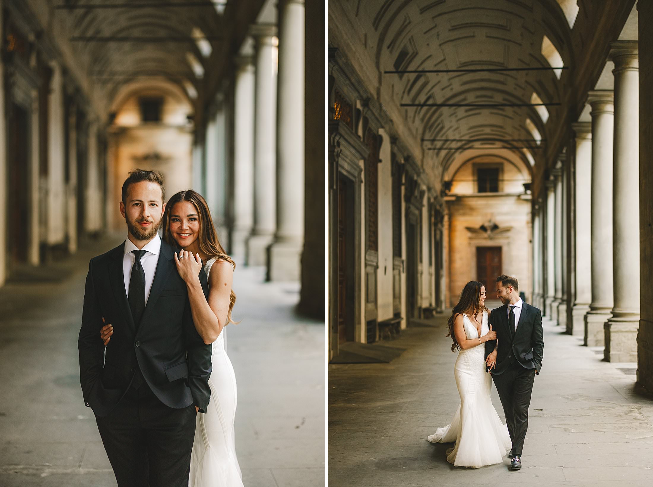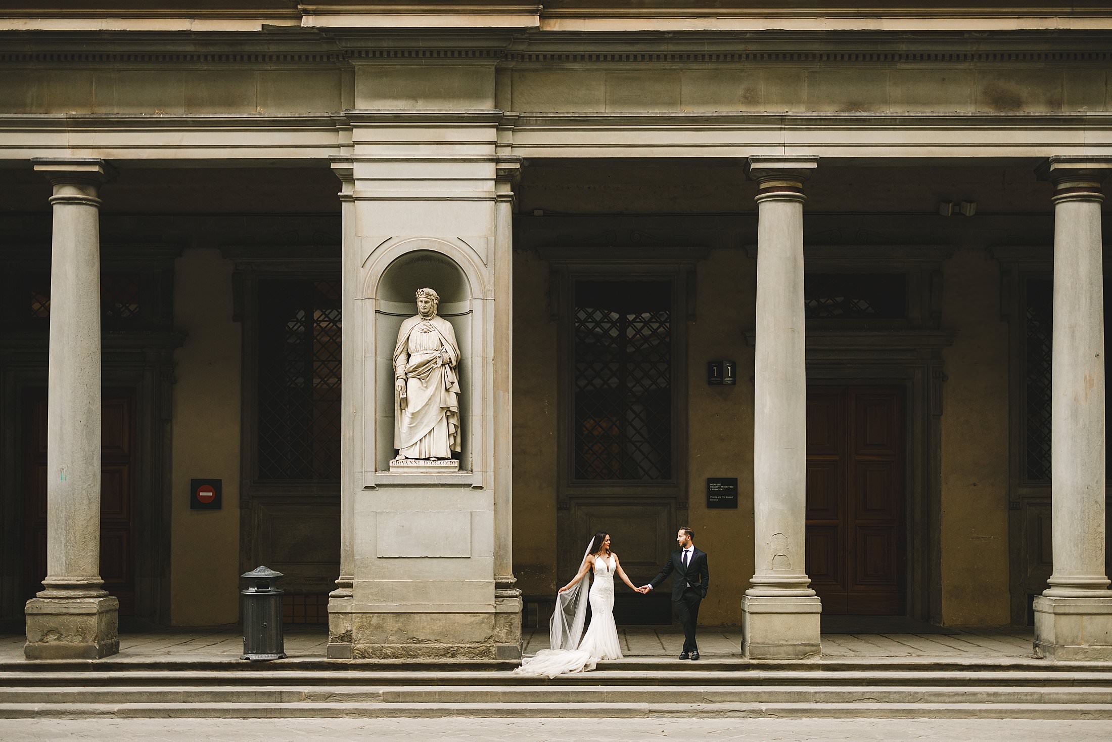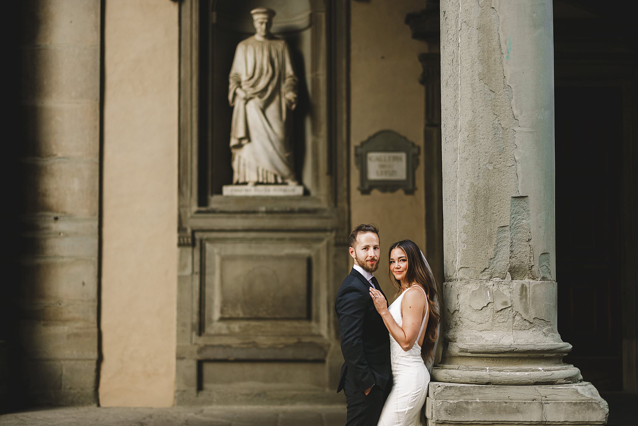 Exciting elegant and fun bride and groom post-wedding photoshoot in Florence historical center Uffizi. Photo by the elegant wedding photographer in Tuscany based Florence Gabriele Fani.