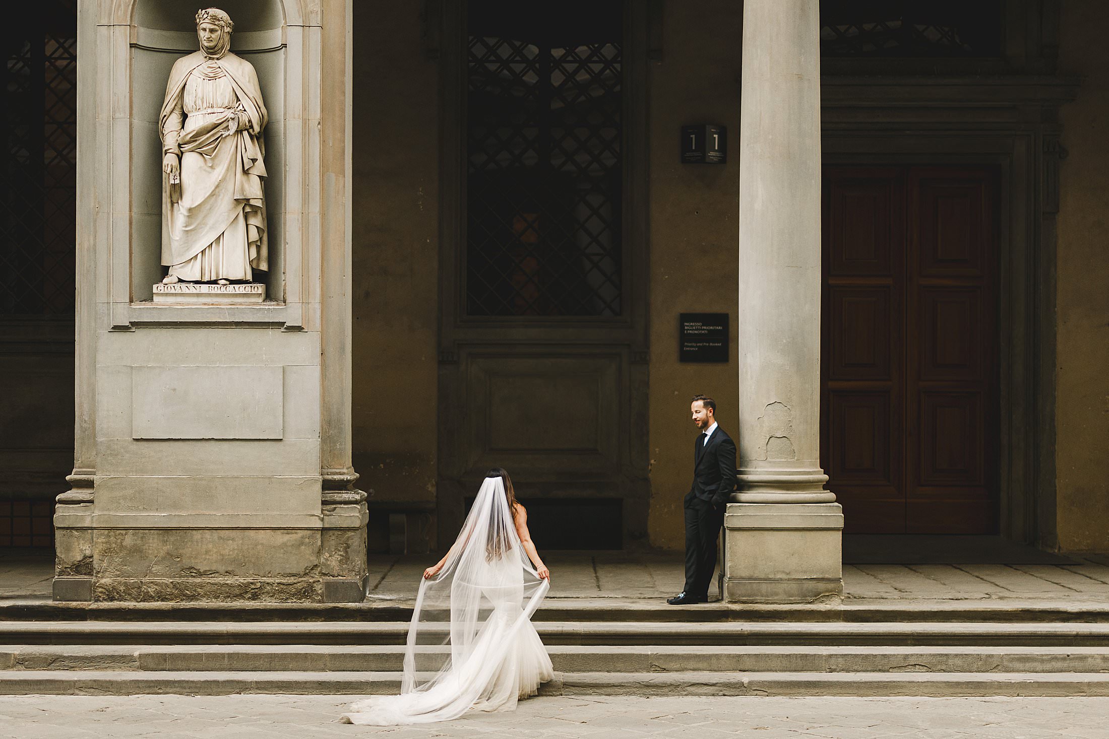 Whispers of love in the air as the enchanting bride gracefully approaches her groom, a vision of elegance. Her beautiful, long veil dances with every step against the backdrop of the Uffizi Art Museum. A moment of pure romance, where every detail is woven into the timeless tapestry of their love story. Photo by the elegant wedding photographer in Tuscany based Florence Gabriele Fani.