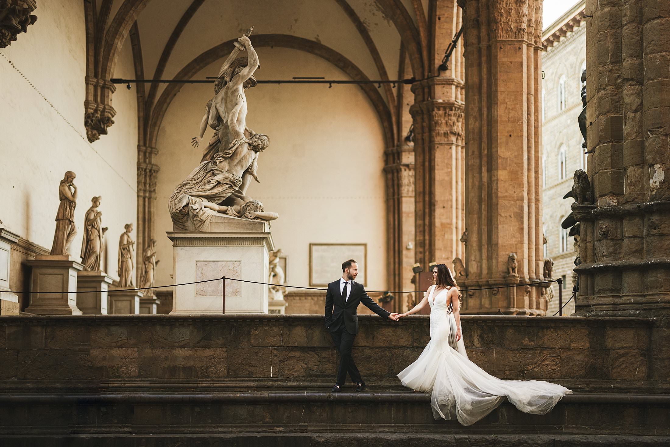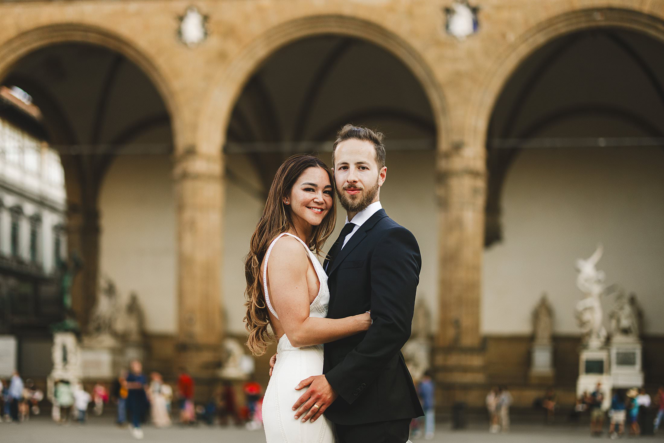 Lovely American couple post-wedding photo session in the heart of historic center of Florence at Piazza della Signoria. Photo by the elegant wedding photographer in Tuscany based Florence Gabriele Fani.