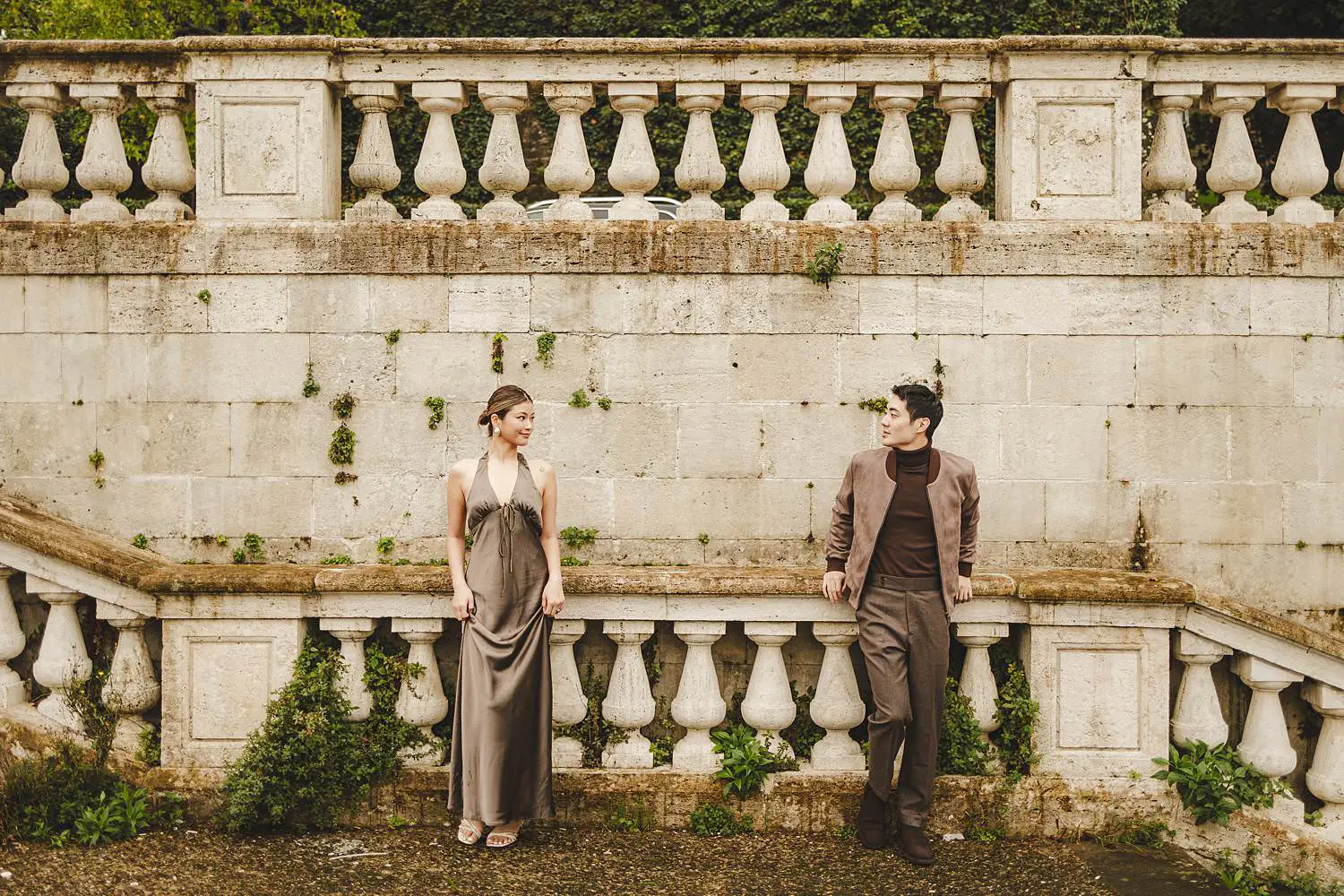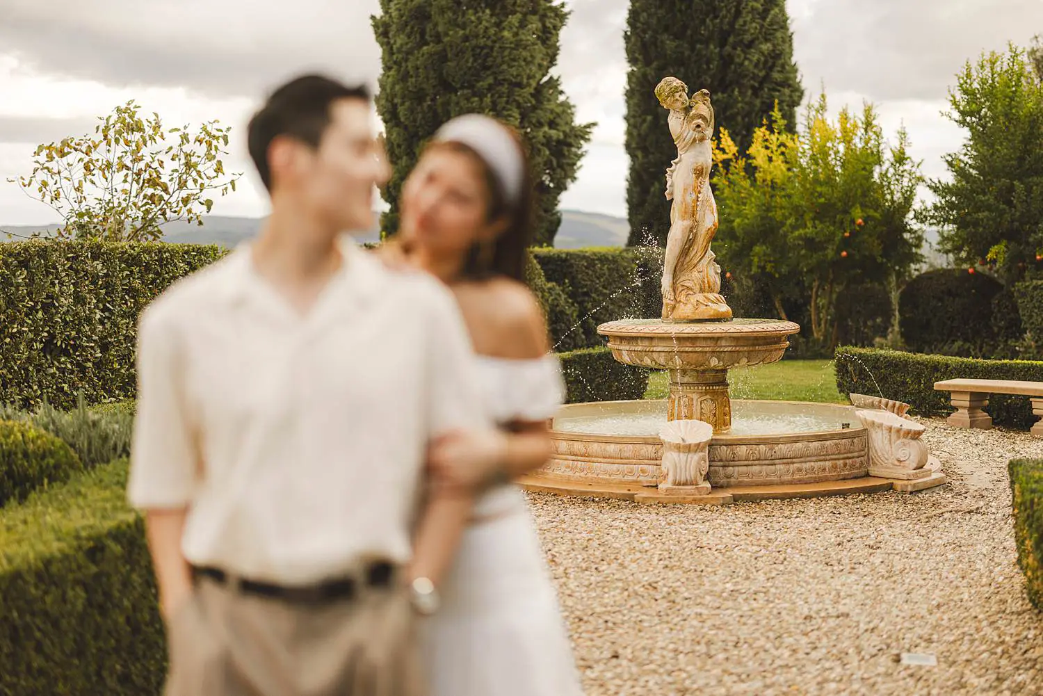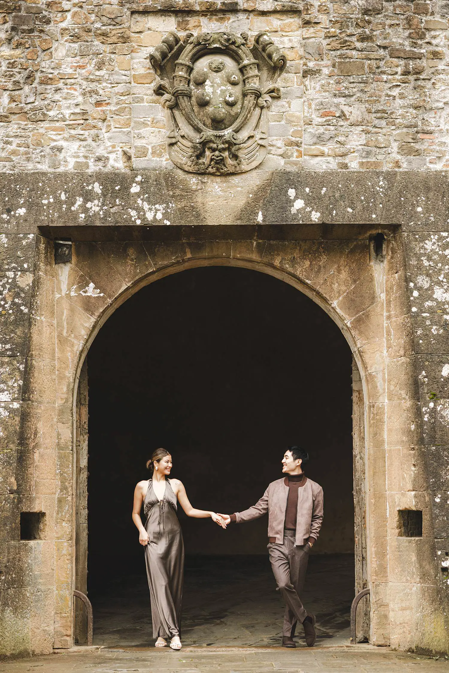 The estate offers an incredible variety of scenic locations — elegant gardens, cypress-lined paths and breathtaking views across the Chianti countryside. Walking together through the historic corners of the property, Elly and Alan enjoyed the moment naturally while celebrating their engagement.
