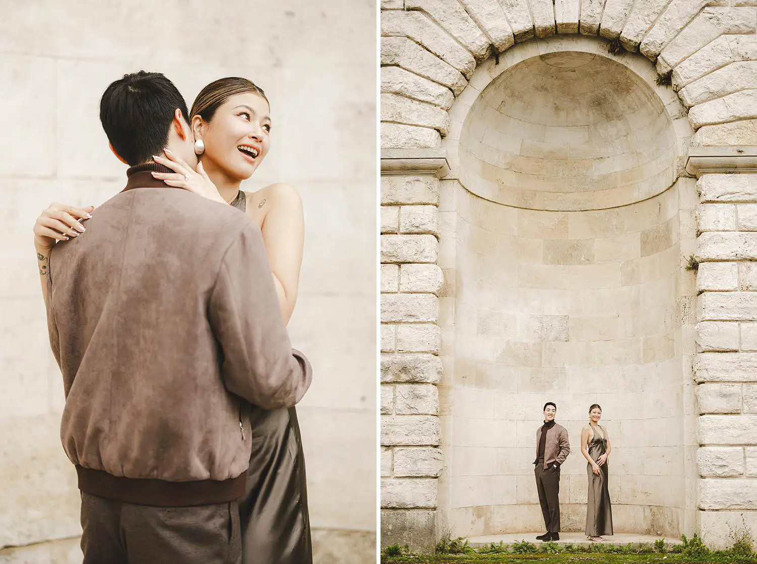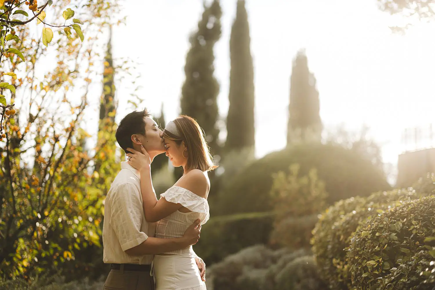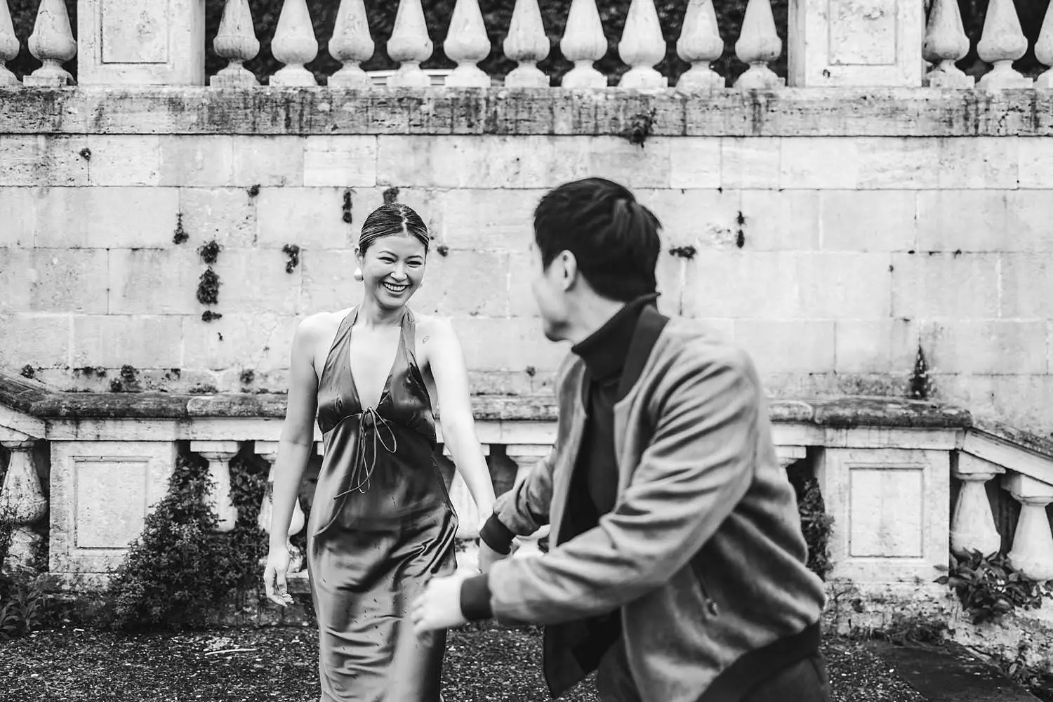 The estate offers an incredible variety of scenic locations — elegant gardens, cypress-lined paths and breathtaking views across the Chianti countryside. Walking together through the historic corners of the property, Elly and Alan enjoyed the moment naturally while celebrating their engagement.