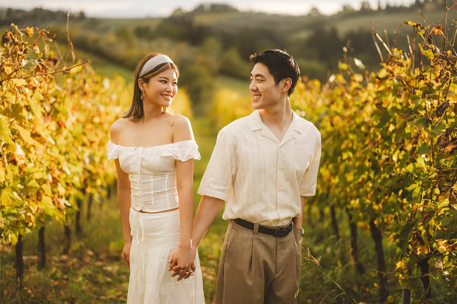 Just outside the estate lies a beautiful vineyard that perfectly represents the essence of the Tuscan countryside. Walking together between the rows of vines, Elly and Alan embraced the peaceful atmosphere of the Chianti hills.