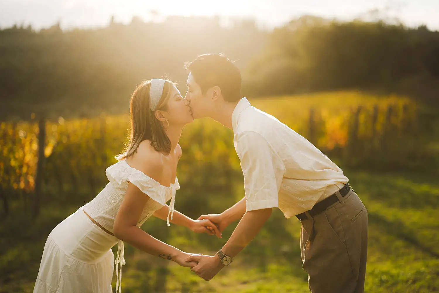 The golden light of sunset wrapped the vineyard and the surrounding hills in warm tones, creating a dreamy and romantic setting. These final moments among the vines became the perfect conclusion to the first part of their engagement story — intimate, natural and deeply connected to the landscape of Tuscany.