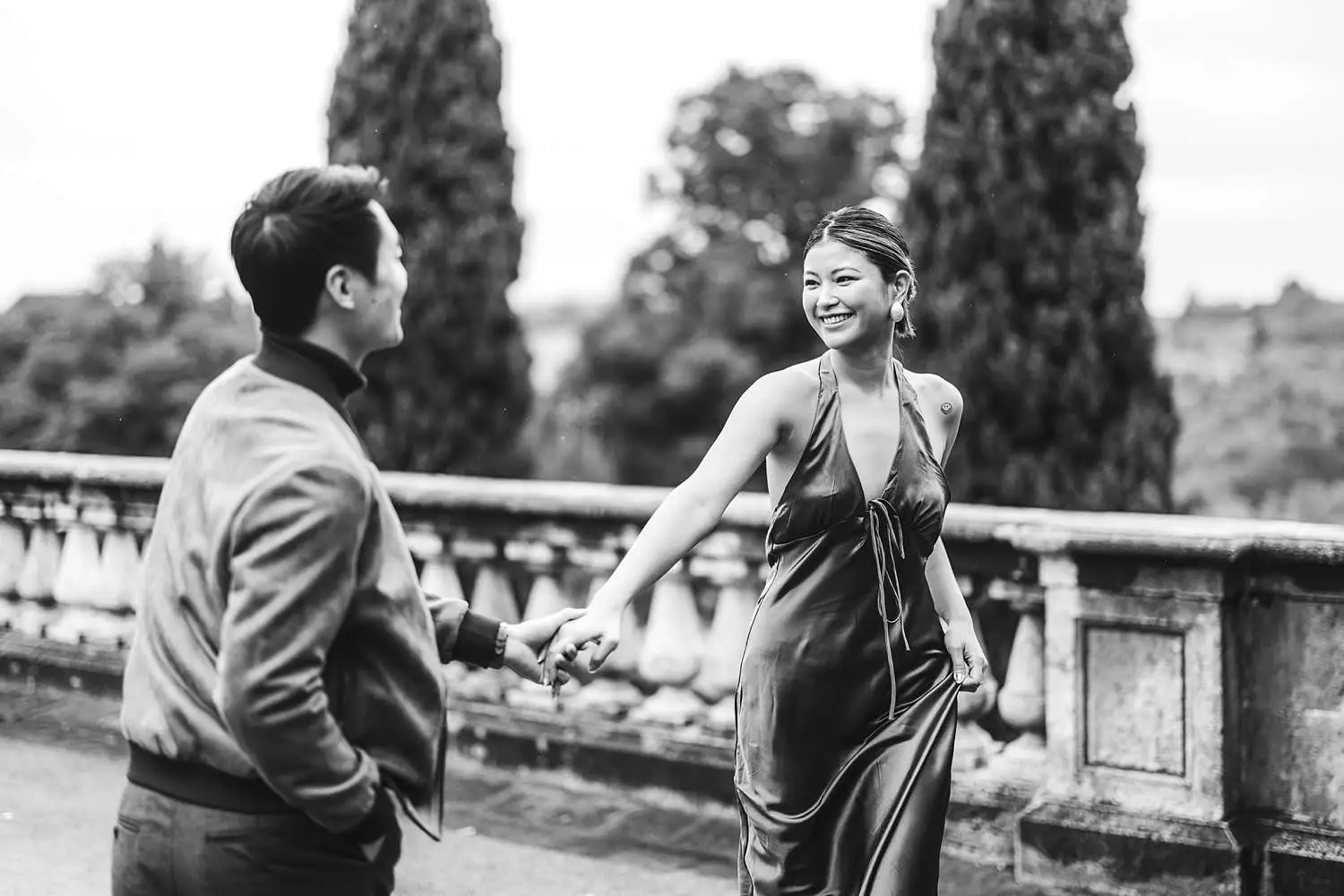 Against the misty skyline of Florence, with the Duomo rising in the distance, the atmosphere became incredibly dreamy. The combination of gentle rain, soft light and the quiet beauty of the terrace created a unique and intimate setting for their engagement photos.