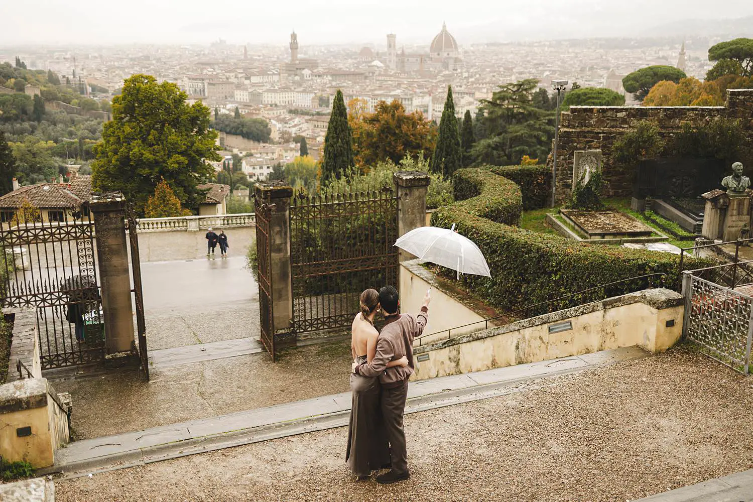 Elly and Alan embraced the moment with elegance, walking together through the paths and gardens of San Miniato while holding transparent umbrellas.