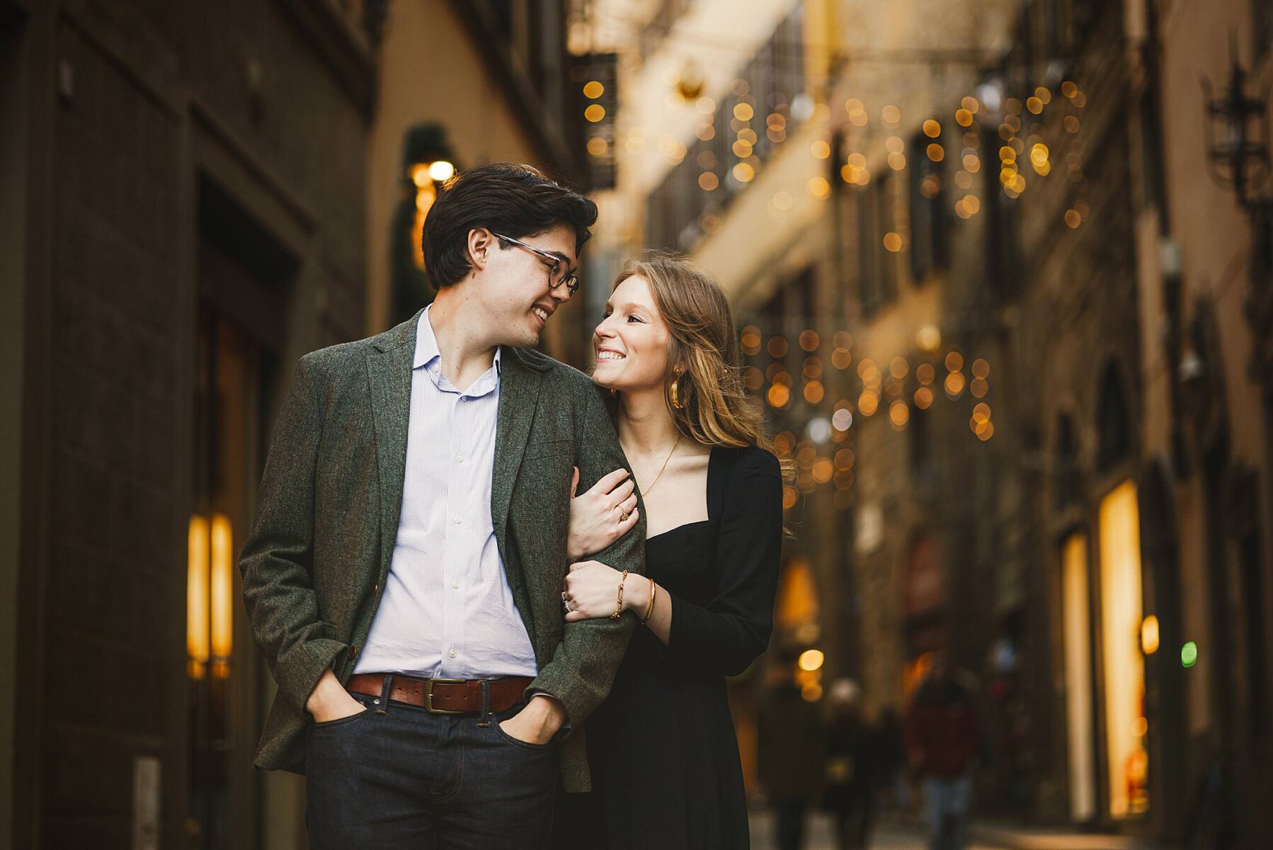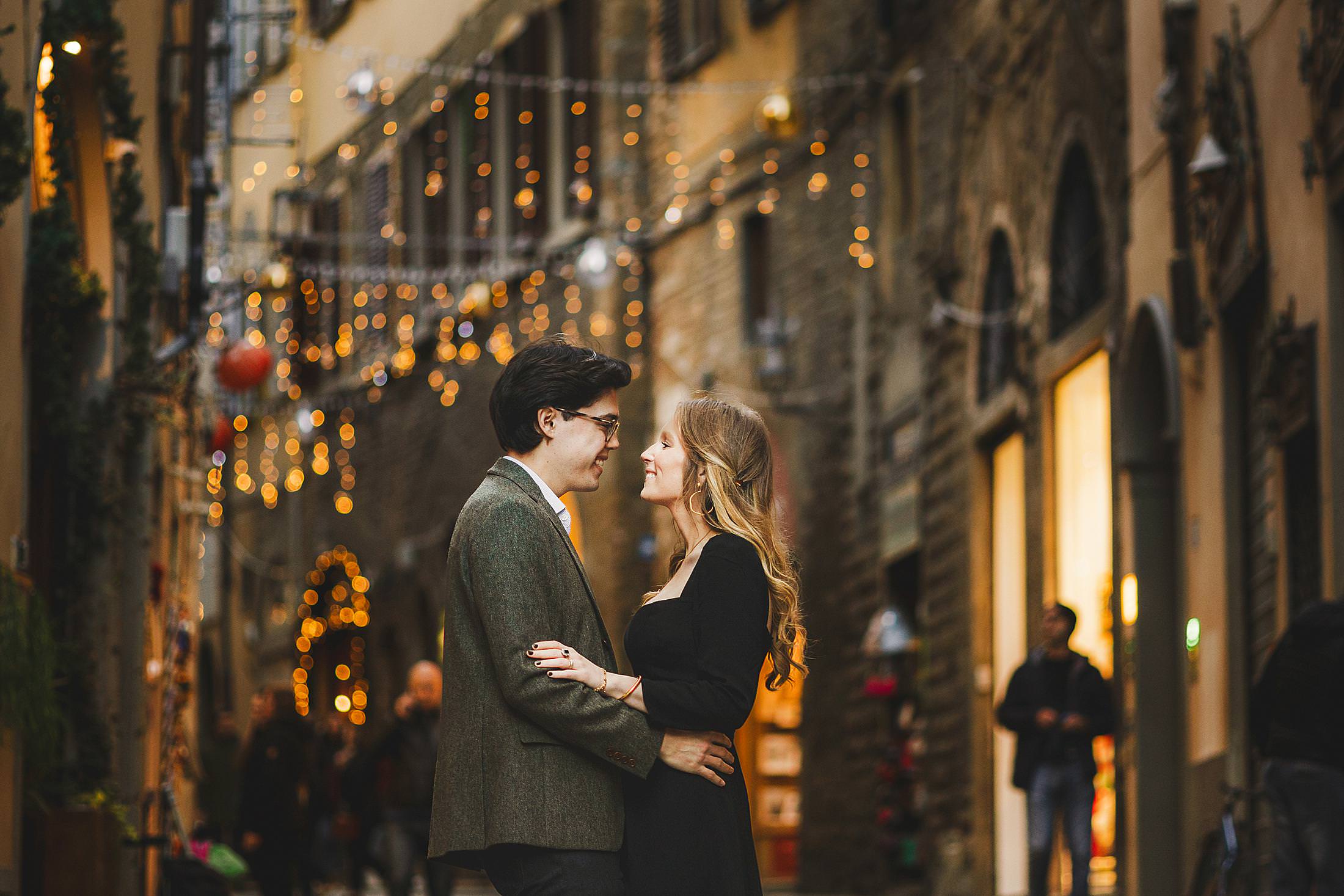 Elegant winter pre-wedding couple photo session in the historic streets of Florence featuring Christmas lights. Photo by the Italian creative and modern engagement photographer in Tuscany based Florence Gabriele Fani