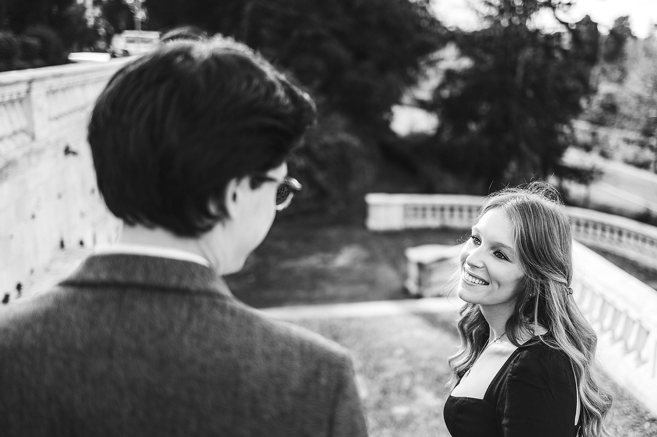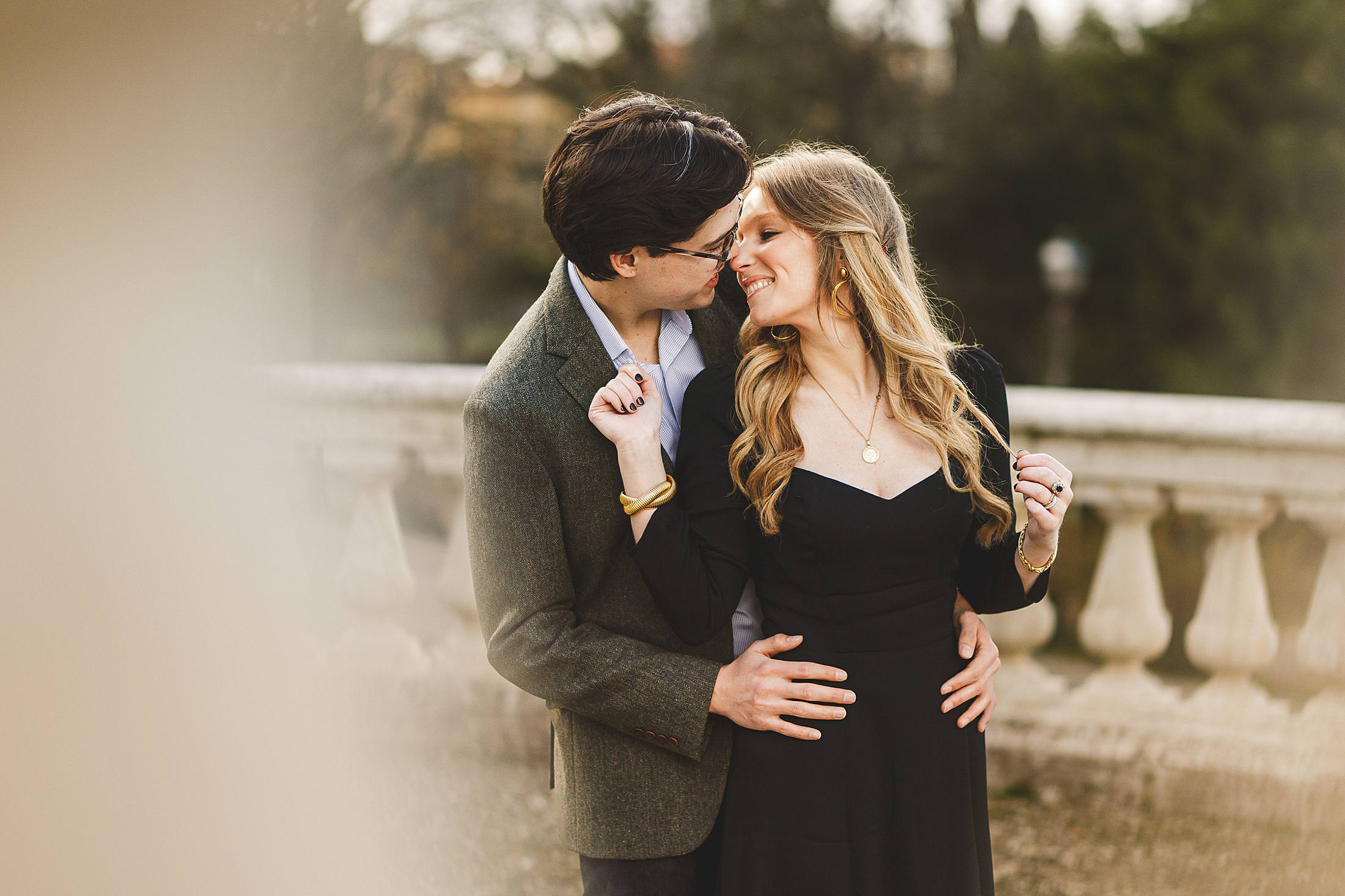 Draped in winter layers but still incredibly stylish, during this winter photoshoot Kate and Cameron radiated a warmth that echoed the holiday spirit. The air, tinged with the scent of the season, carried the promise of festivities as we strolled through the historic paths of San Miniato and iconic spots of the city – such as Ponte Vecchio. Every step, every captured glance, became a brushstroke on a canvas that told not just the story of a couple but also that of the city.