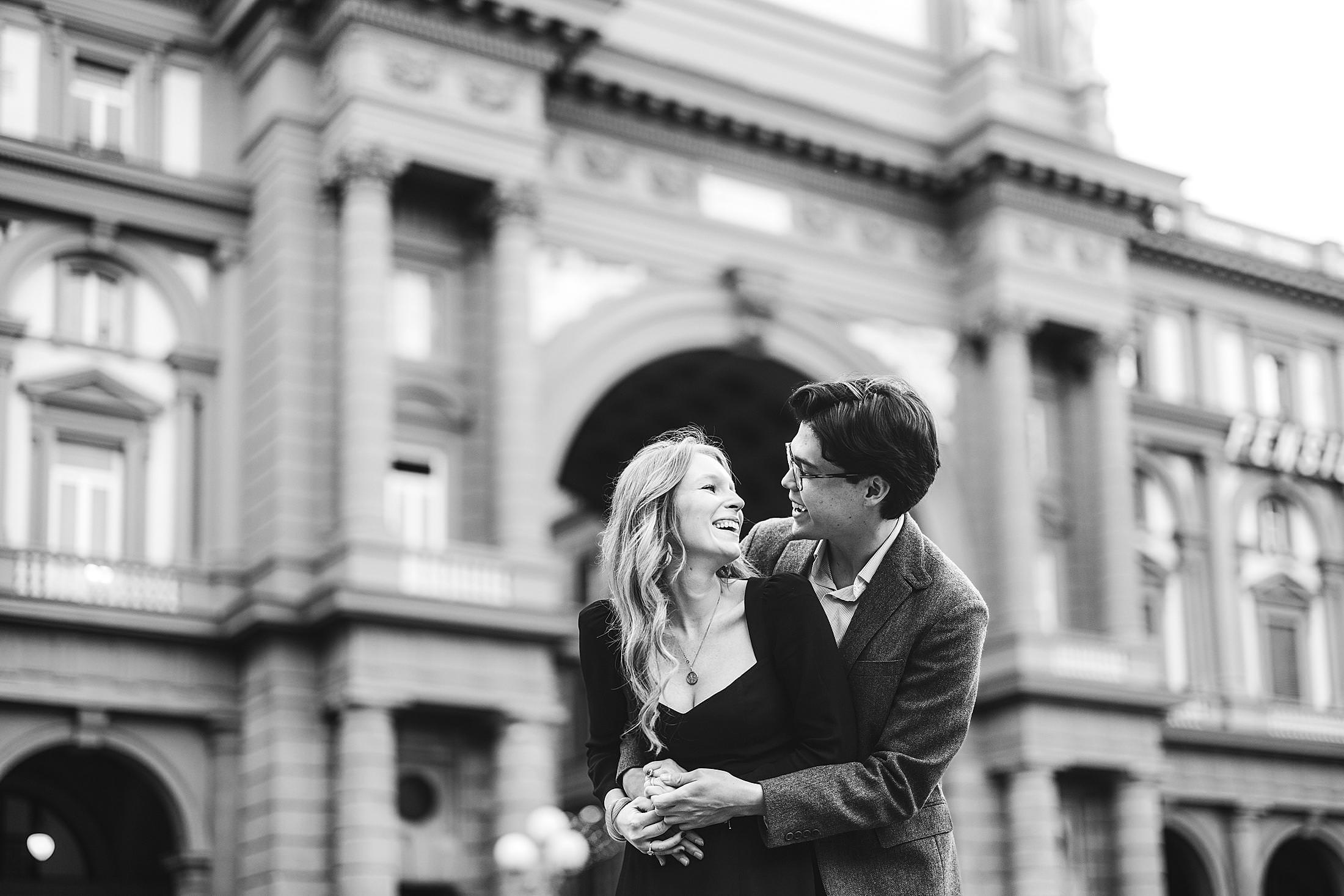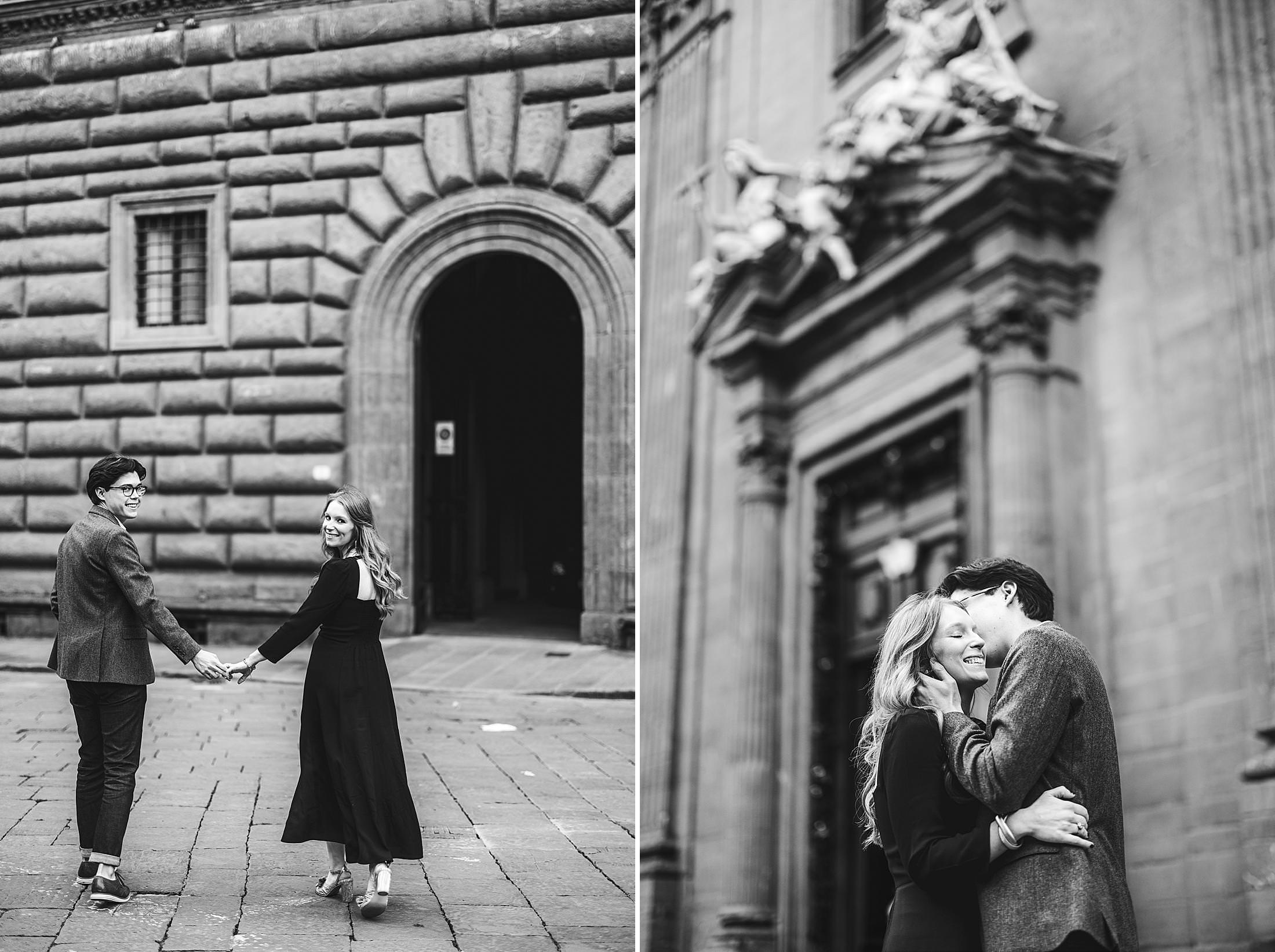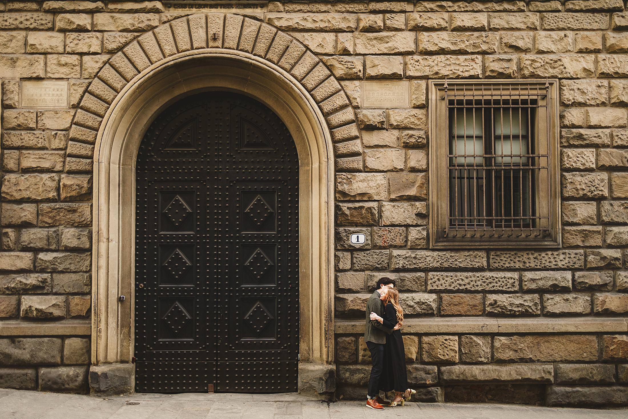 Charming couple portrait in the historic center of Florence featuring the Renaissance architecture. Photo by the Italian creative and modern engagement photographer in Tuscany based Florence Gabriele Fani