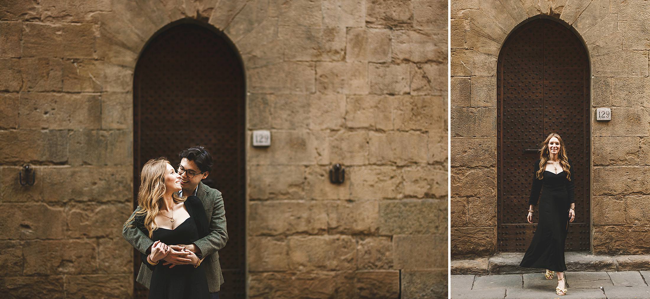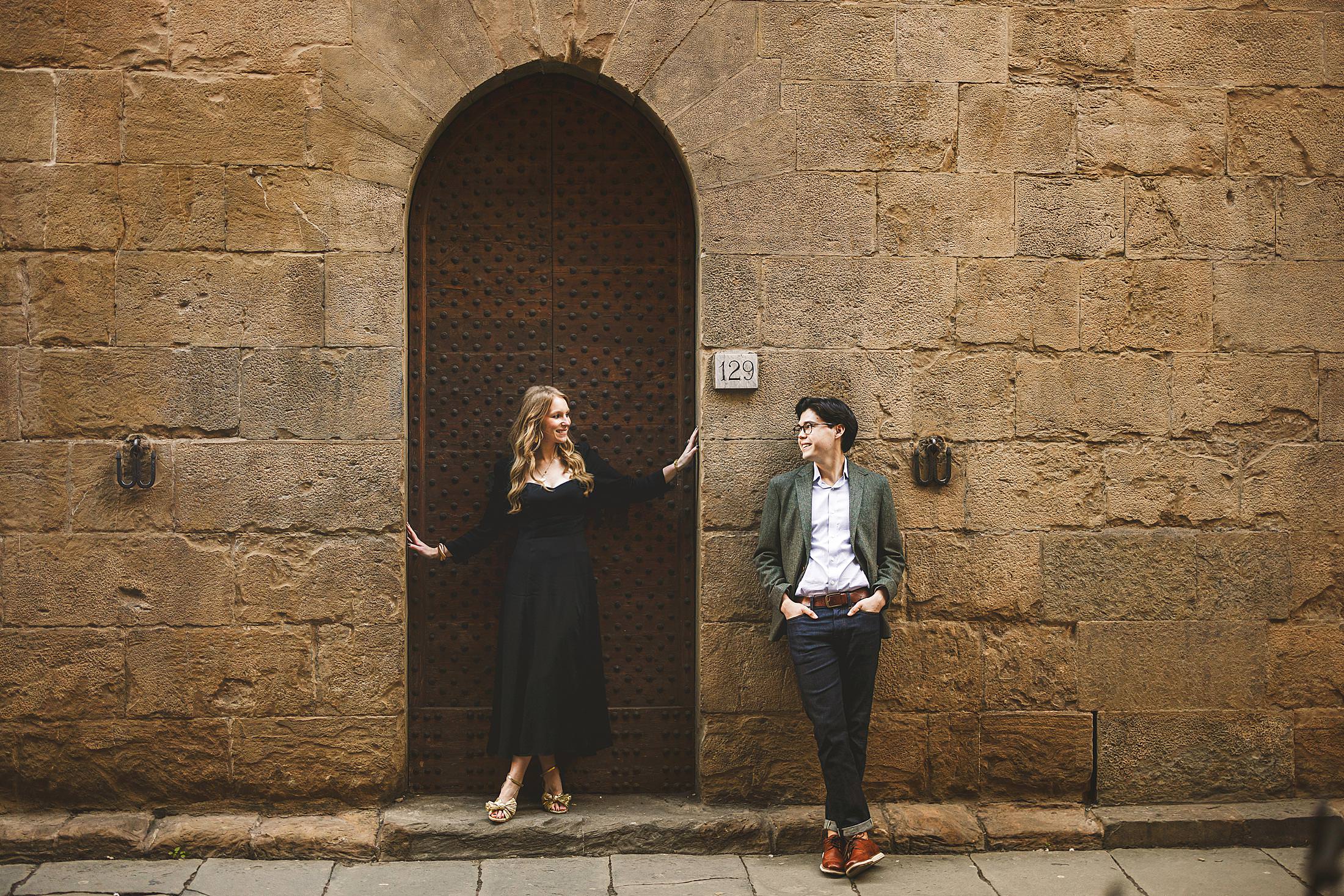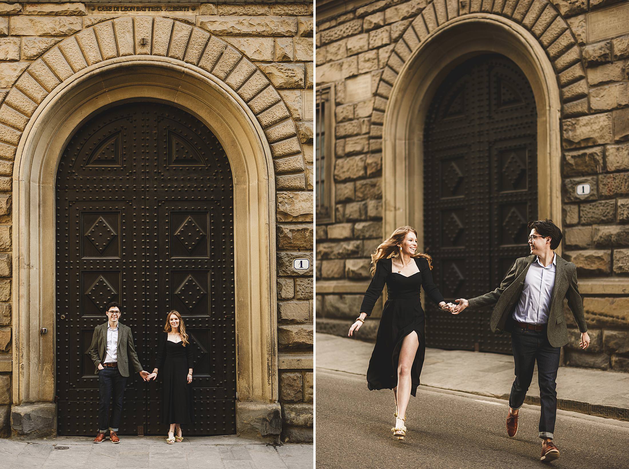 Creative and timeless couple pre-wedding photo in Florence during a walk into the historical streets. Photo by the Italian creative and modern engagement photographer in Tuscany based Florence Gabriele Fani