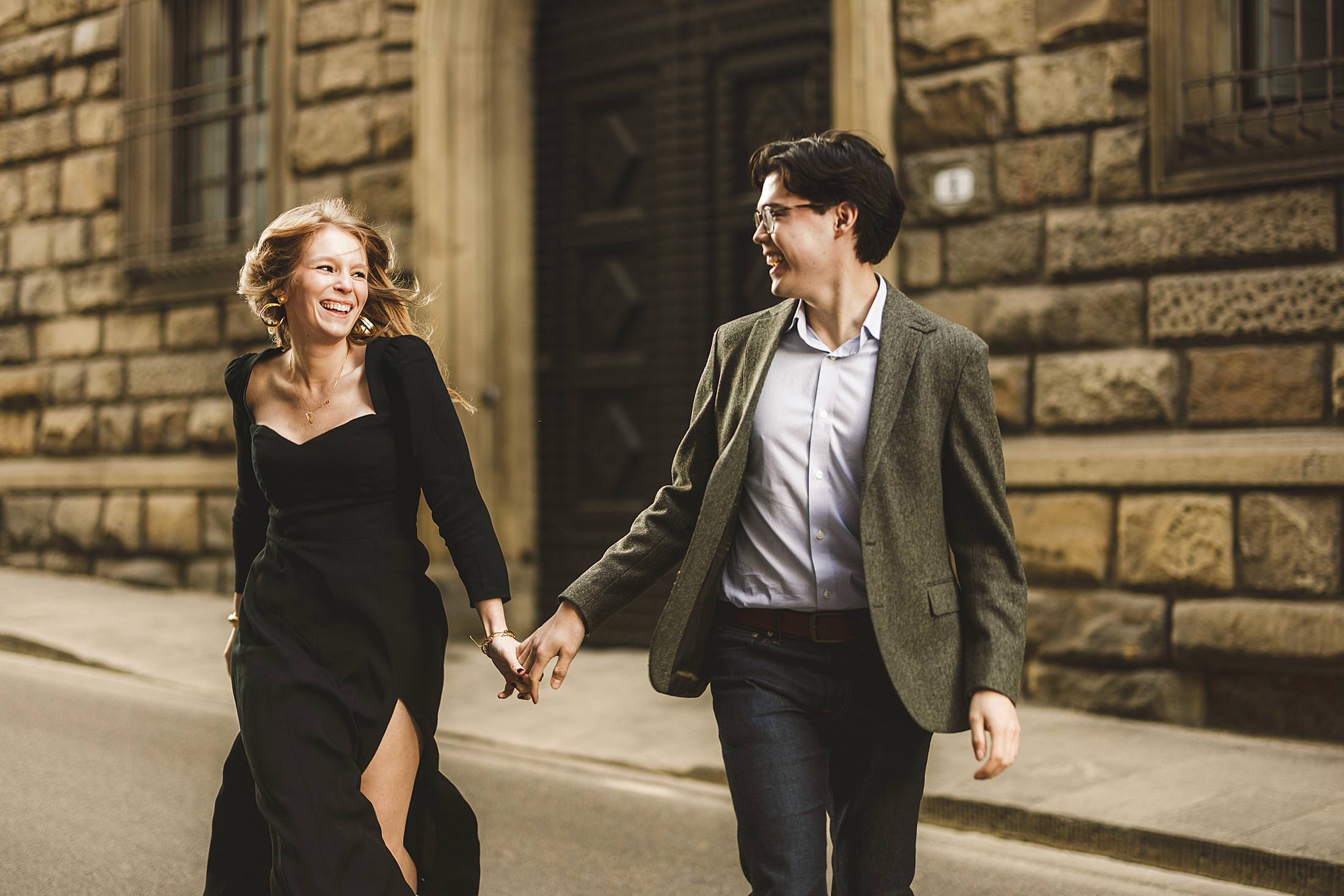 Elegant and romantic candid couple portrait during a walk tour in the streets of Florence the Cradle of Renaissaince. Photo by the Italian creative and modern engagement photographer in Tuscany based Florence Gabriele Fani