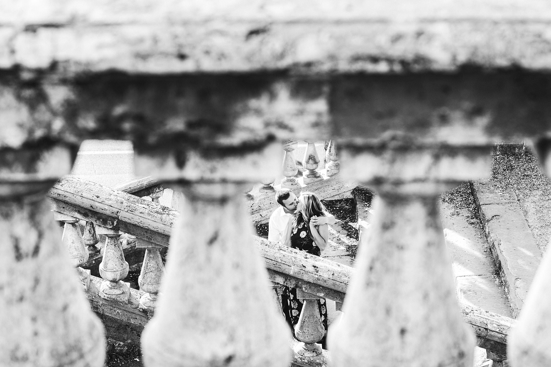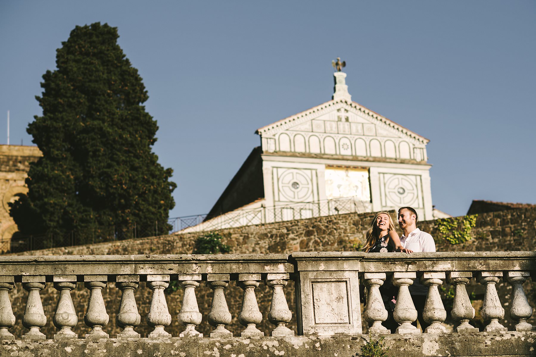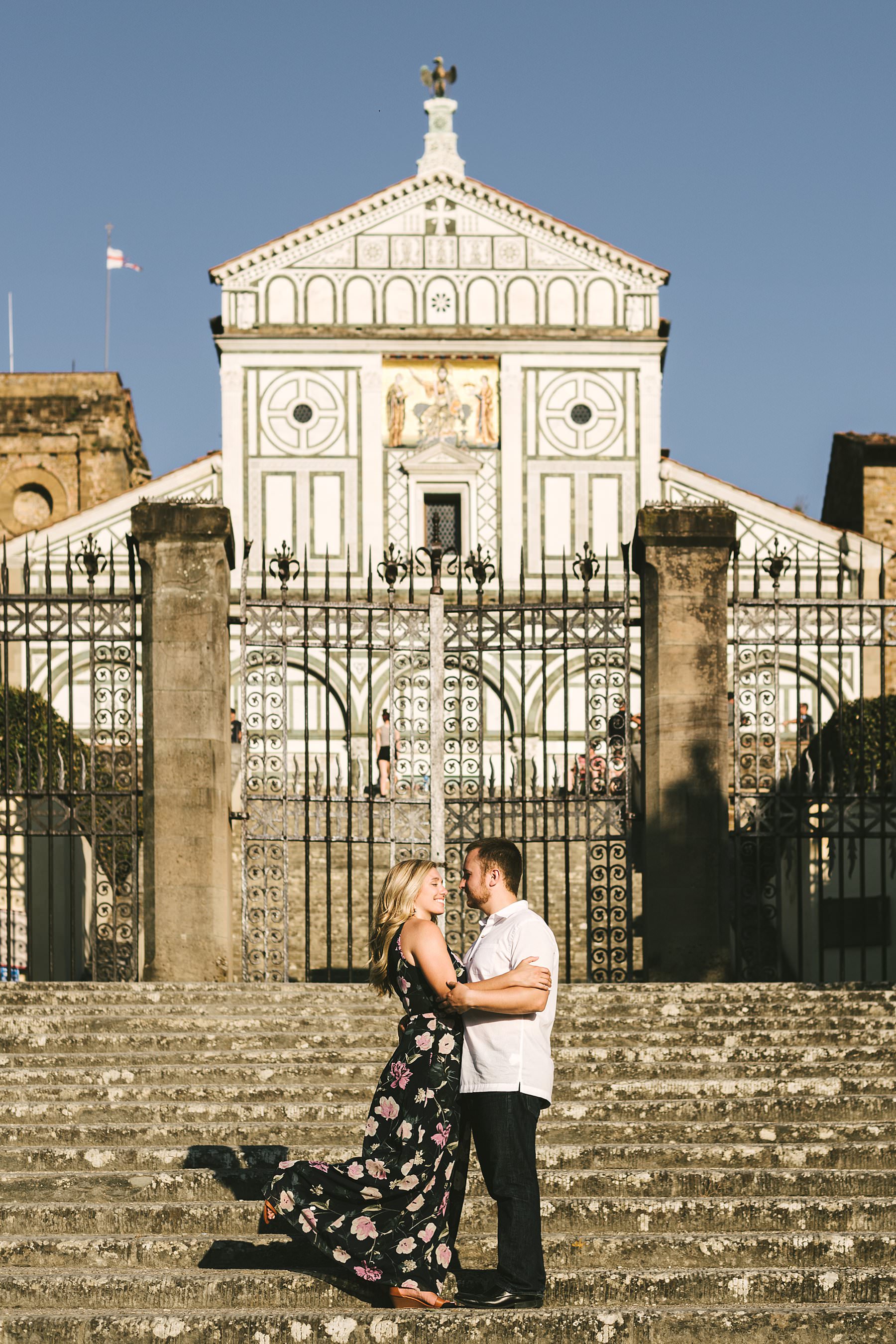 Exciting and fun engagement couple portrait photo shoot in Florence. We went to San Miniato al Monte, which offers one of the best views over the city as well as some stunning architecture. Photo by the Italian creative, elegant and modern vacation engagement photographer in Tuscany based in Florence Gabriele Fani