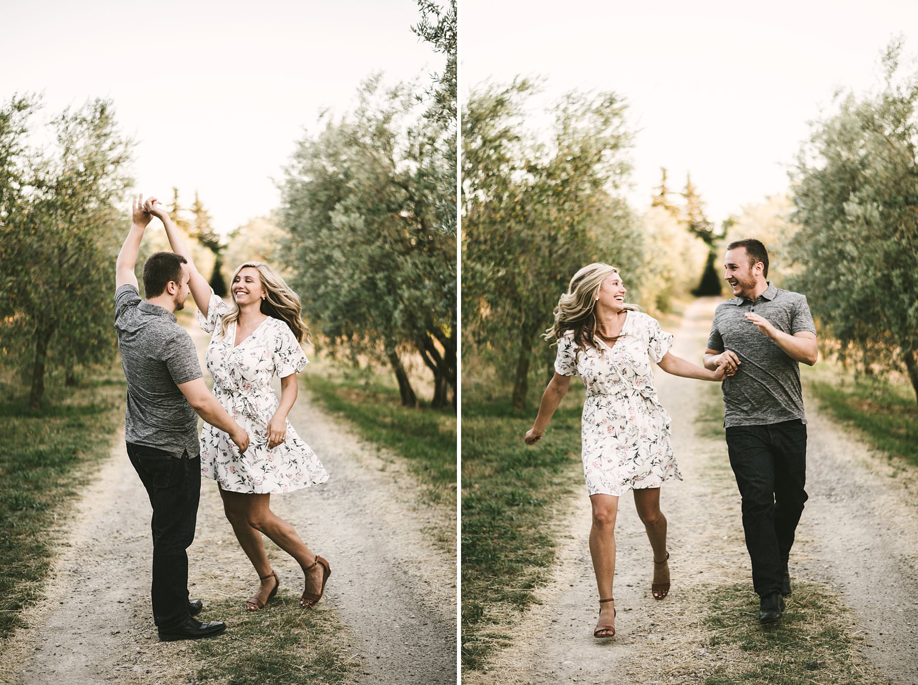 Delicate outdoor engagement photos in Tuscany: a holiday to remember. Discover the magic of Chianti. Outdoor engagement photos in the charming Florence and breathtaking Chianti are the perfect way to celebrate a special and meaningful holiday. The countryside is a sequence of green and gold rolling hills, covered in vineyards and olive groves. A landscape that feels like a fairytale will embrace you while you express your love to each other. Just like Andrea and Aaron who danced, laughed, kissed, hugged and enjoyed every minute of the shooting in such a magical location, caressed by the warm sunset light. Photo by the Italian creative, elegant and modern vacation engagement photographer in Tuscany based in Florence Gabriele Fani