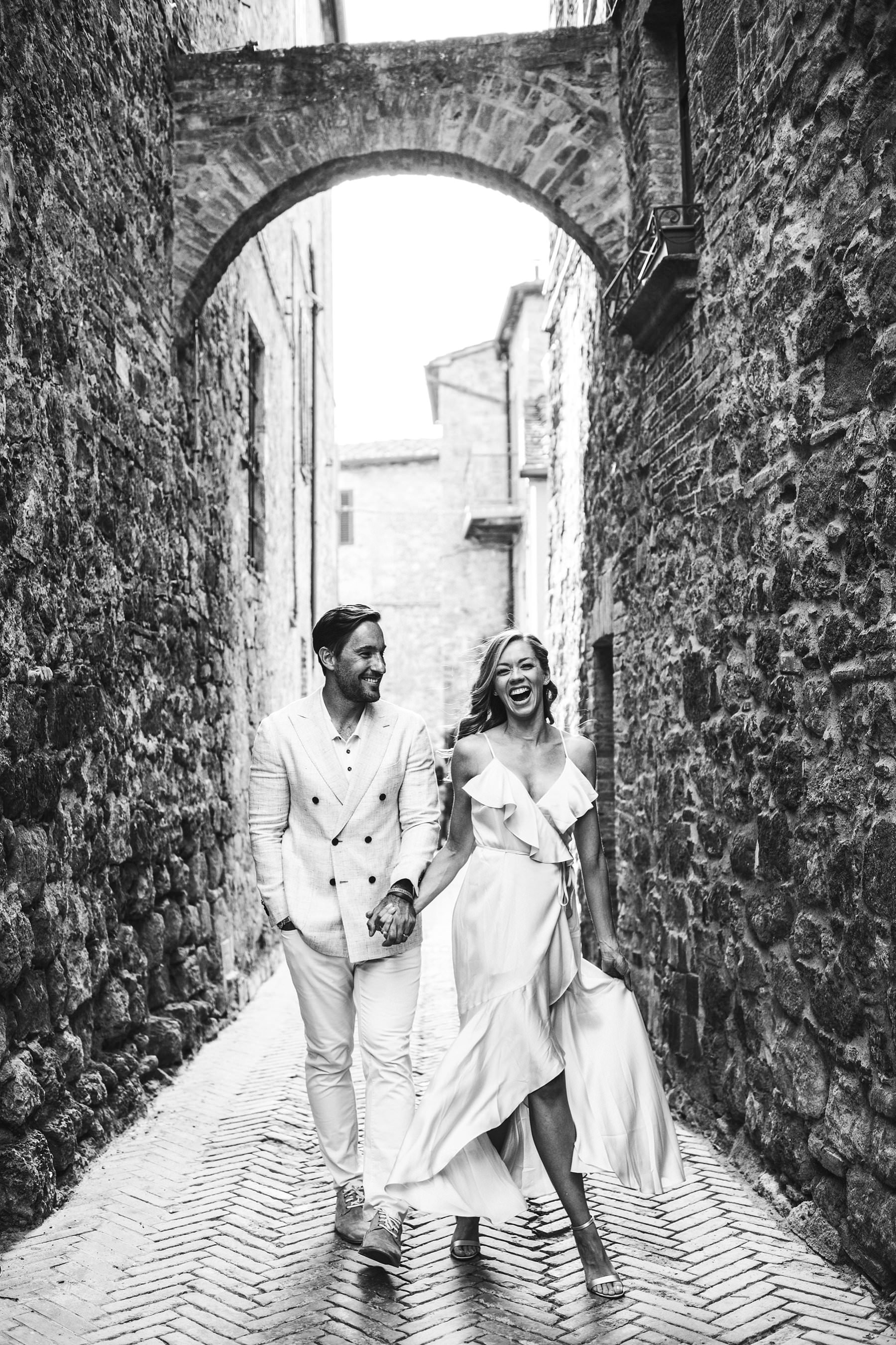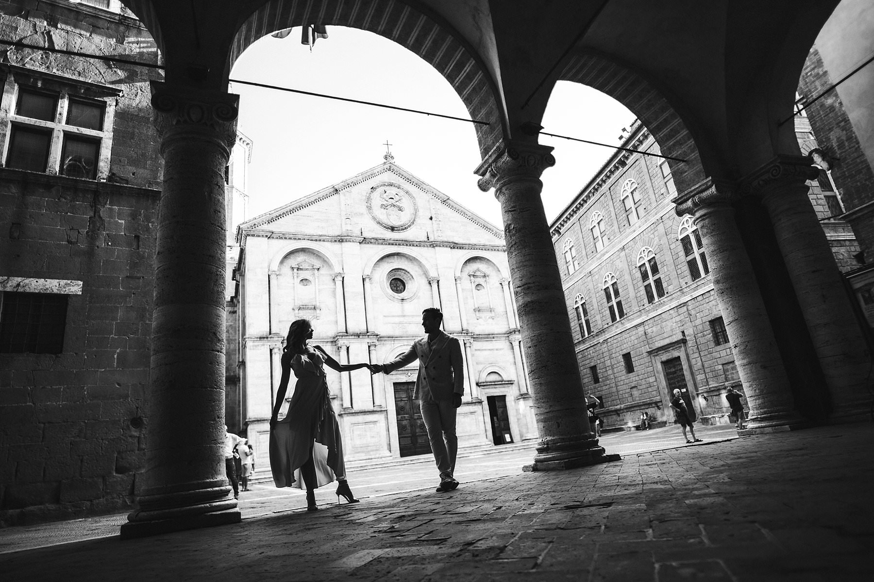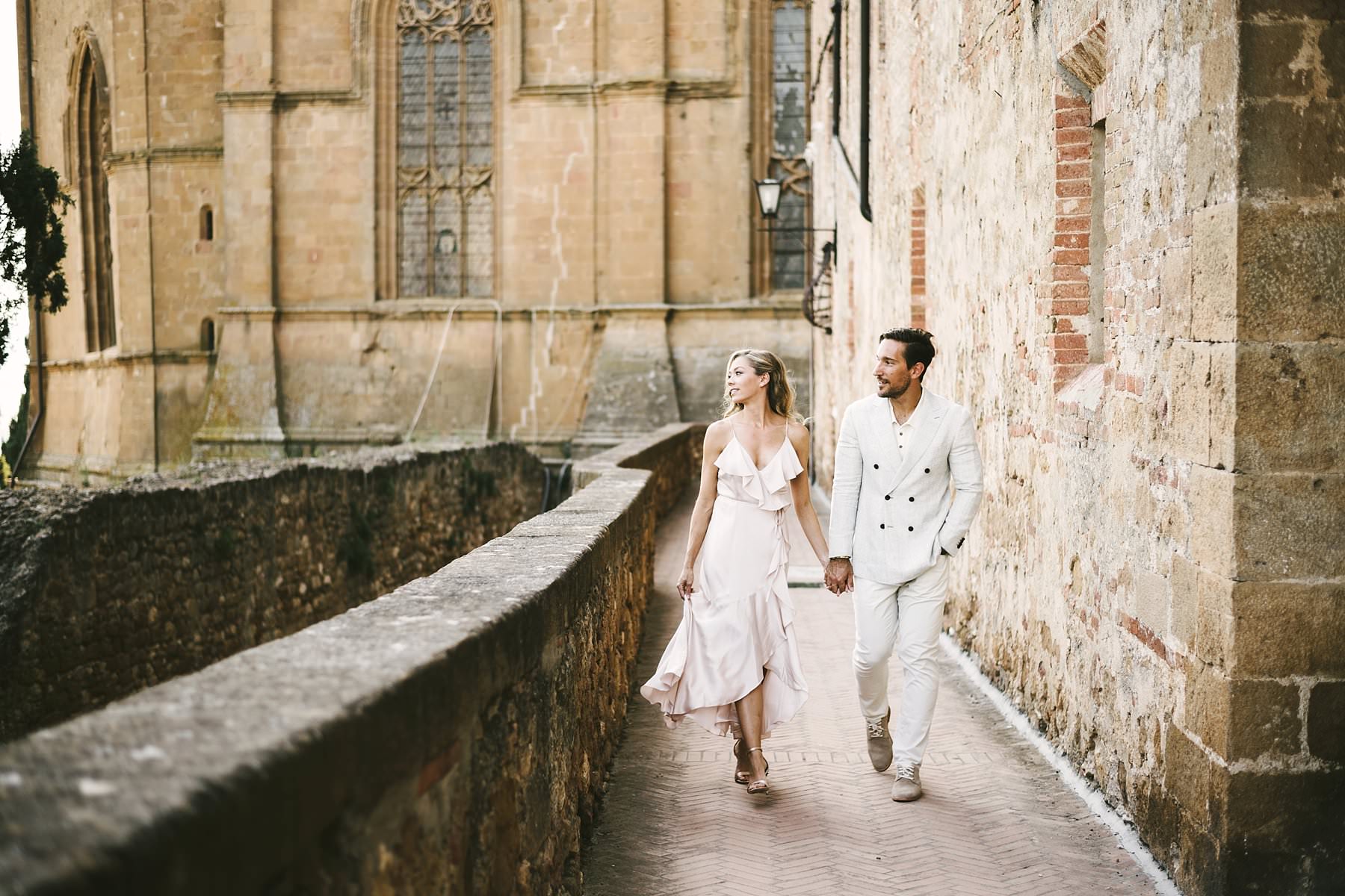 Romantic walk tour couple portrait honeymoon photo session in the historic town of Pienza. Photo by the Italian elegant, creative and modern Tuscany photographer based Florence Gabriele Fani.