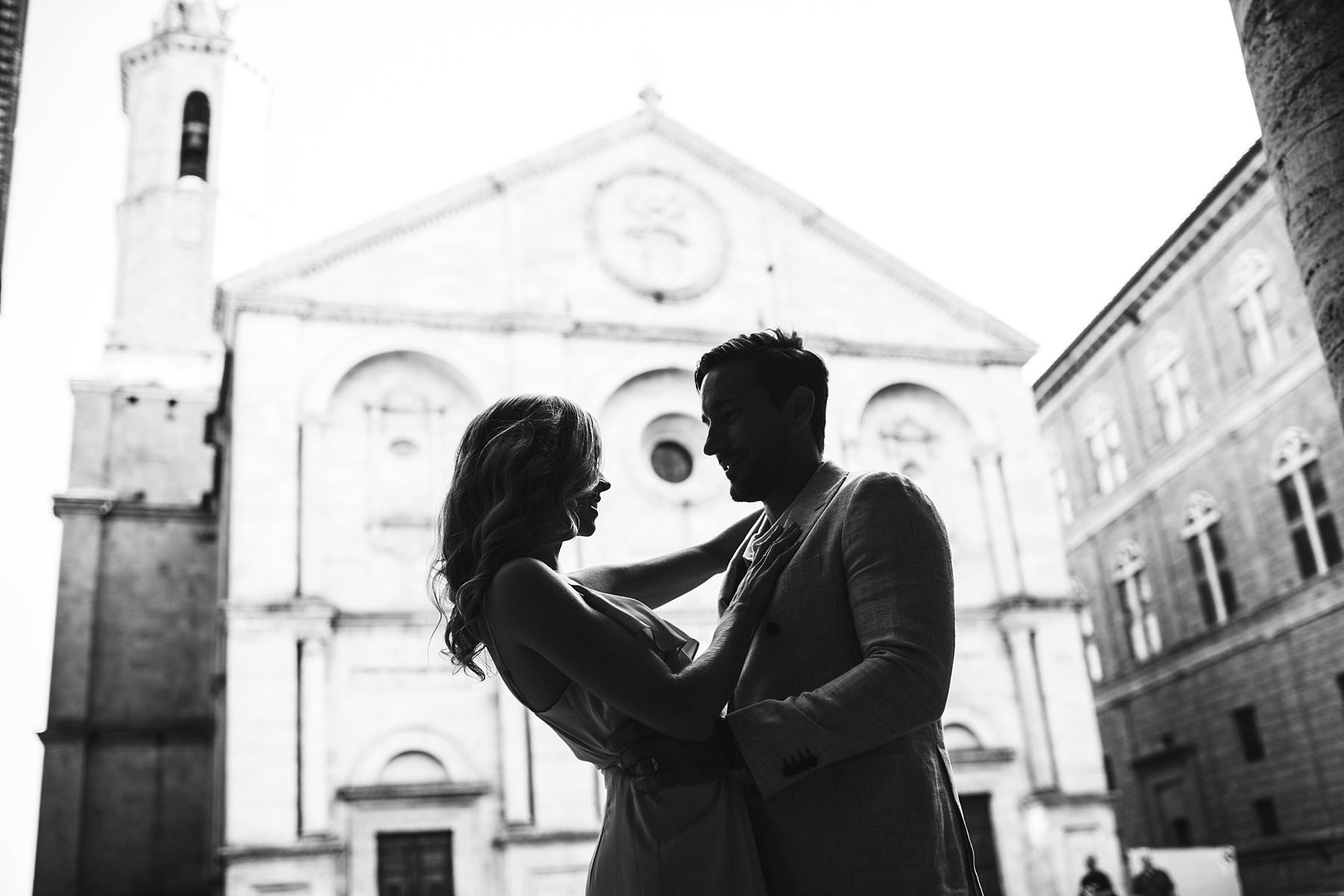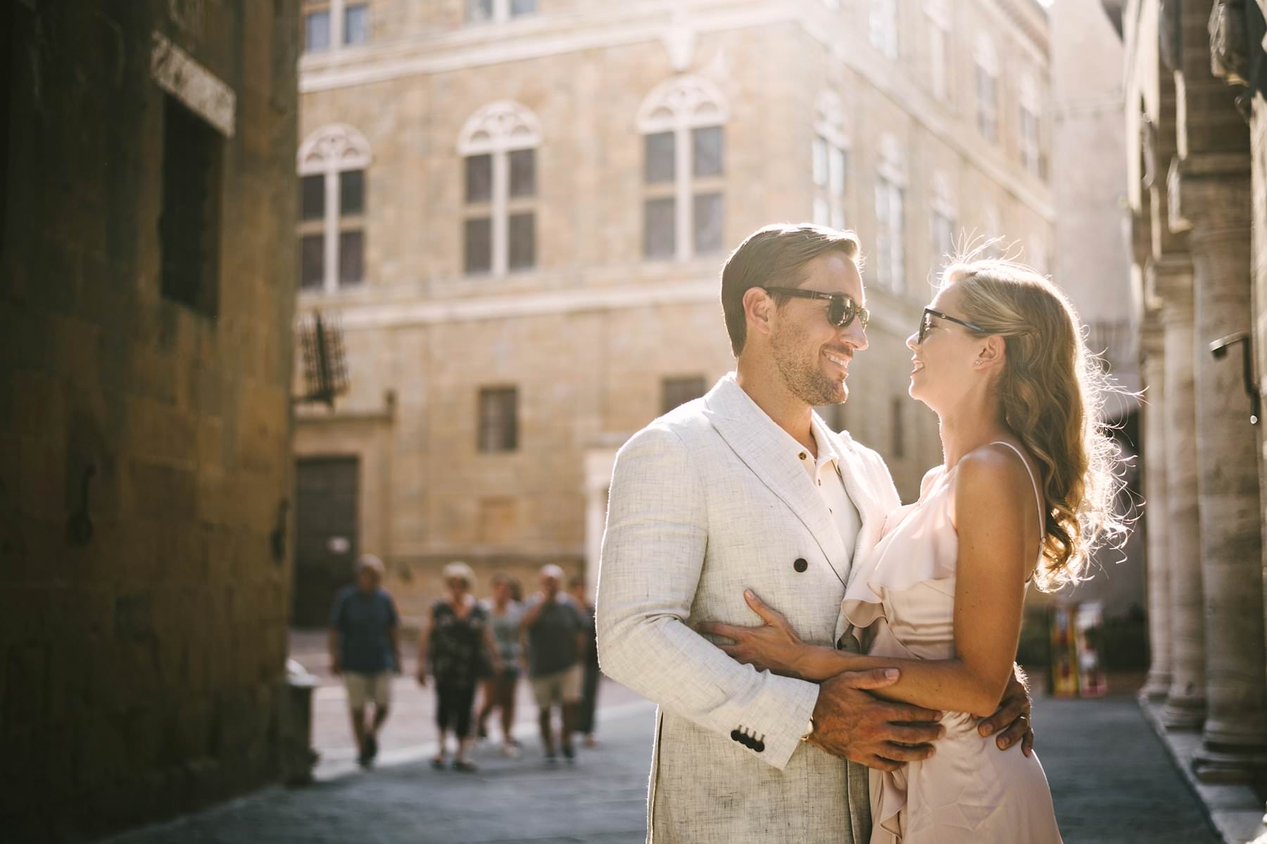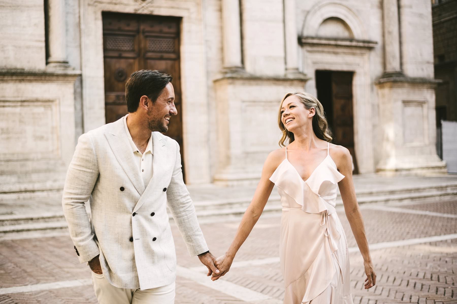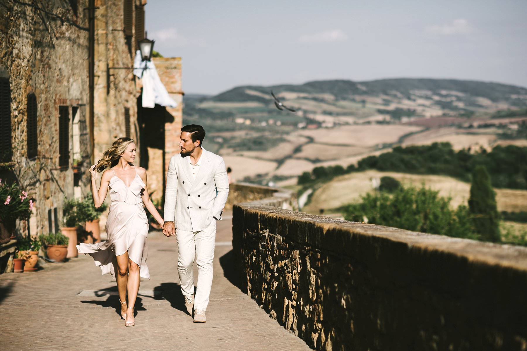 Romantic walk tour couple portrait honeymoon photo session in the historic town of Pienza. Photo by the Italian elegant, creative and modern Tuscany photographer based Florence Gabriele Fani.