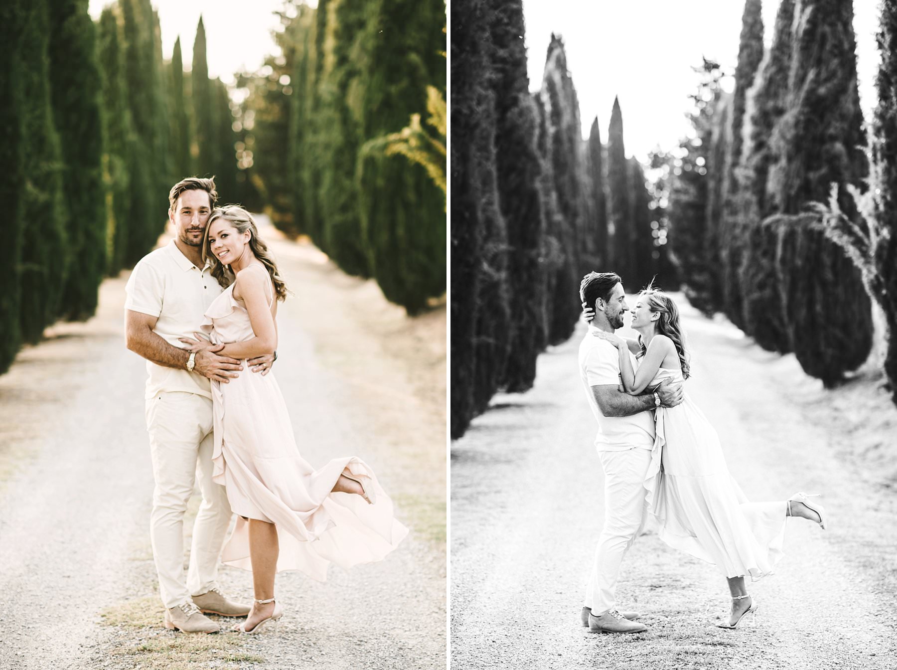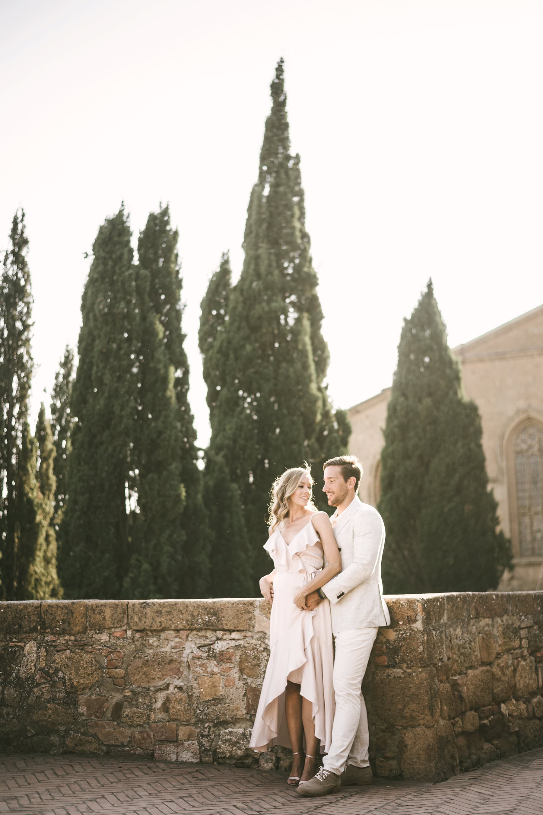 Lovely tuscan typical couple photo with cypress in the background in the town of Pienza. Photo by the Italian elegant, creative and modern Tuscany photographer based Florence Gabriele Fani.