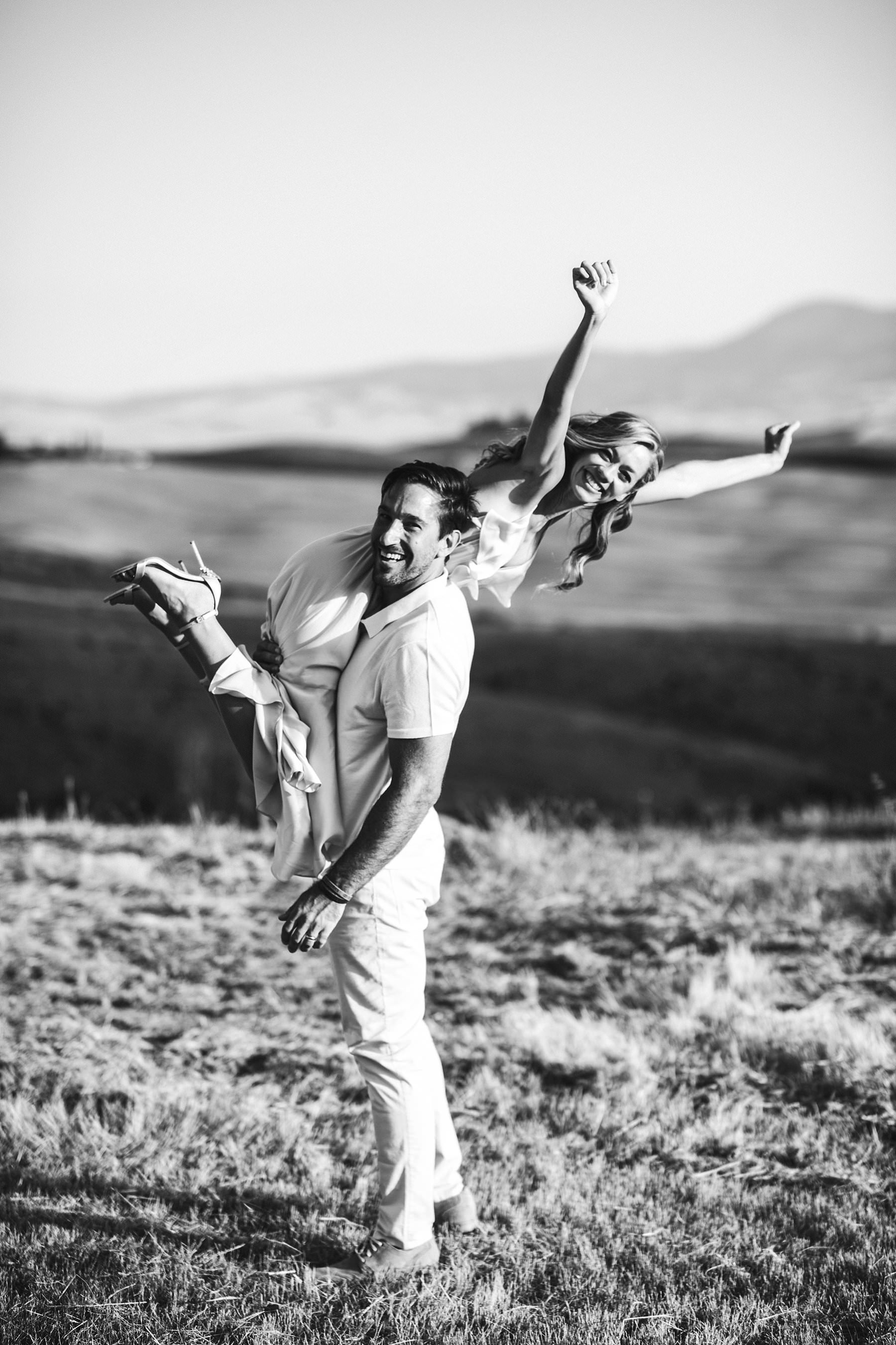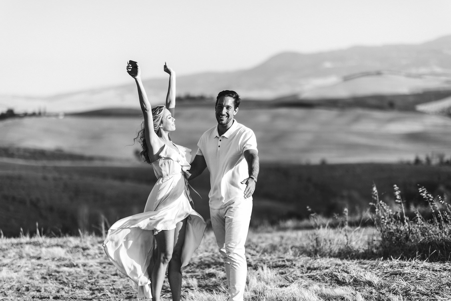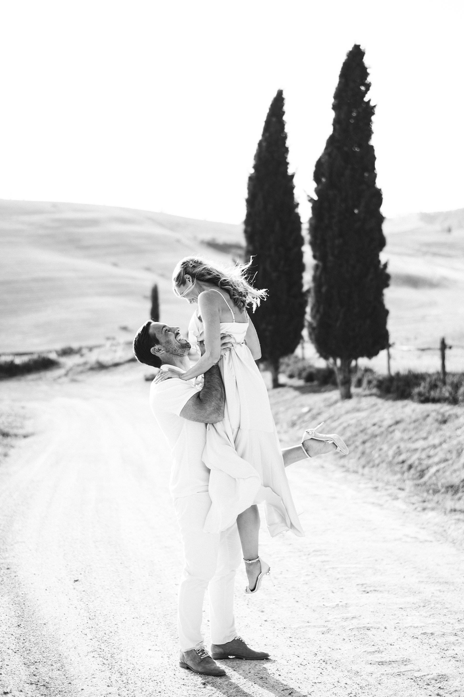 Exciting couple portrait honeymoon photo in Val D’Orcia, the best countryside area of Tuscany. Photo by the Italian elegant, creative and modern Tuscany photographer based Florence Gabriele Fani.