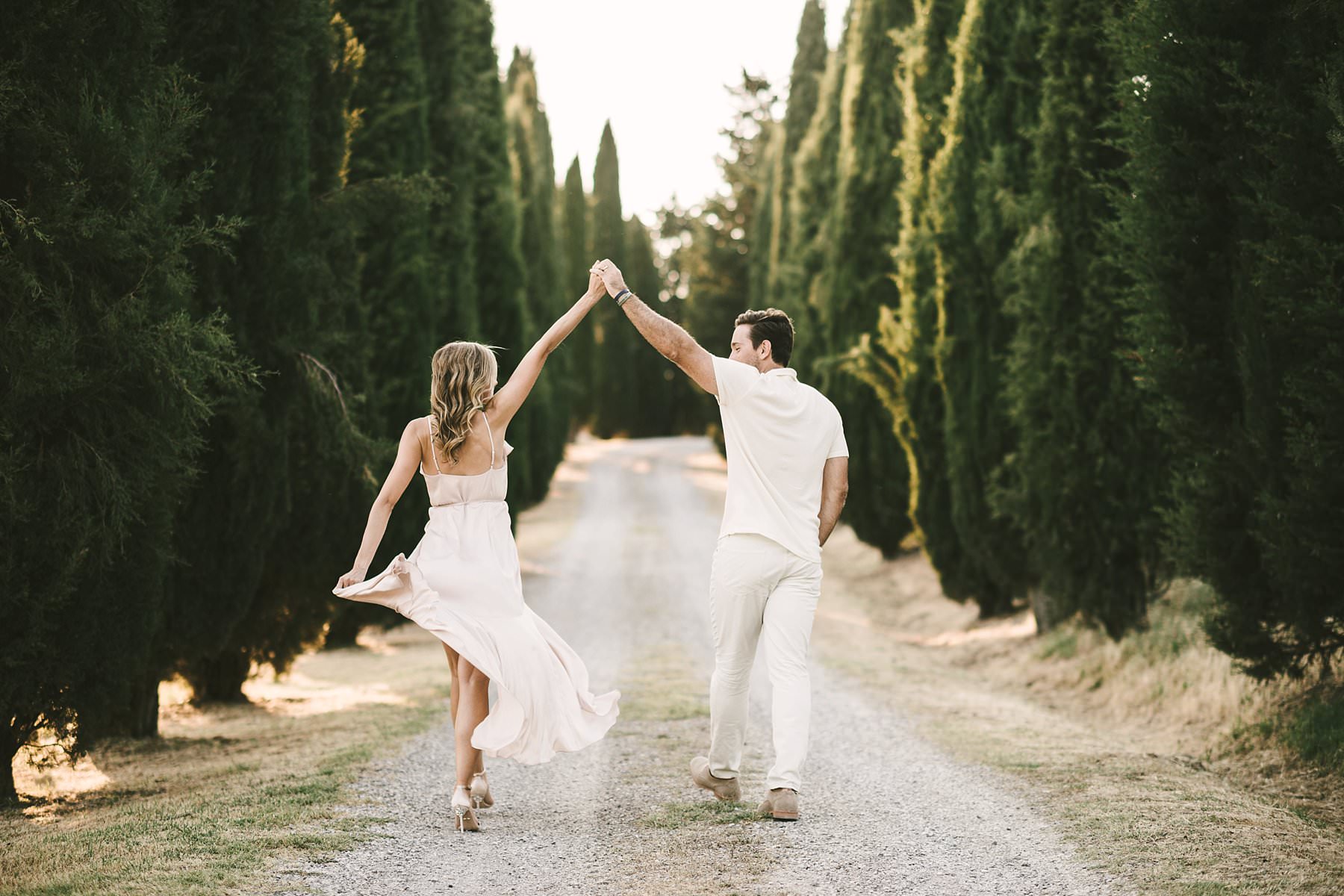 Elegant and romantic engagement experience in the Val D’Orcia area of Tuscany near Pienza with cypresses street in the countryside. Photo by the Italian elegant, creative and modern Tuscany photographer based Florence Gabriele Fani.