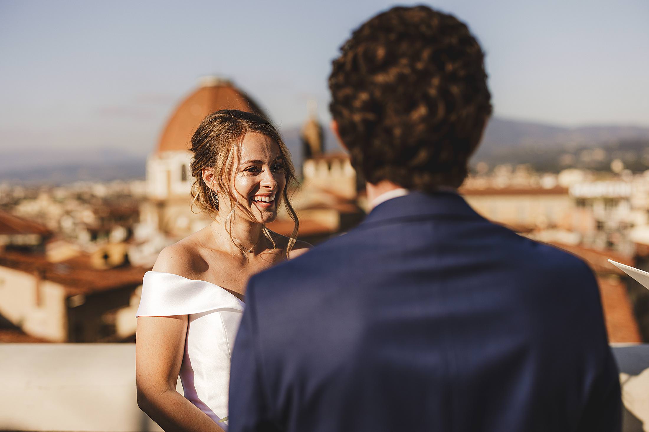 Smiling and elegant bride elopement portrait at La Terrazza sul Duomo. Photo by the Italian elegant elopement photographer in Florence Gabriele Fani
