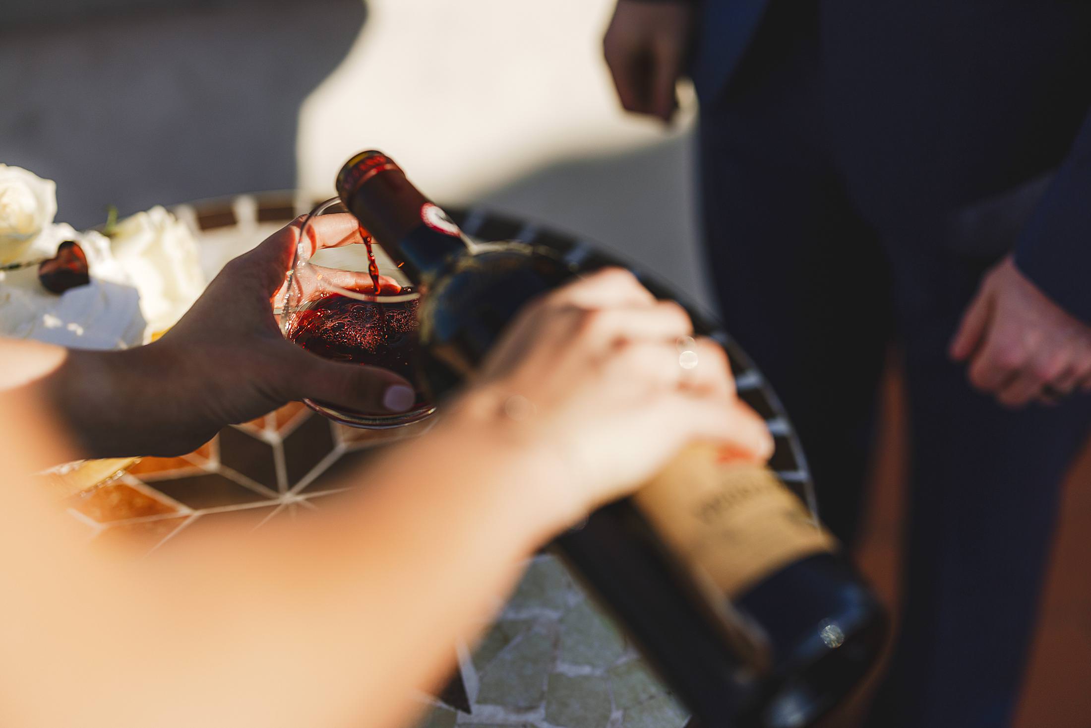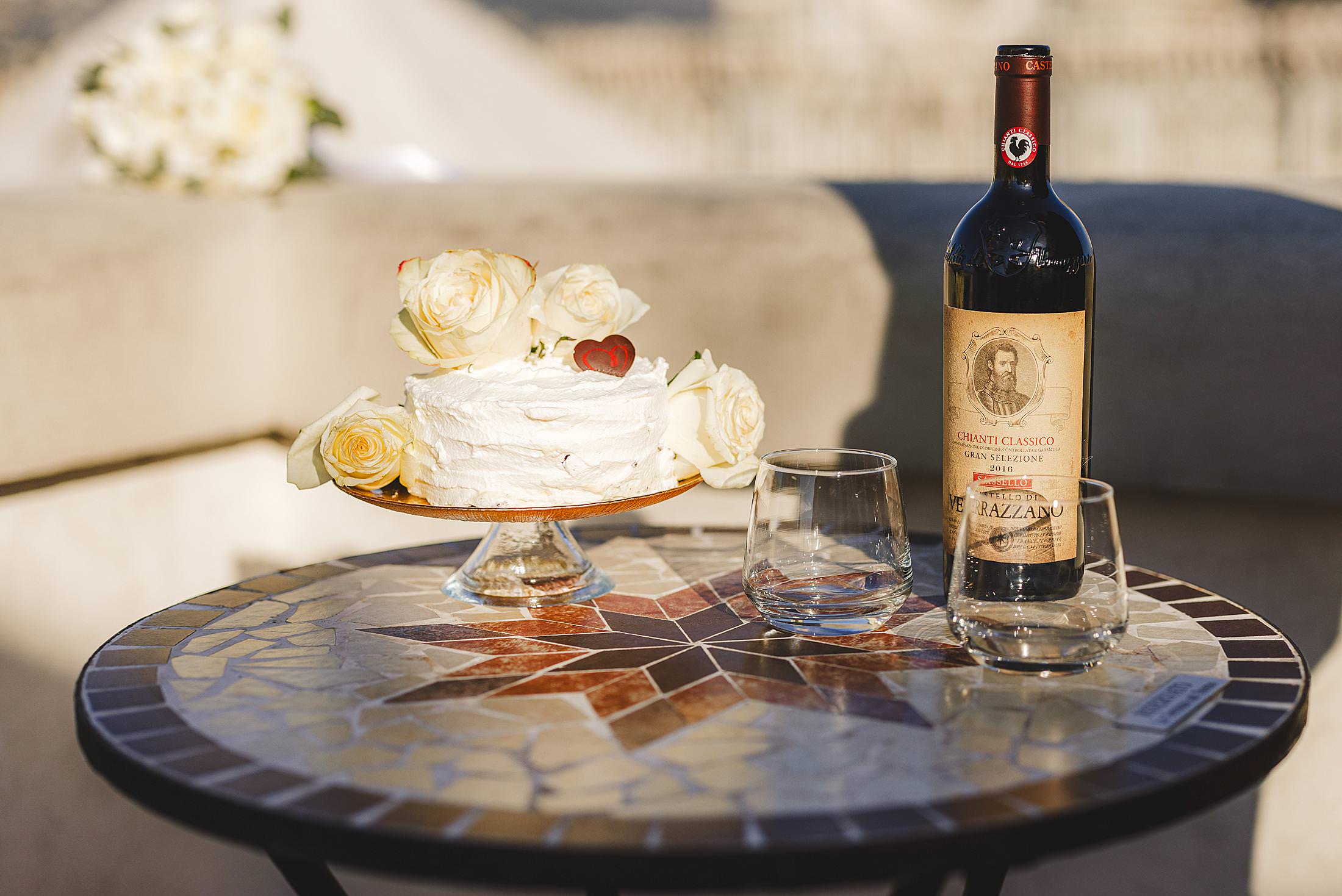 Unforgettable elopement ceremony setup with a glass of Chianti Classico Gran Selezione, a refined touch that perfectly embodied the spirit of Tuscany, and a cute little cake at Terrazza sul Duomo venue. Photo by the Italian elegant elopement photographer in Florence Gabriele Fani