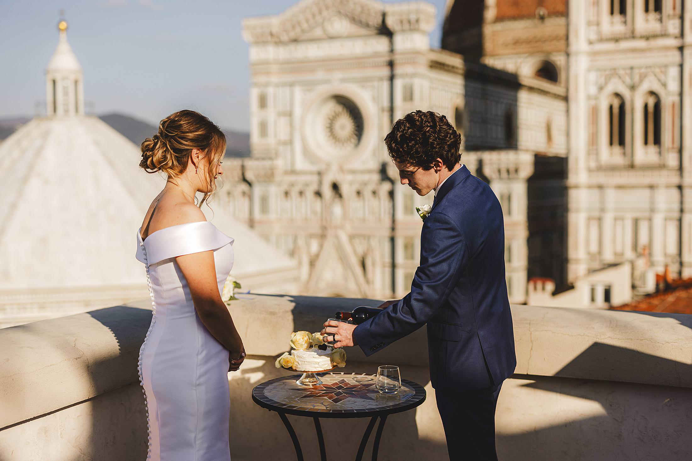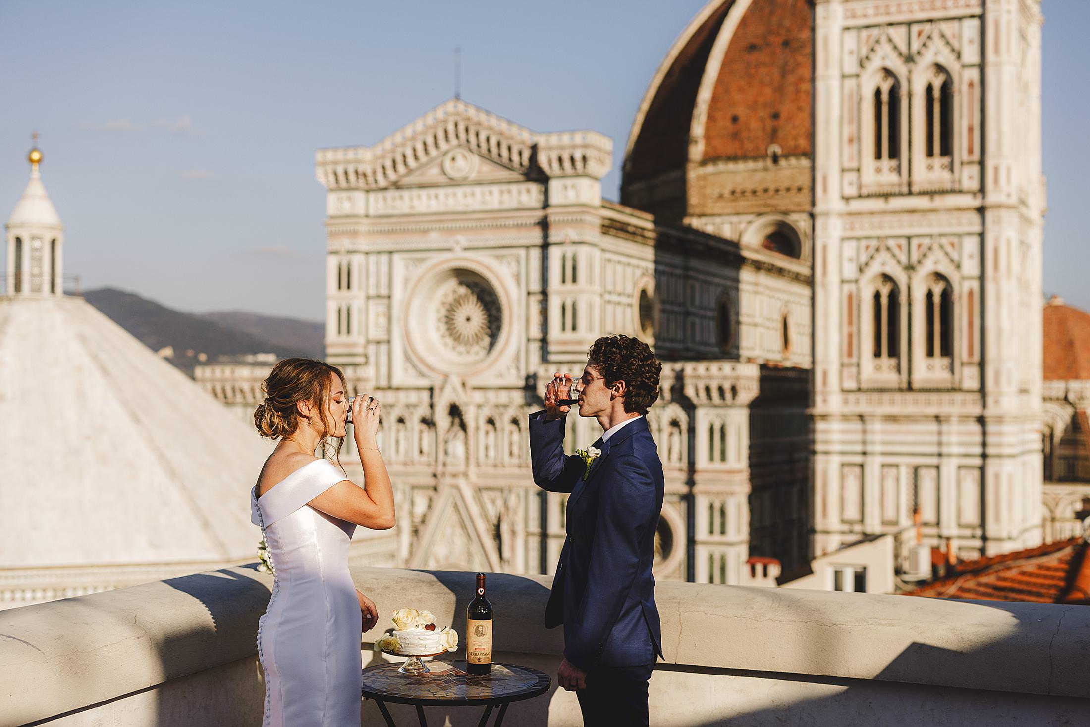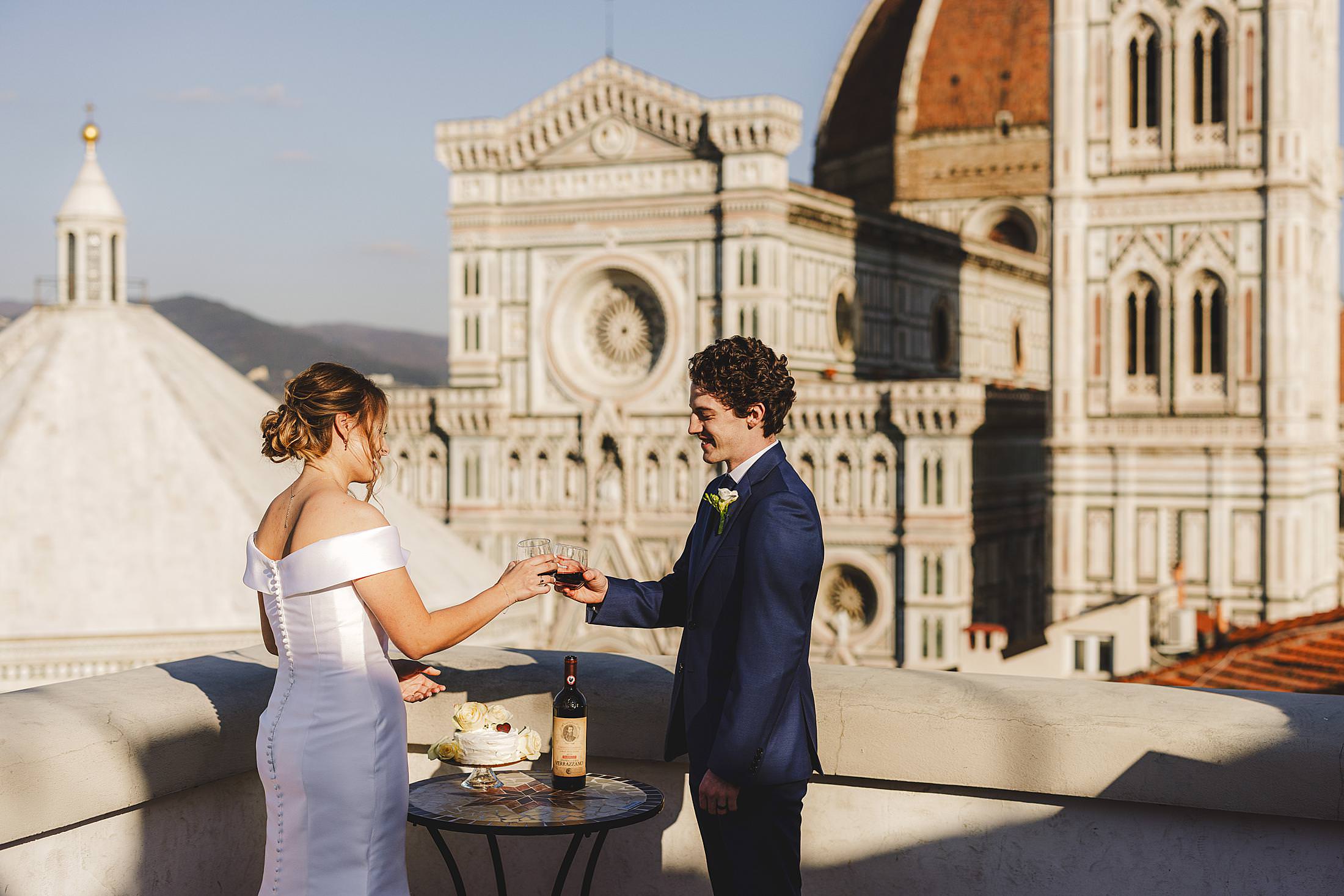 A toast to forever, overlooking the Duomo. Elopement wedding in the heart of Florence. Photo by the Italian elegant elopement photographer in Florence Gabriele Fani
