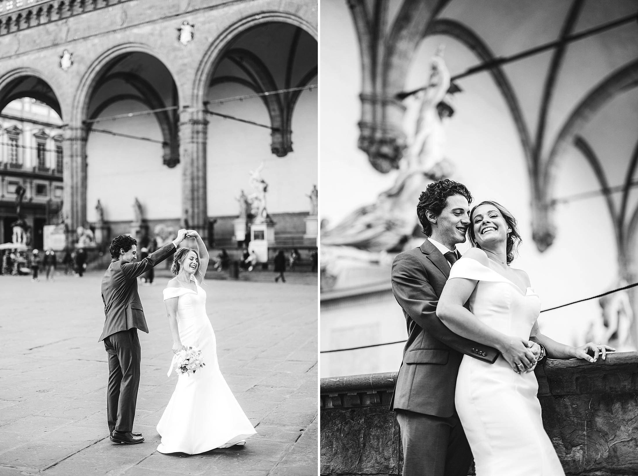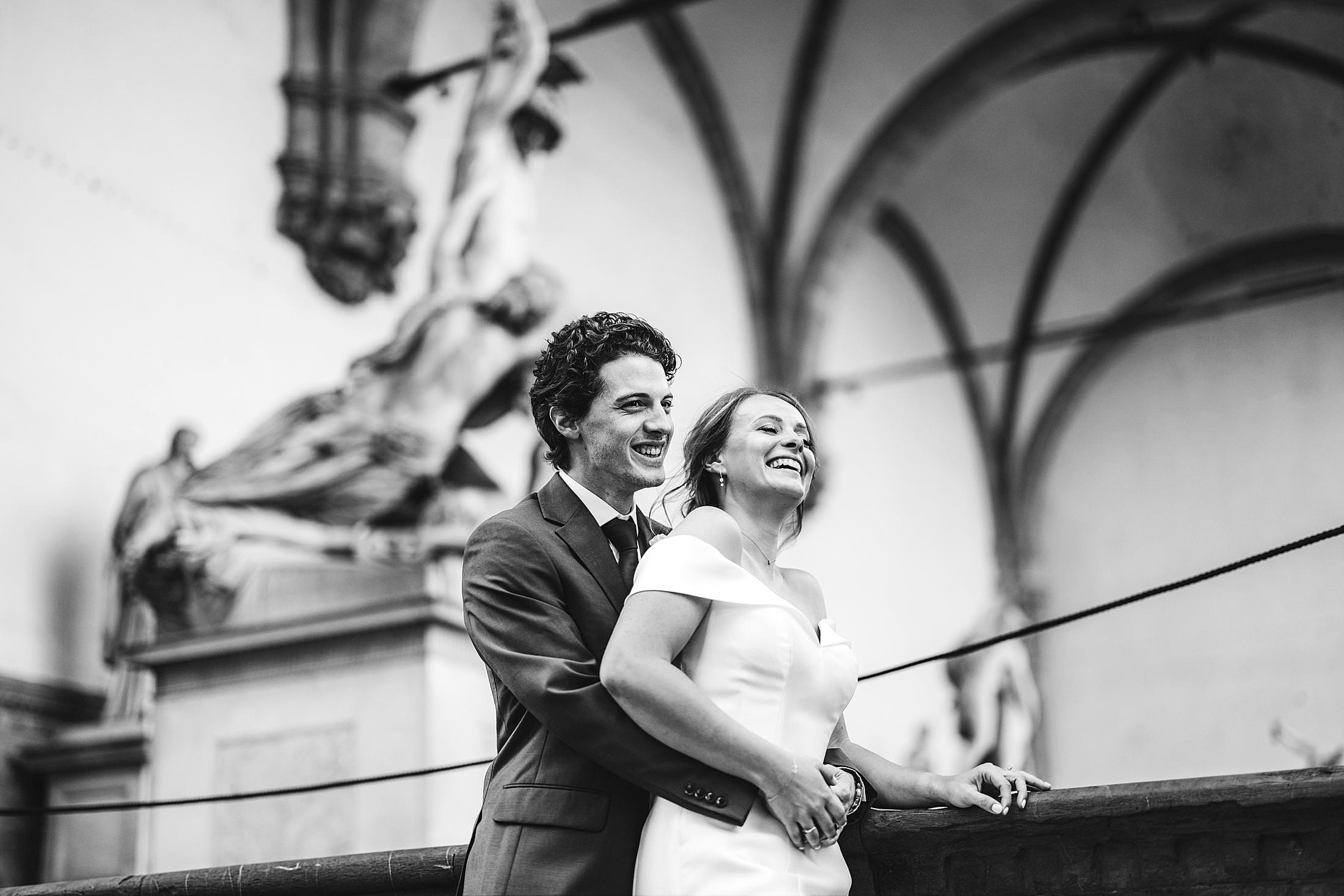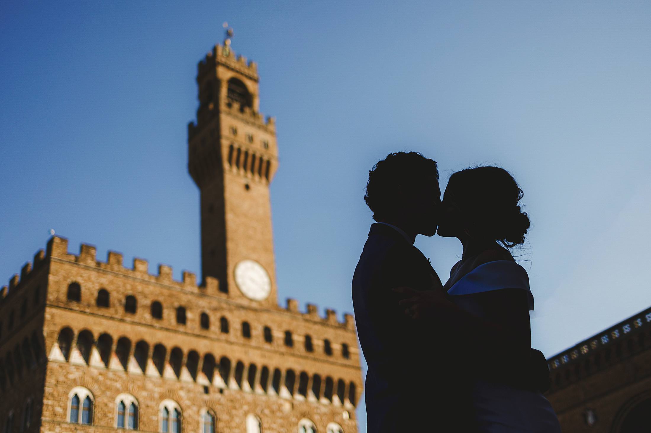 Exciting and romantic elopement pictures in Florence streets near Palazzo Vecchio. Photo by the Italian elegant elopement photographer in Florence Gabriele Fani