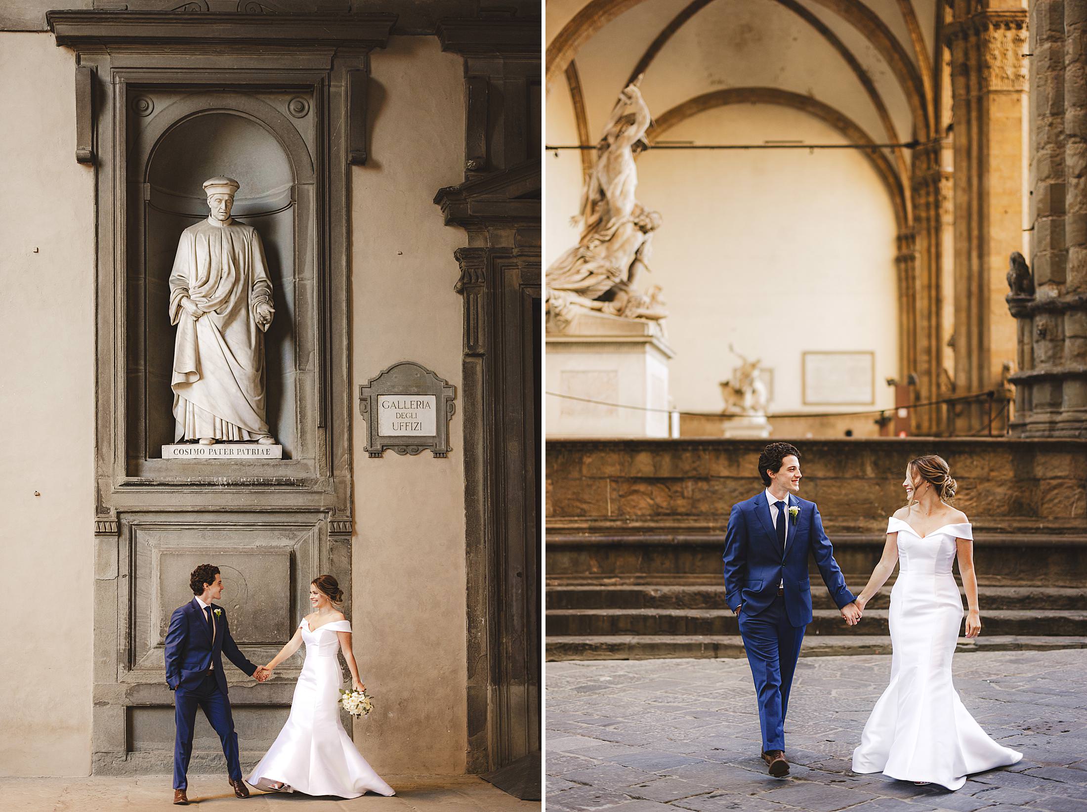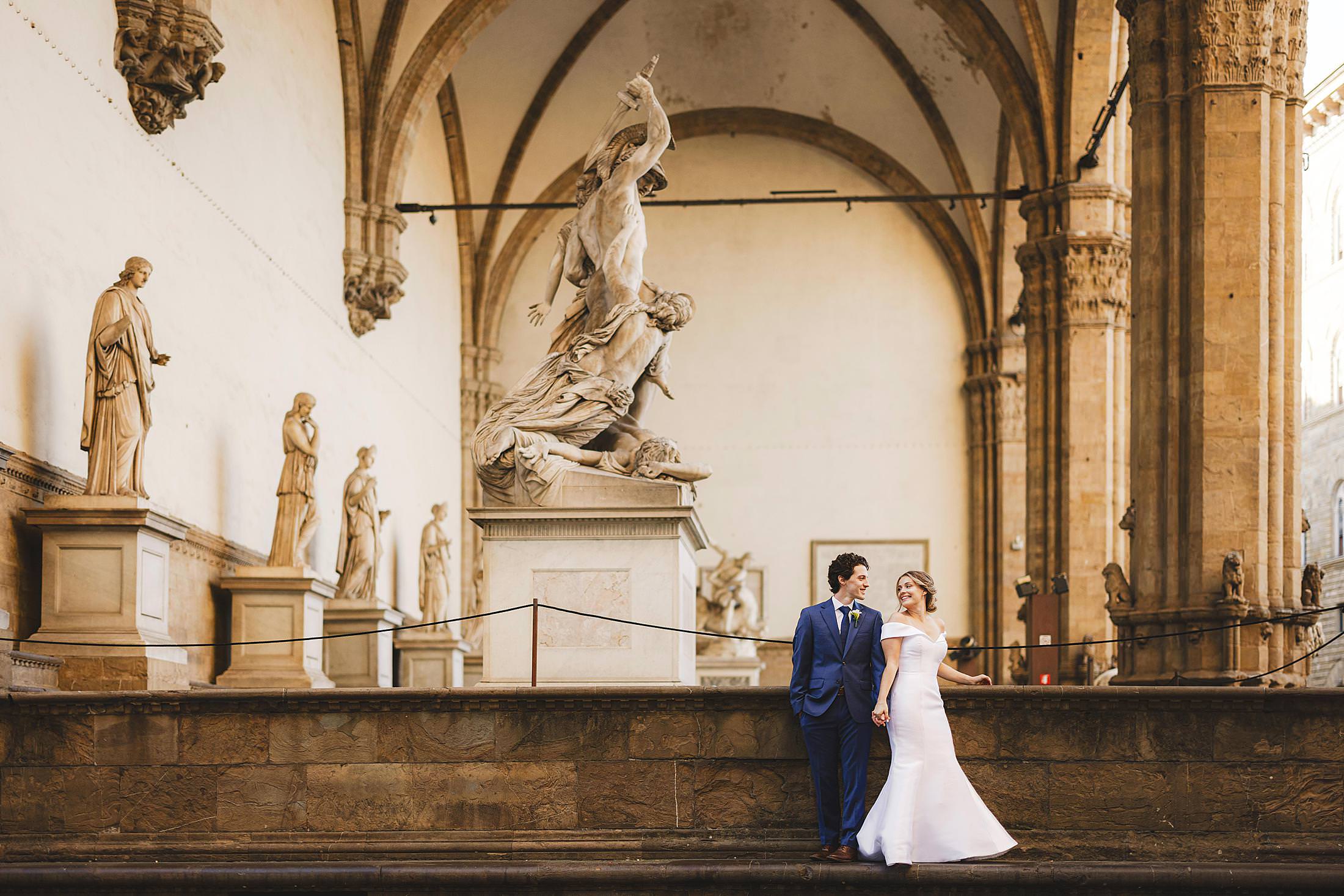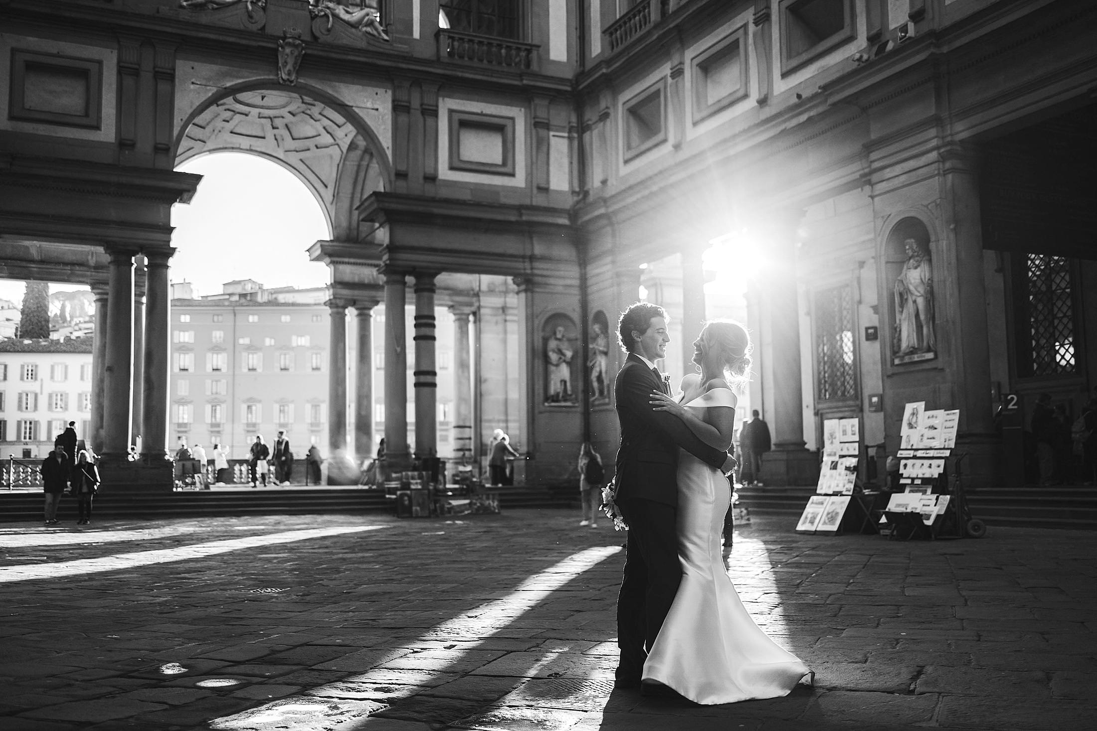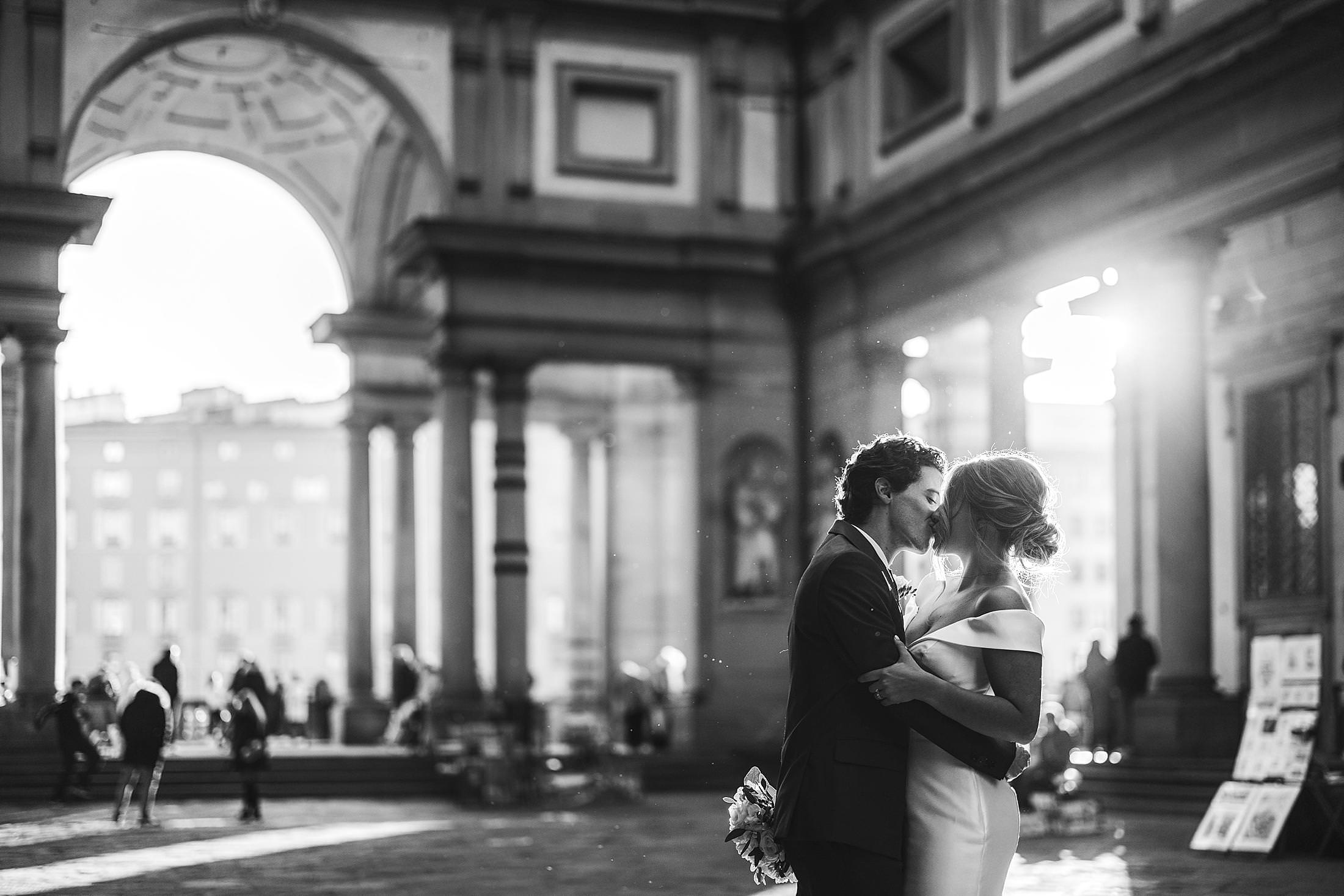 Romantic elopement wedding portrait at Uffizi in the most iconic square of the historic center. Photo by the Italian elegant elopement photographer in Florence Gabriele Fani