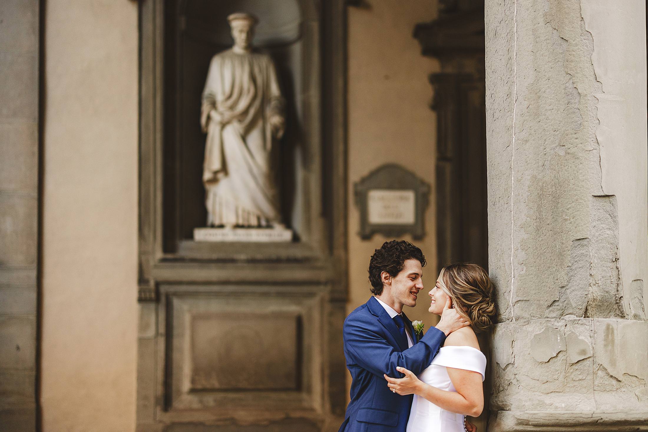 Romantic elopement wedding portrait at Uffizi in the heart of Florence historic center. Photo by the Italian elegant elopement photographer in Florence Gabriele Fani