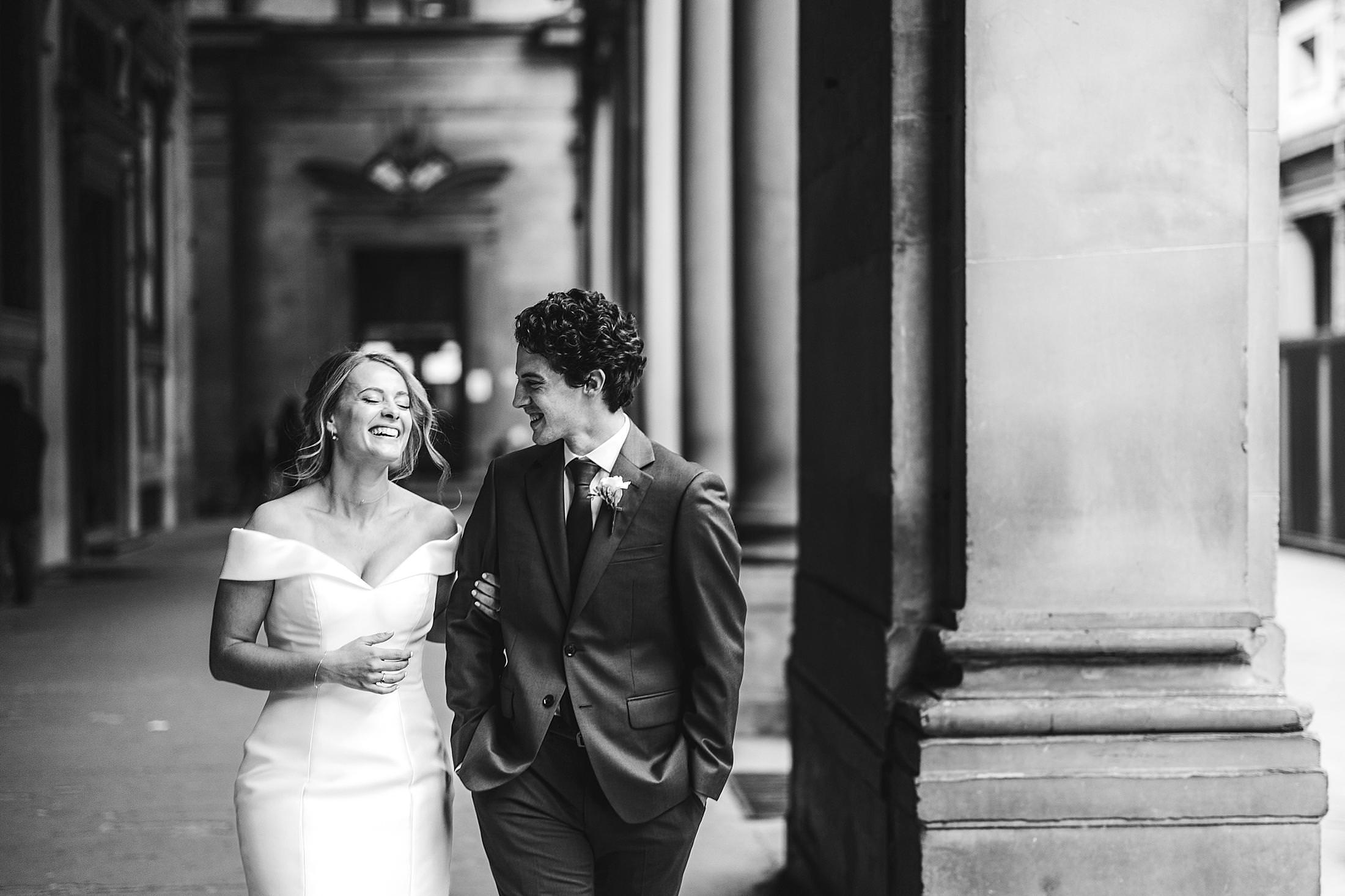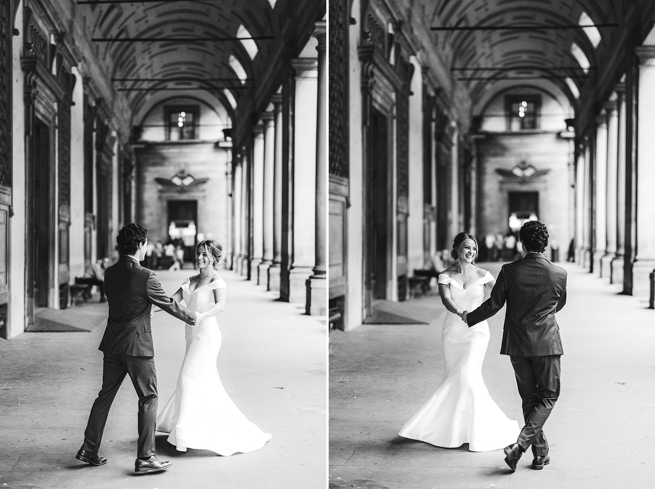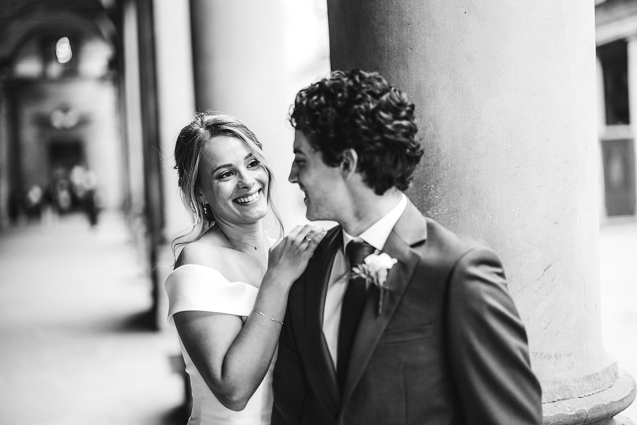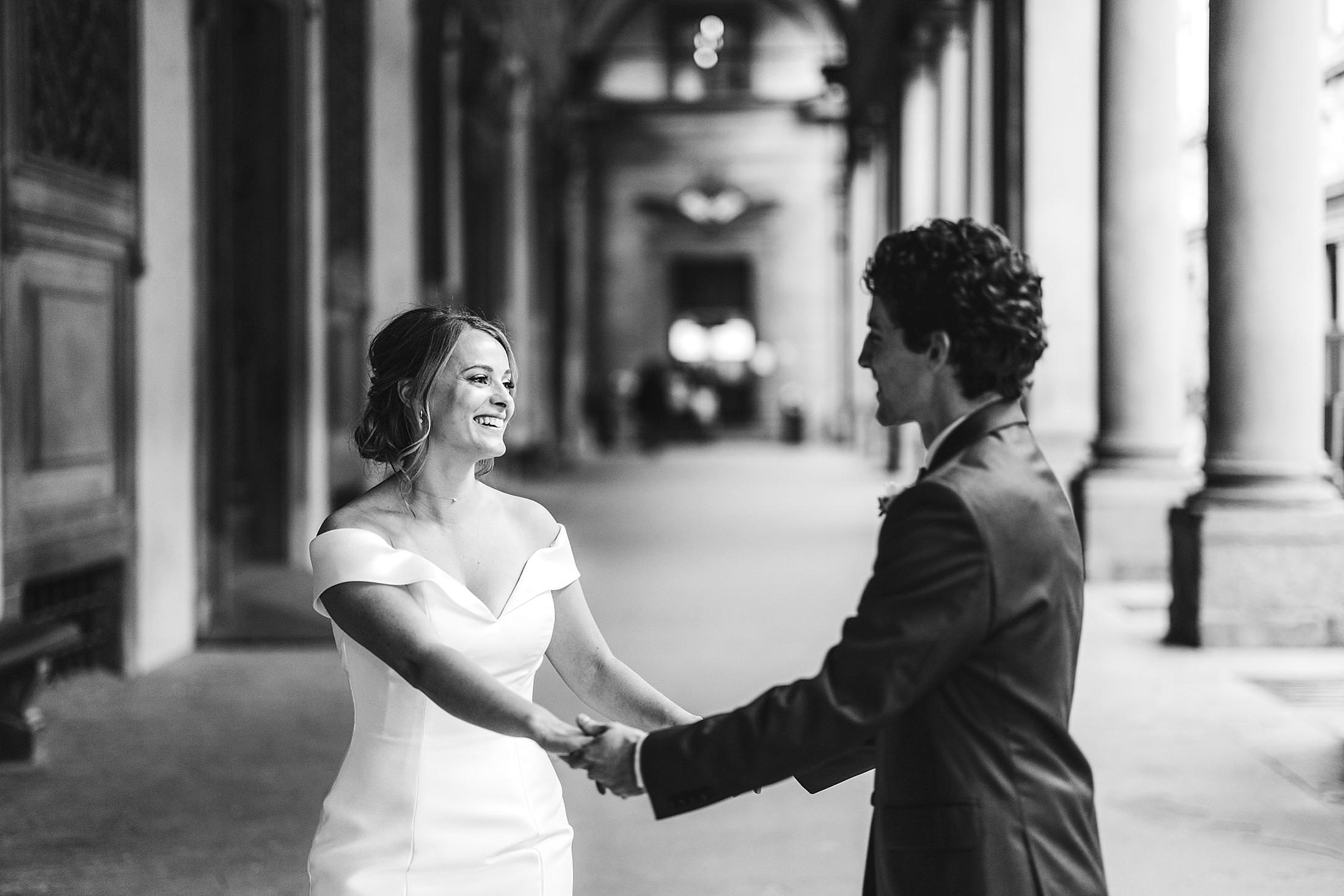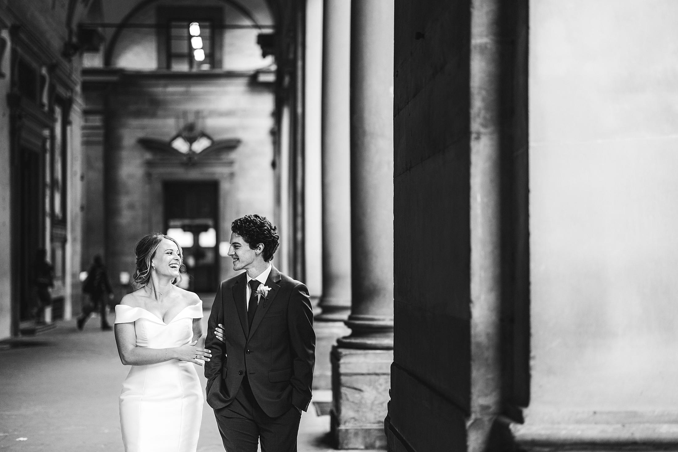 Lovely candid and spontaneous elopement wedding photos at Uffizi archway in the heart of historic center. Photo by the Italian elegant elopement photographer in Florence Gabriele Fani