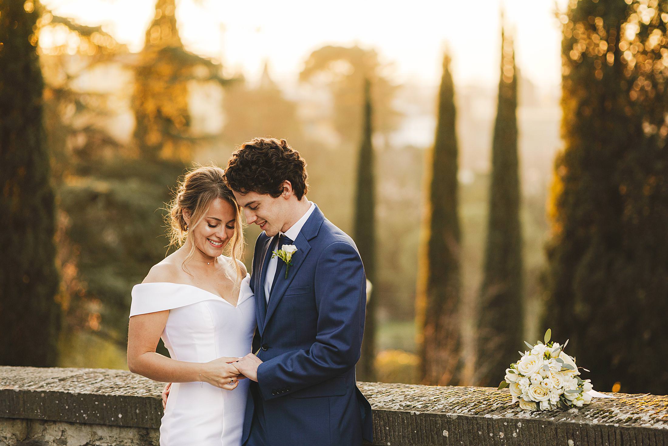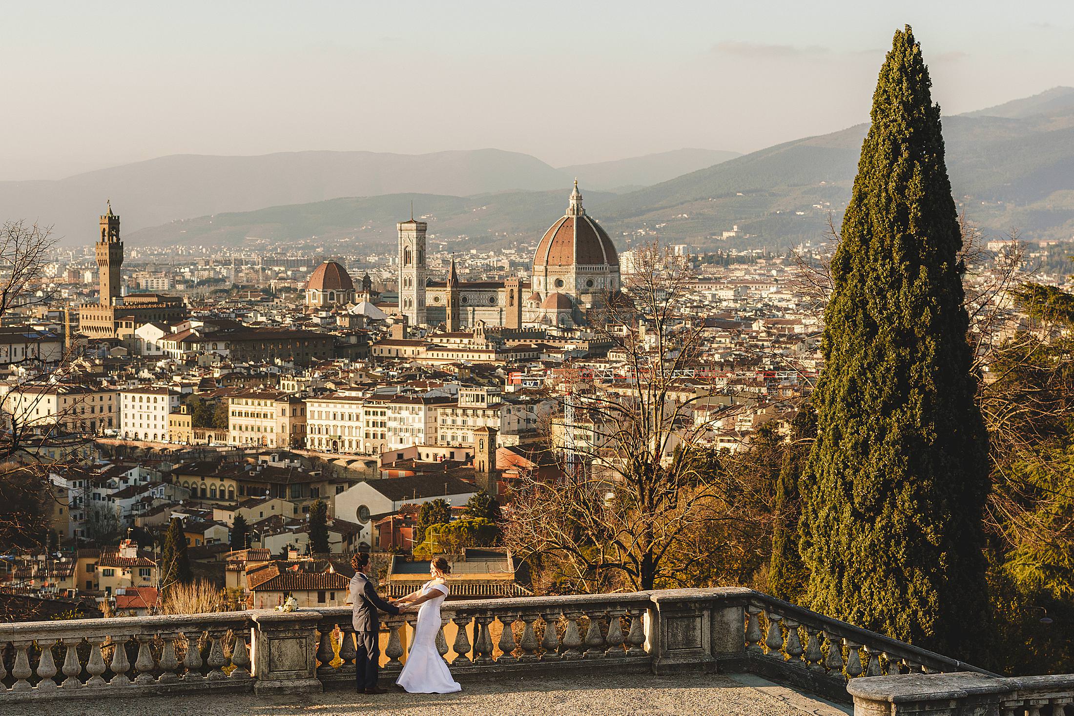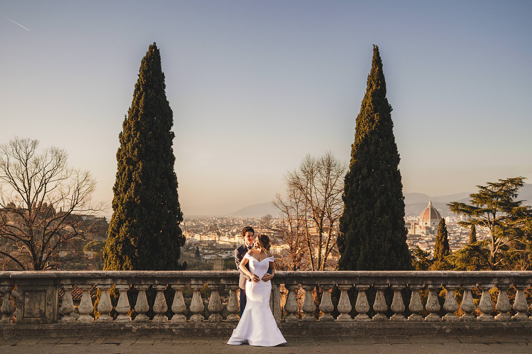 Golden hour elopement wedding photo in Florence panoramic location. Photo by the Italian elegant elopement photographer in Florence Gabriele Fani