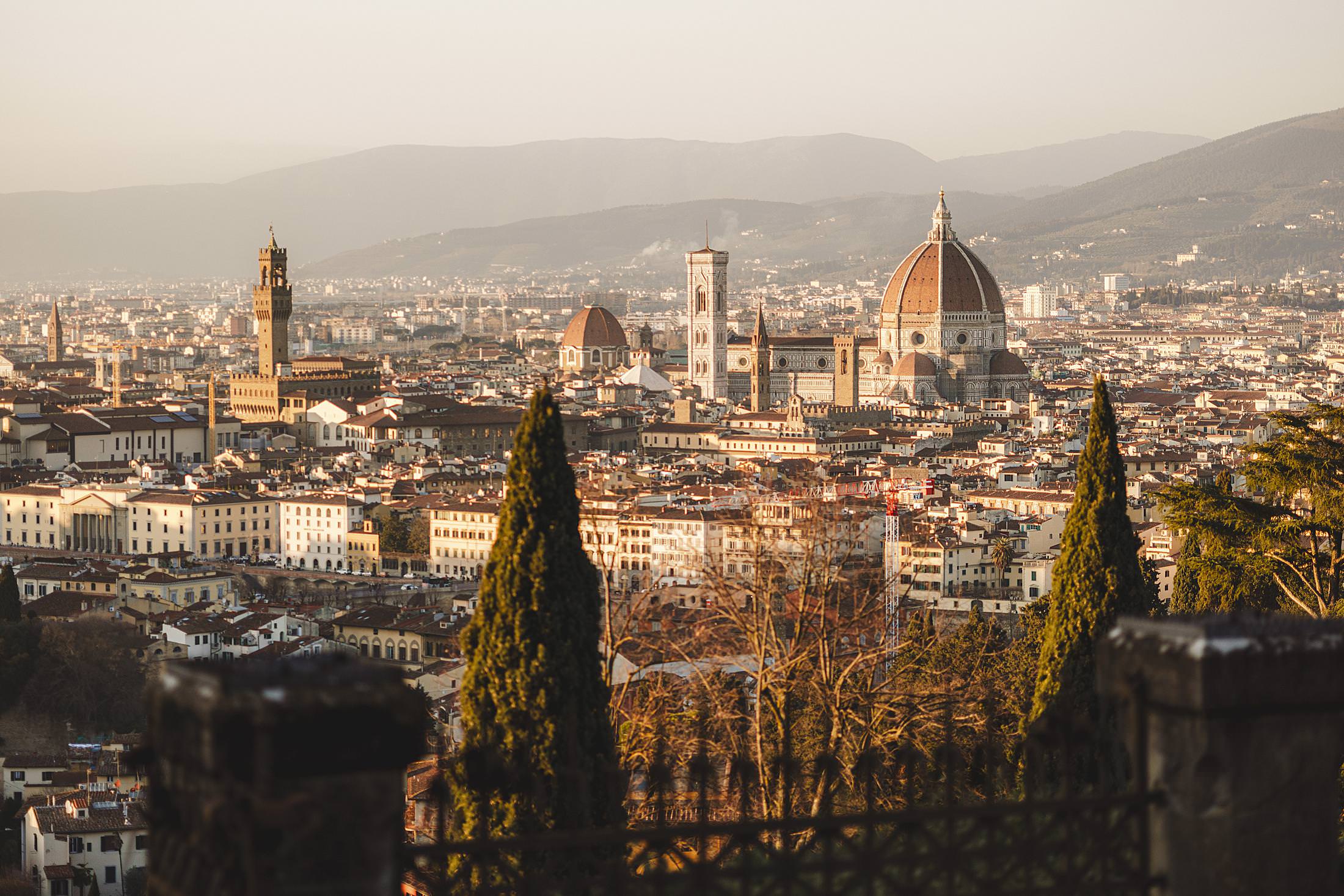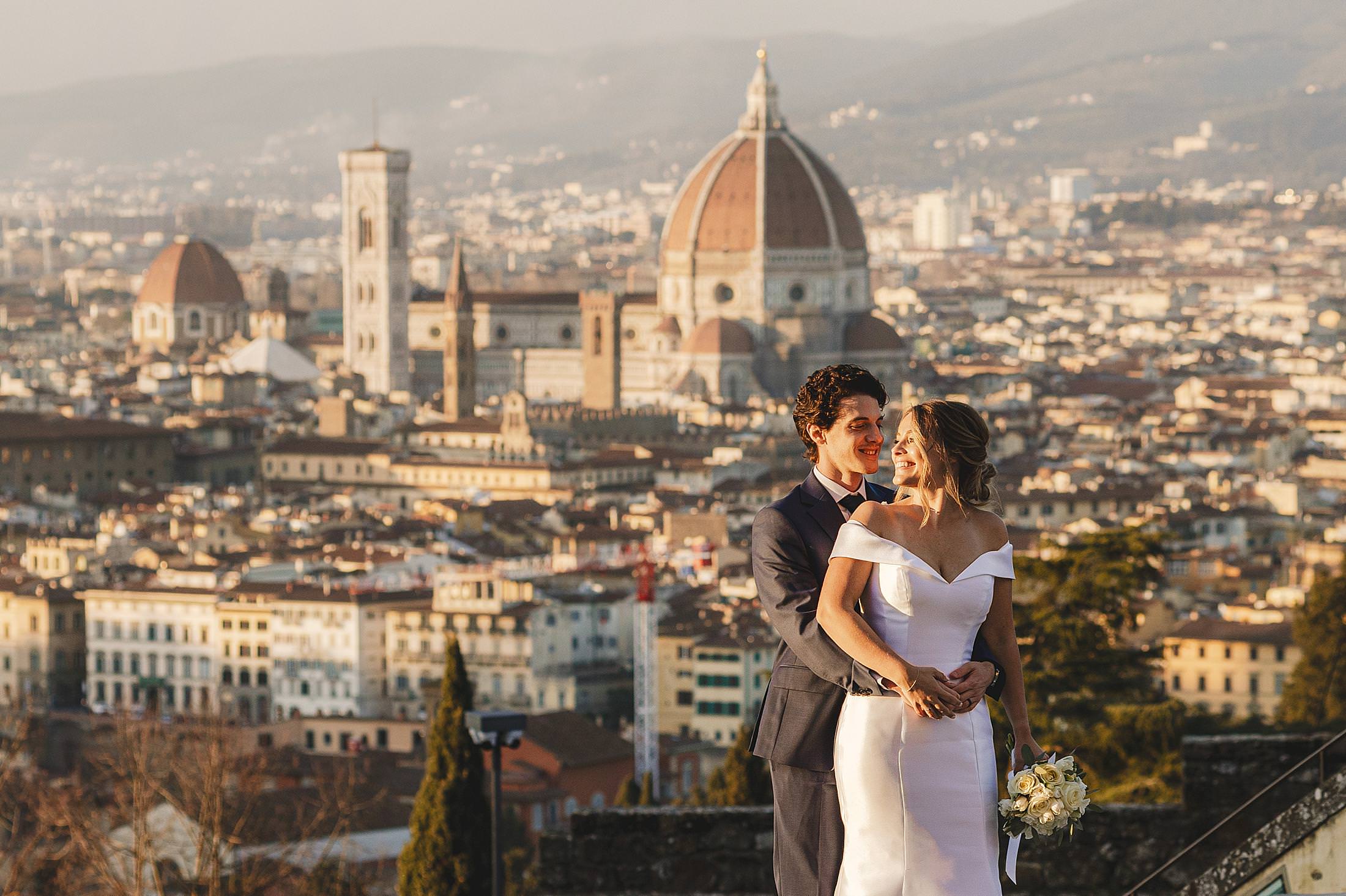 Following their private celebration, we explored the city for a series of elopement pictures highlighting Florence’s most iconic locations. We wandered through its historic streets, stopping near the Uffizi Gallery, the Loggia dei Lanzi, Ponte Vecchio and, it goes without saying, the majestic Duomo itself. For the final part of the photo shoot, we made our way to San Miniato al Monte, a panoramic spot offering sweeping views over Florence. The golden light of the setting sun painted the city in warm hues, creating a dreamy atmosphere: the perfect ending to this romantic elopement.